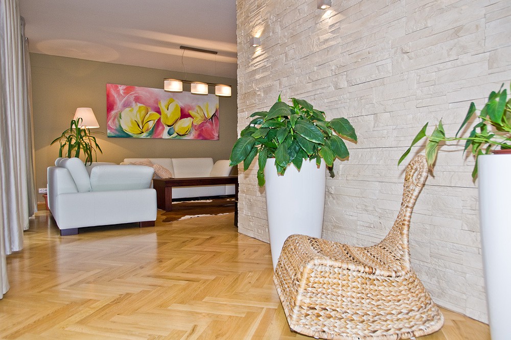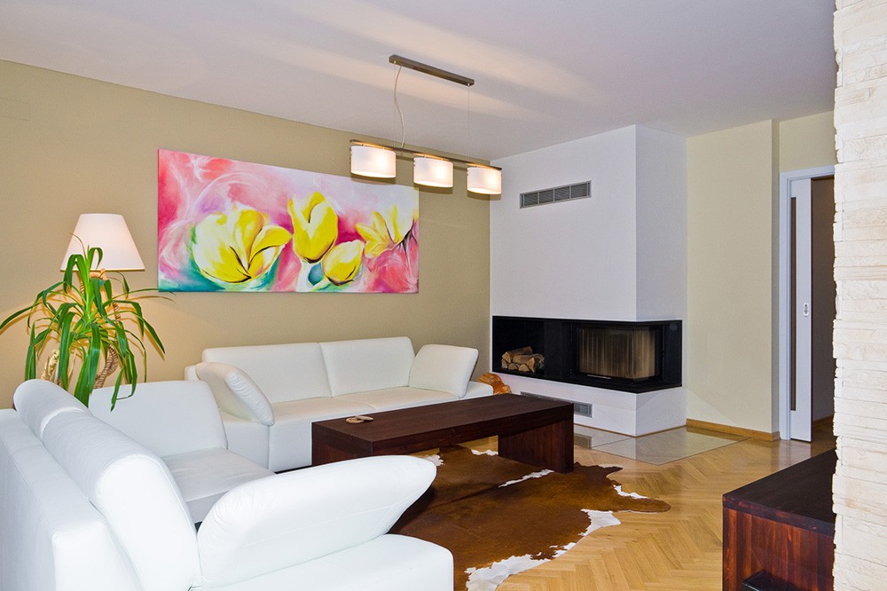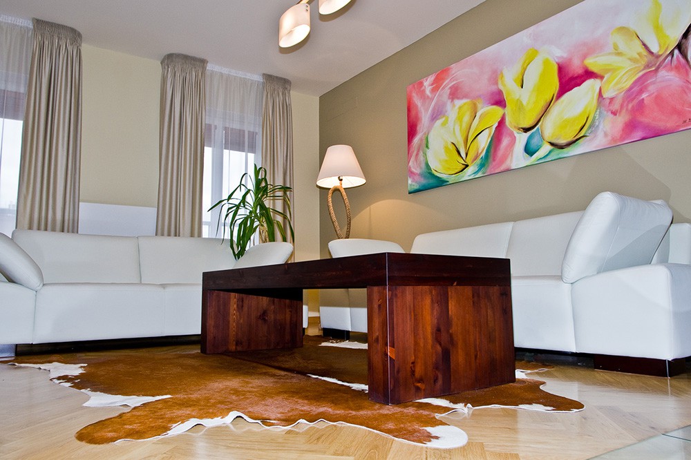 Prostorný a netradičně řešený byt v činžovním domě byl sice po rekonstrukci, přesto si majitelé přáli modernizaci celého interiéru na klíč. Na fotografii je obývací pokoj, jehož dominantou je obraz vytvořený na míru pro klienty s motivem jejich oblíbených květin - tulipánů. Obraz svou barevností vystupuje z jinak neutrálně laděného interiéru. Konferenční stůl na pohled vypadá masivně, ale díky neviditelným kolečkům umístěných v nohách stolu jej hravě posune i dítě. Zajímavá je stojací lampa v rohu místnosti, jejíž stojan je vytvarován z lana.