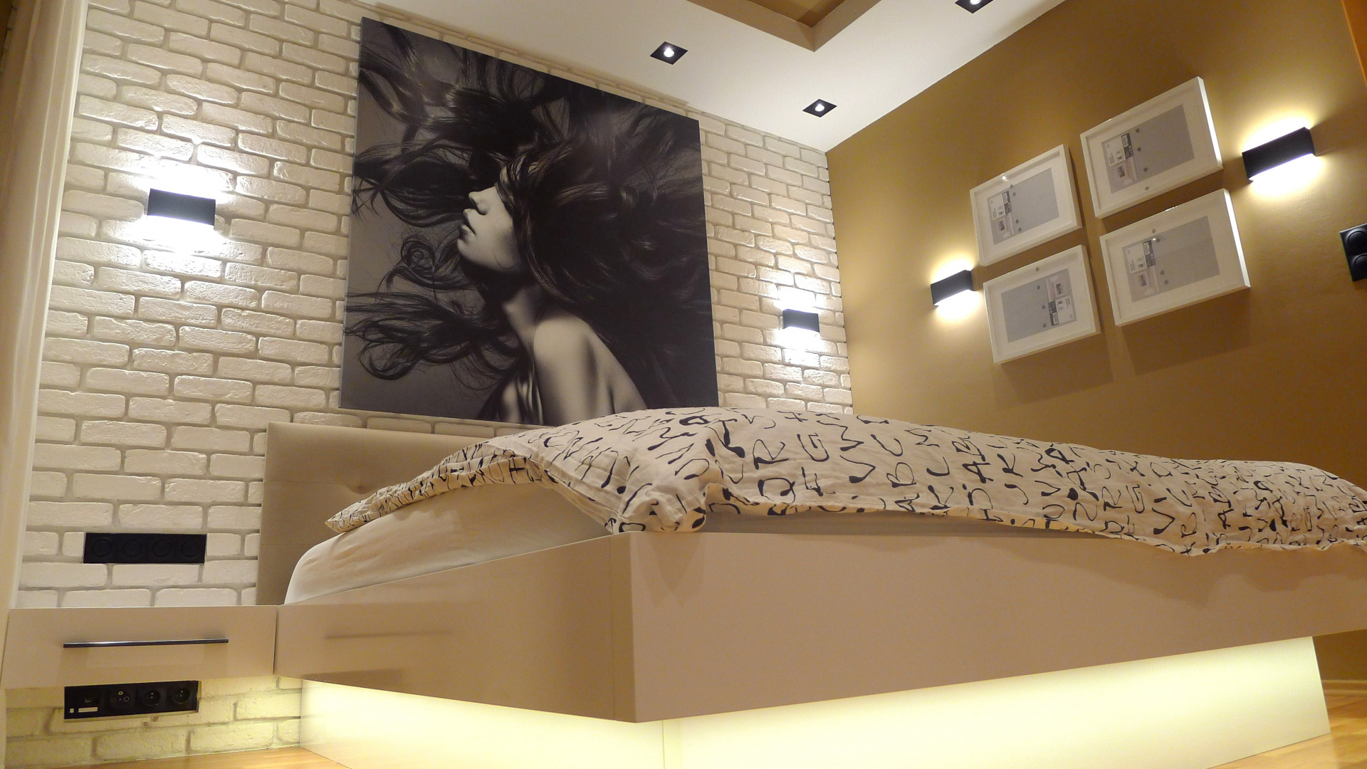 Moderní ložnice pro moderního muže - vypínače v místnosti jsou podsvícené, stejně jako postel. To vše nejen že vytváří příjemnou atmosféru, ale je zároveň praktické. Obraz nad postelí je fotografie vytištěná na plátno od oblíbeného fotografa. Výklopná postel i s čelem je vyrobena na míru.