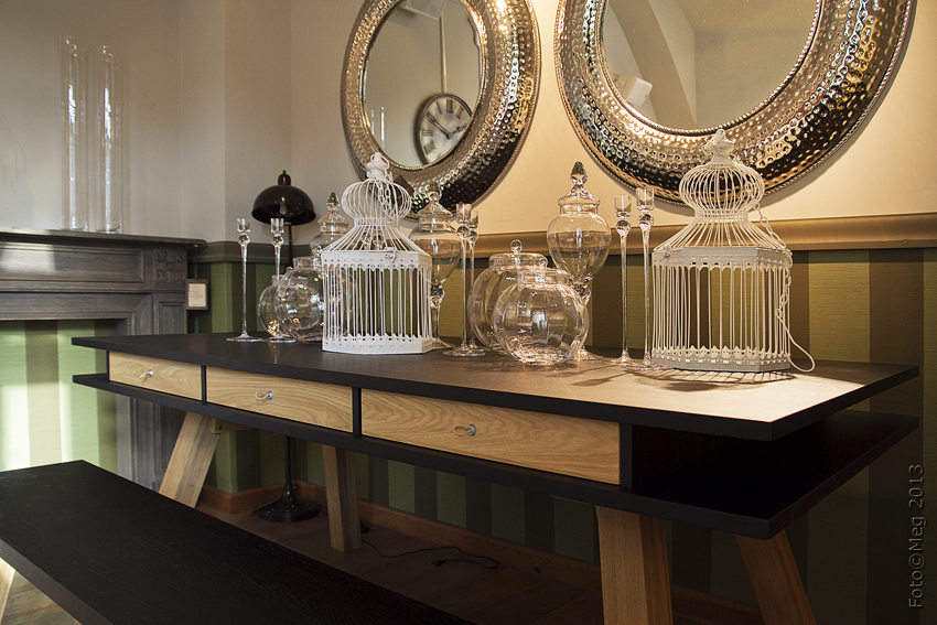 Velmi variabilní stůl využitelný jak do jídelny tak jako pracovní stůl atelierového typu. Stůl má uprostřed otvírací panel na instalaci síťového připojení a šuplíky z obou stran. .