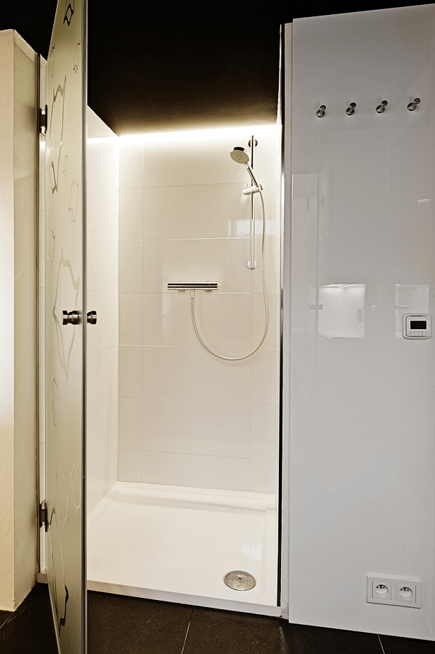 Zóny v mini bytu Prostor byl rozdělen do tří zón odpovídajících různým denním činnostem. První zóna je určena pro spánek, práci a odpočinek. Vzhledem k času, který trávíme v této zóně, jí byla věnována největší část bytu. Druhou a třetí zónu představuje zóna pro vaření a osobní hygienu. Funkčnost jednotlivých zón byla podpořena integrovaným osvětlením, které vytváří zajímavou hru světel. Podsvícení je zabudováno v posteli, kuchyňské lince, cihelné stěně a sprchovém koutu.