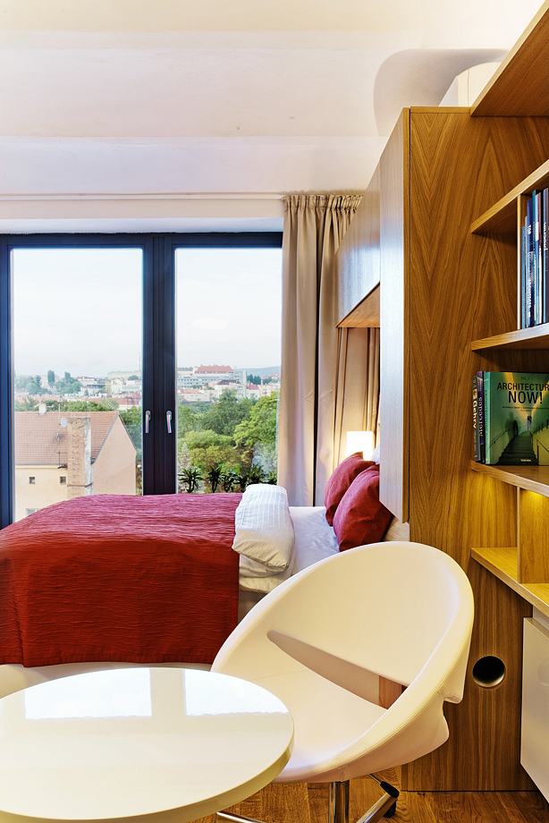 Projekt mini bytu je netradiční především rozlohou rekonstruovaných prostor. Naši architekti pod vedením Adama Rujbra museli vyřešit otázku, jak na 21 m2 vybudovat plně funkční byt. Vybavení bytu bylo proto voleno s ohledem na jeho multifunkčnost. Stolek má málo typickou výškově stavitelnou podnož, která funguje ve spodní poloze jako konferenční stolek a ve vrchní jako stolek jídelní. Tomuto lze přizpůsobit i výškově stavitelná křesílka. Otočením křesílek a vyklopením skryté pracovní desky zpod knihovny rázem vzniknou dvě plnohodnotná pracovní místa. Lednice i pračka jsou ukryté ve skříni v chodbě a to nad sebou.