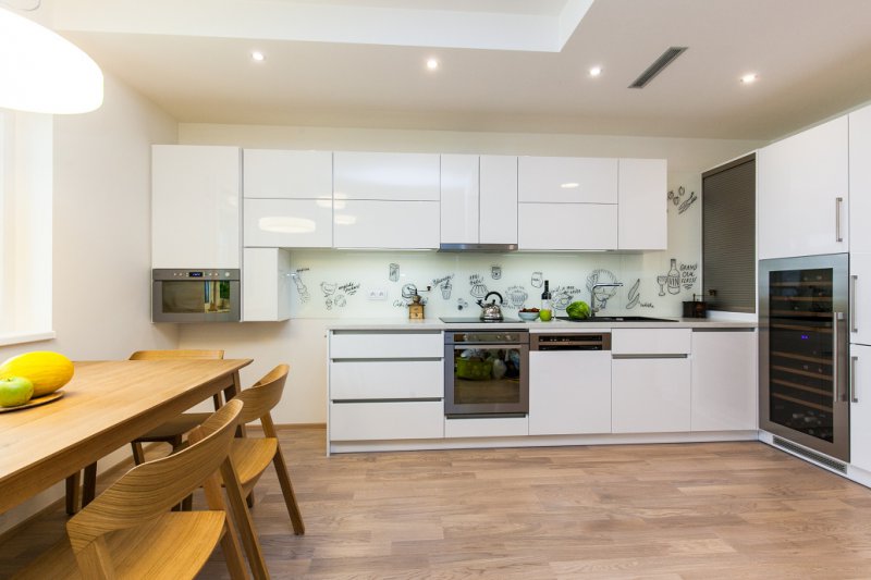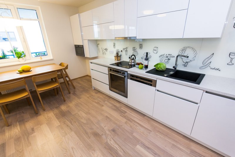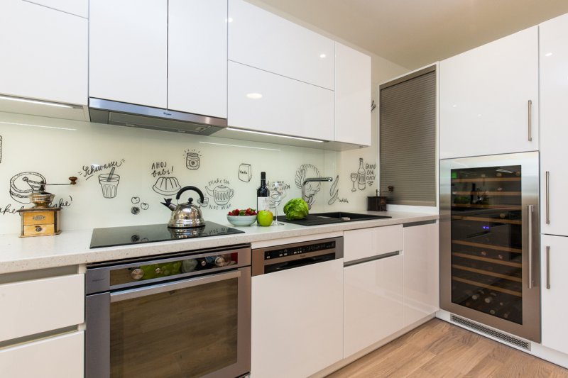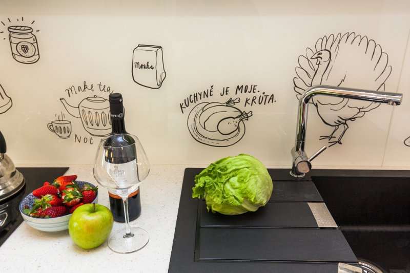 Místo kuchyňský dlaždiček je originální grafika tištěná na skle.
