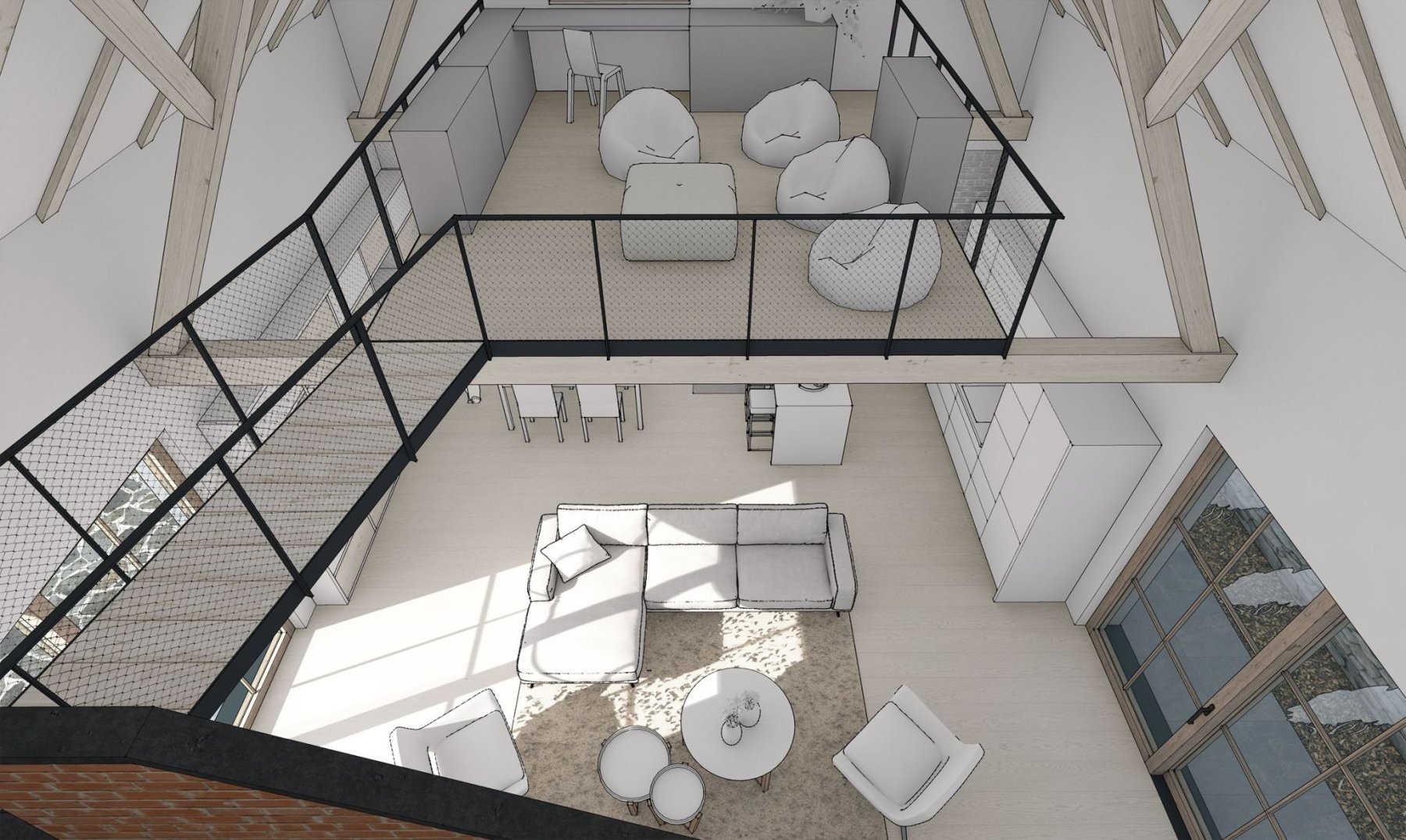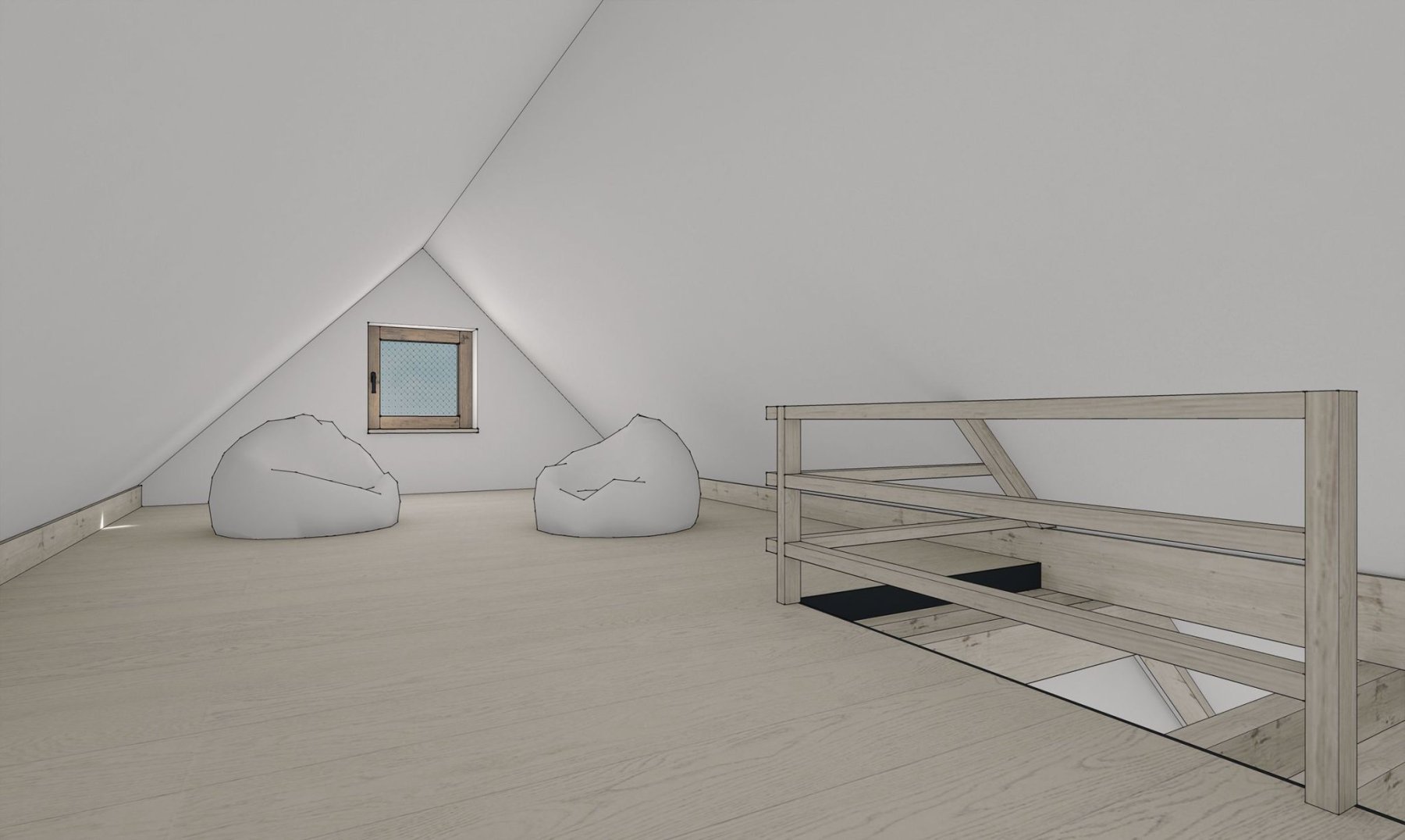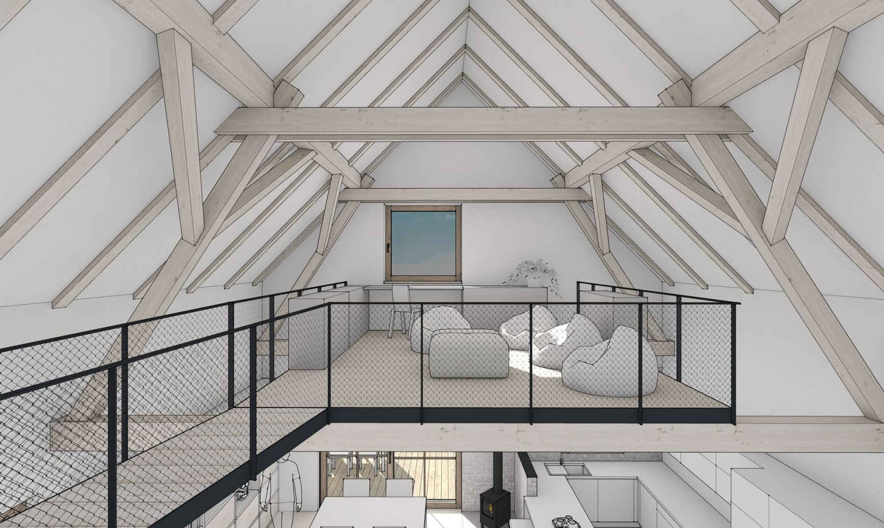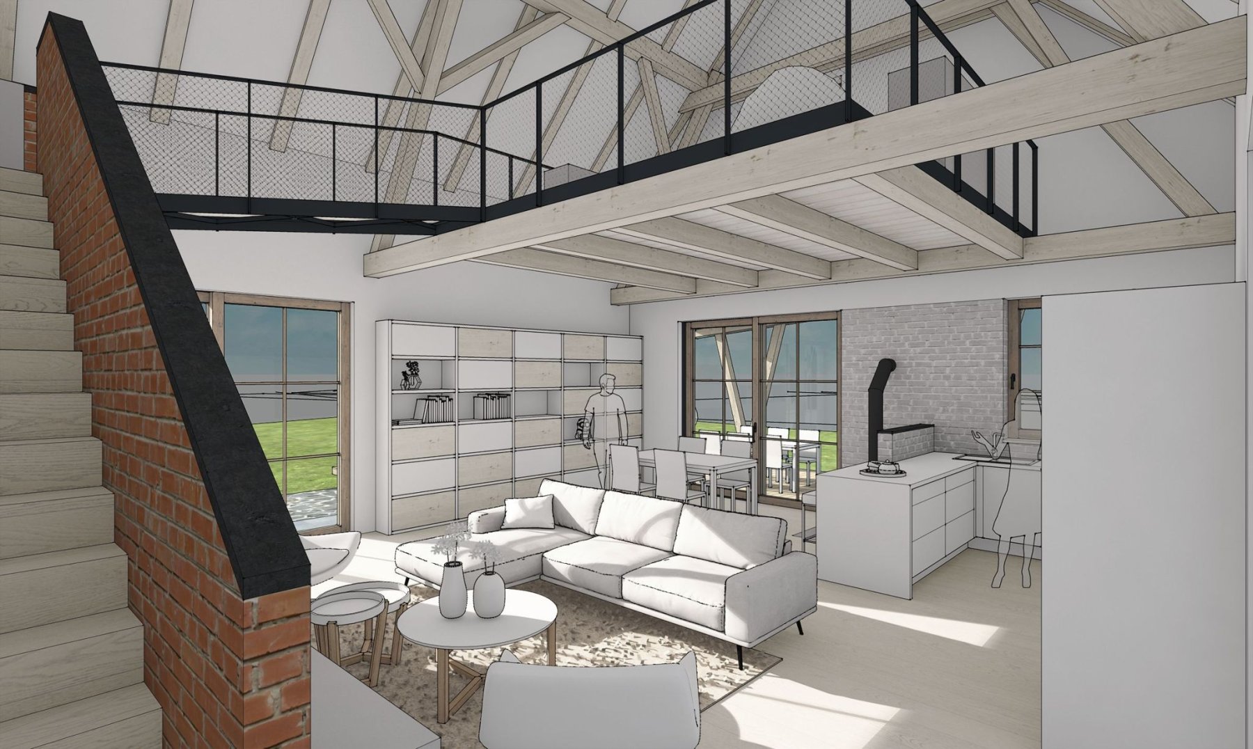 Hlavní obytný prostor je vzdušný, otevřený do krovu. Velkými okny nabízí nádherné výhledy do krajiny, které si můžete vychutnat ze sedačky umístěné v prostoru mezi nimi. Funkčně oddělenou kuchyňskou a jídelní část nalezneme u čela domu. Tam se nachazejí i krbová kamna a vstup na terasu. Nad touto částí je navržena otevřená galerie s posezením a pracovním koutem. Ta je propojená s horním patrem subtilní kovovou lávkou. Protiváhu ke vzdušné obývací části tvoří režná cihlová stěna se schodištěm. Ta nás vede do prvního patra ke dvěma ložnicím a přístupu na galerii. Odtud se také po žebříku dostanete do skrytého prostoru pod štítem domu.