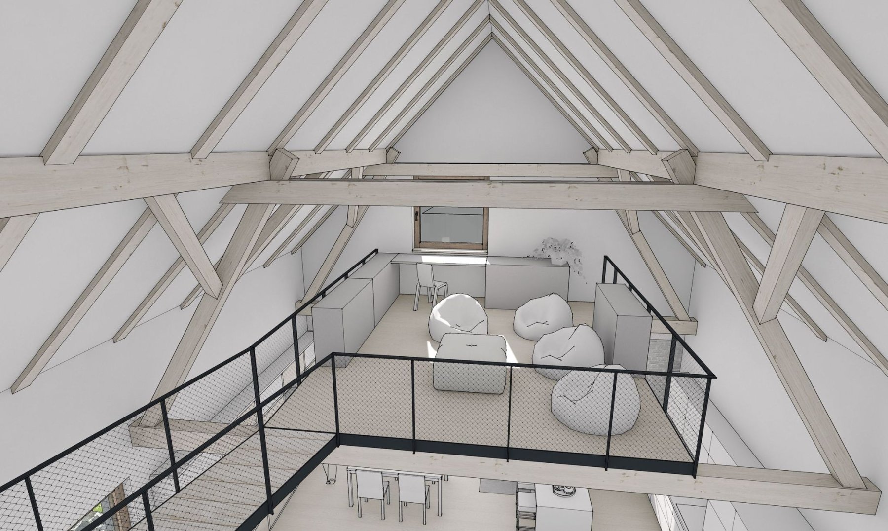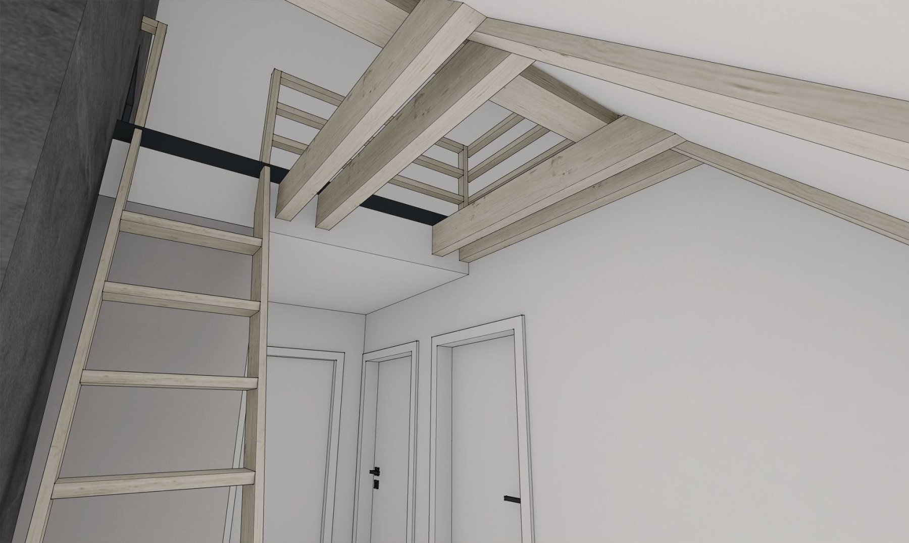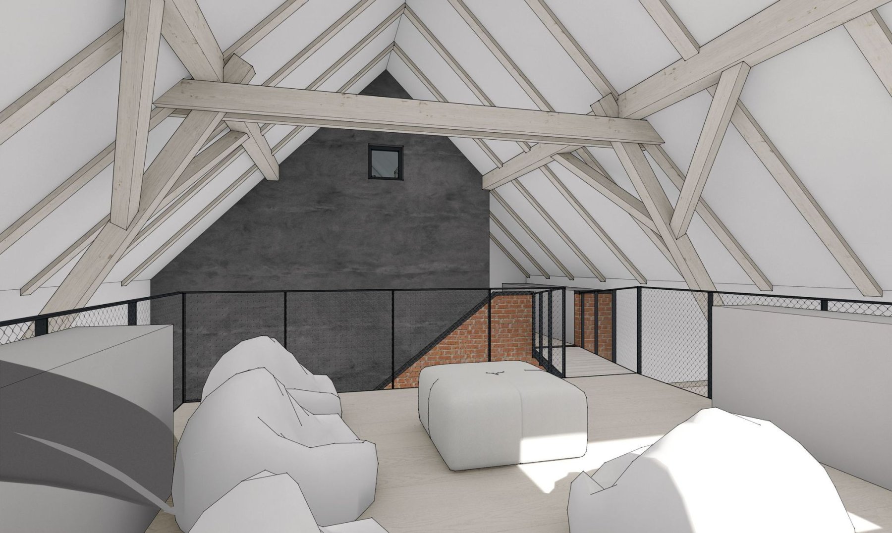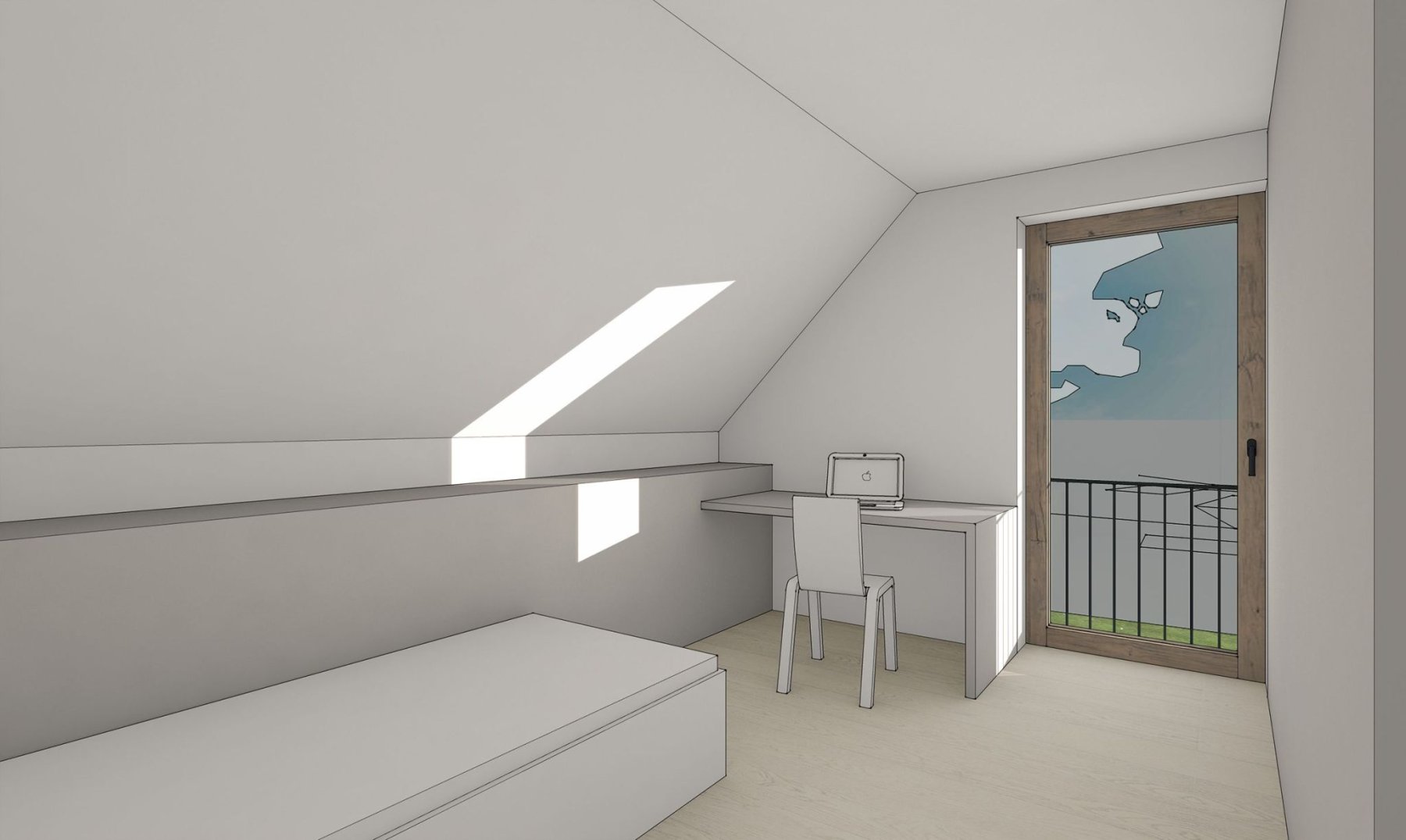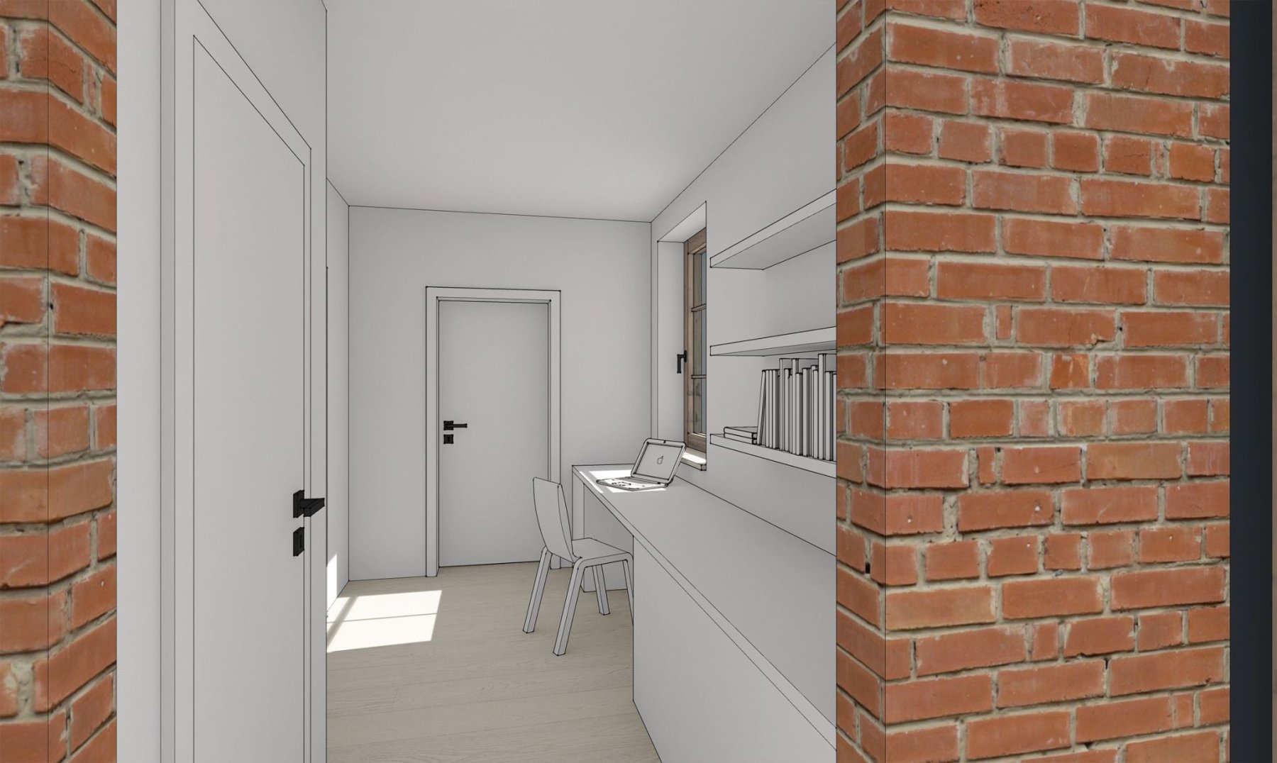 Hlavní obytný prostor je vzdušný, otevřený do krovu. Velkými okny nabízí nádherné výhledy do krajiny, které si můžete vychutnat ze sedačky umístěné v prostoru mezi nimi. Funkčně oddělenou kuchyňskou a jídelní část nalezneme u čela domu. Tam se nachazejí i krbová kamna a vstup na terasu. Nad touto částí je navržena otevřená galerie s posezením a pracovním koutem. Ta je propojená s horním patrem subtilní kovovou lávkou. Protiváhu ke vzdušné obývací části tvoří režná cihlová stěna se schodištěm. Ta nás vede do prvního patra ke dvěma ložnicím a přístupu na galerii. Odtud se také po žebříku dostanete do skrytého prostoru pod štítem domu.