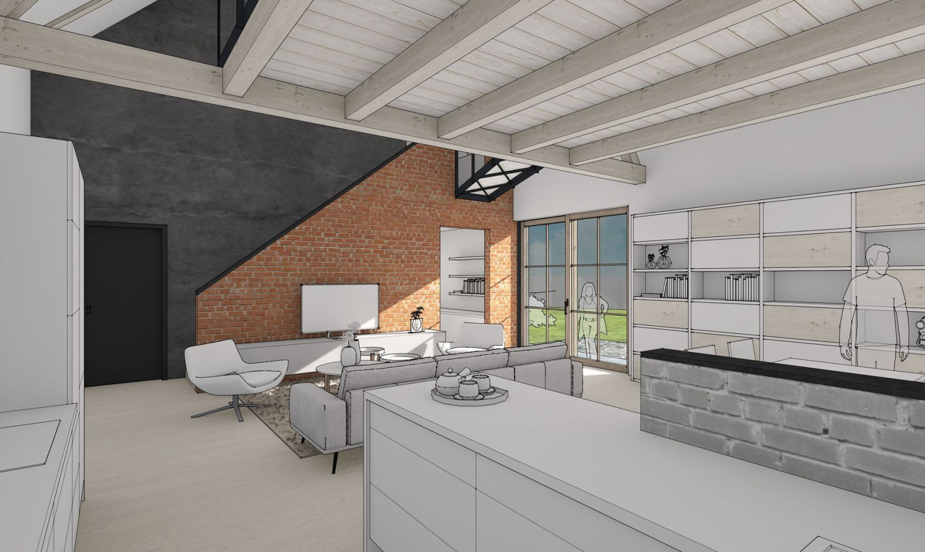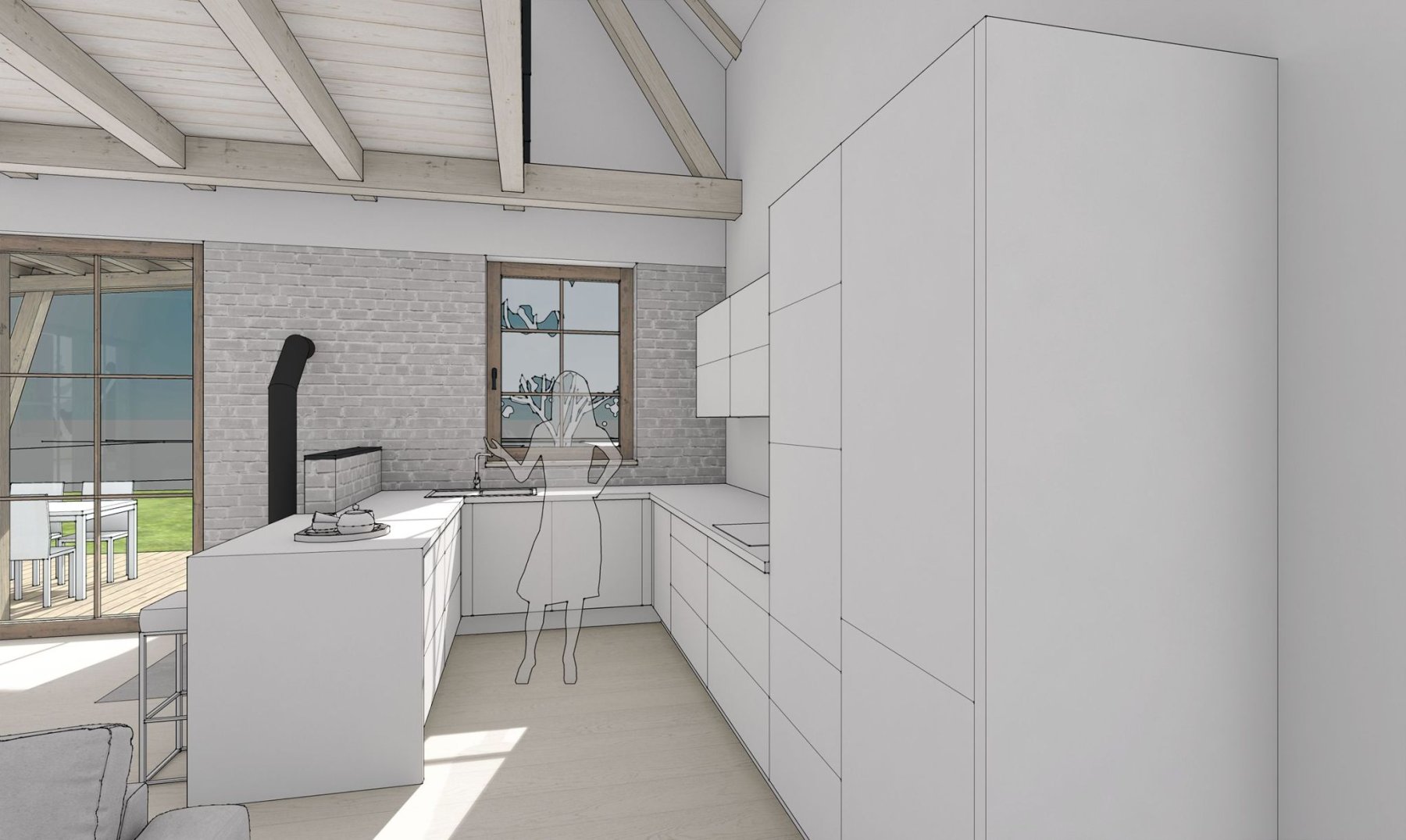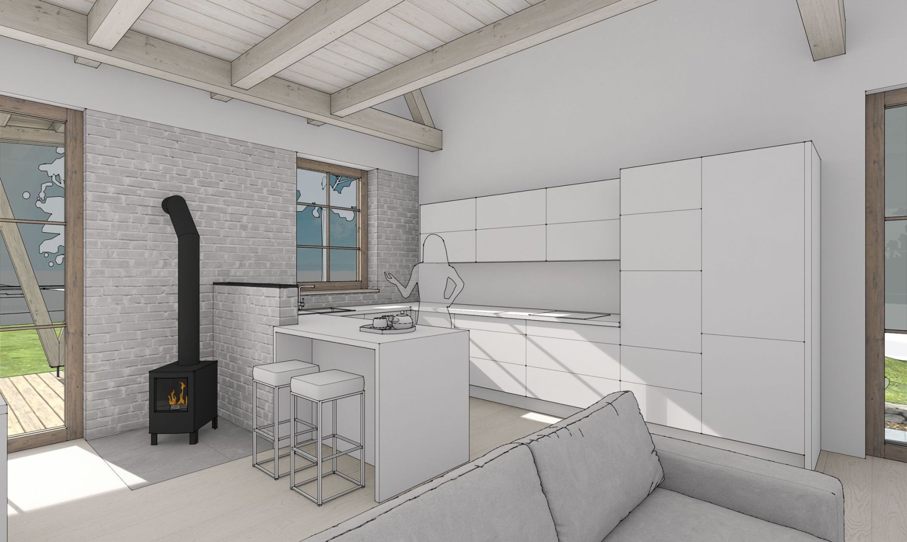 návrh venkovského rodinného domu - obývací prostor s kuchyňským koutem