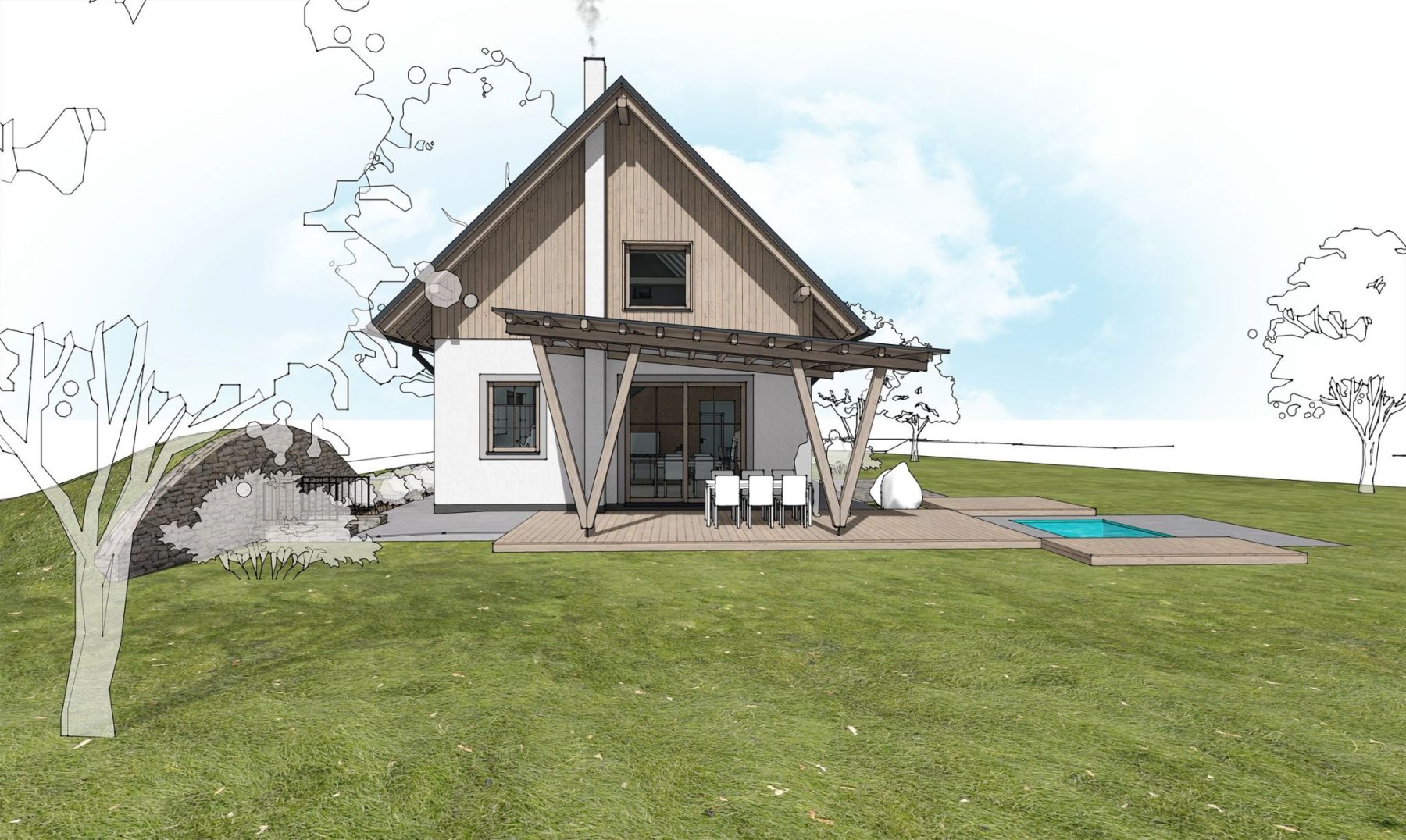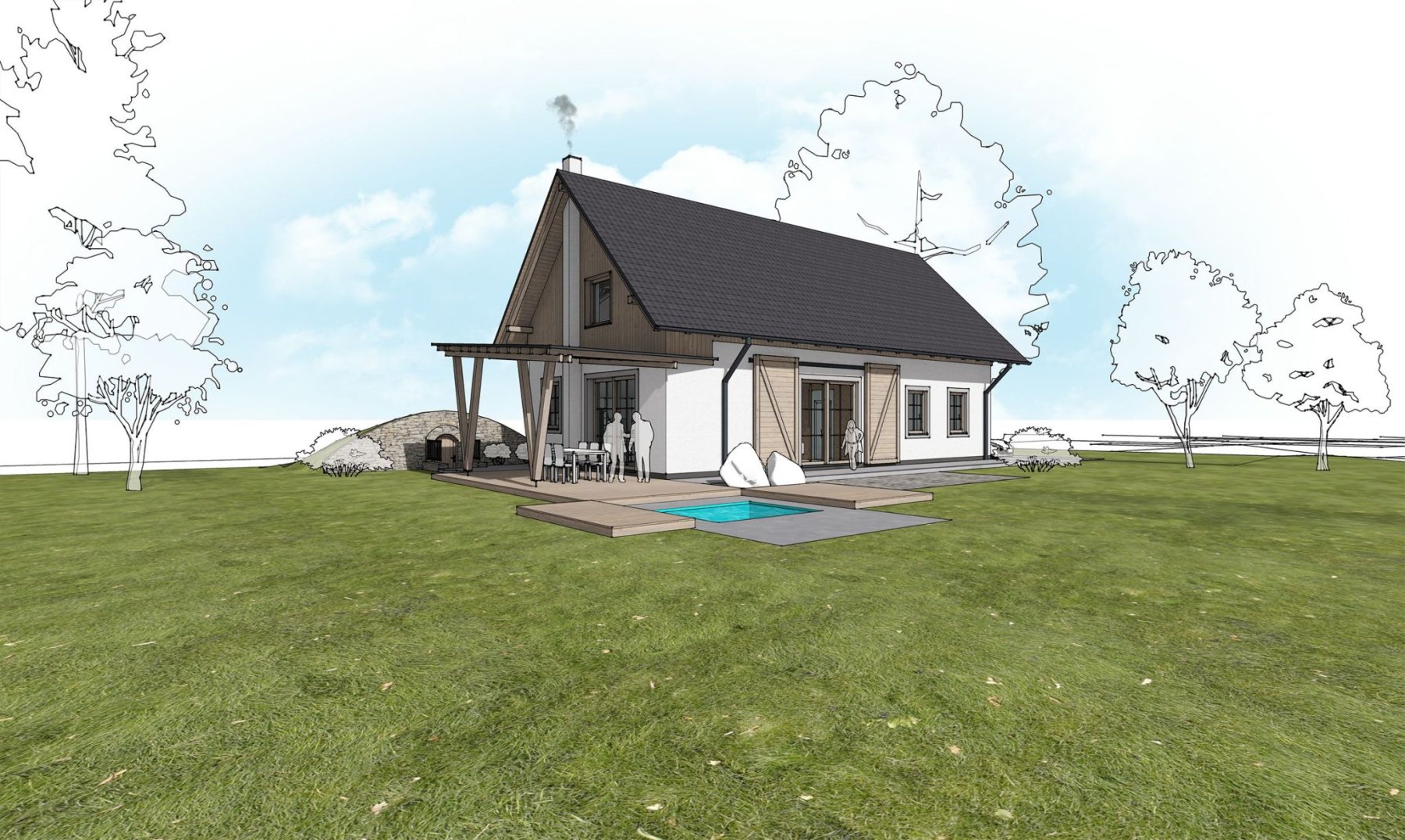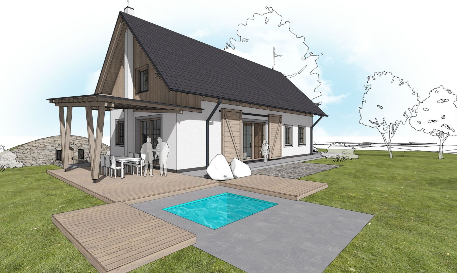 návrh venkovského rodinného domu - jižní pohled od bazénu