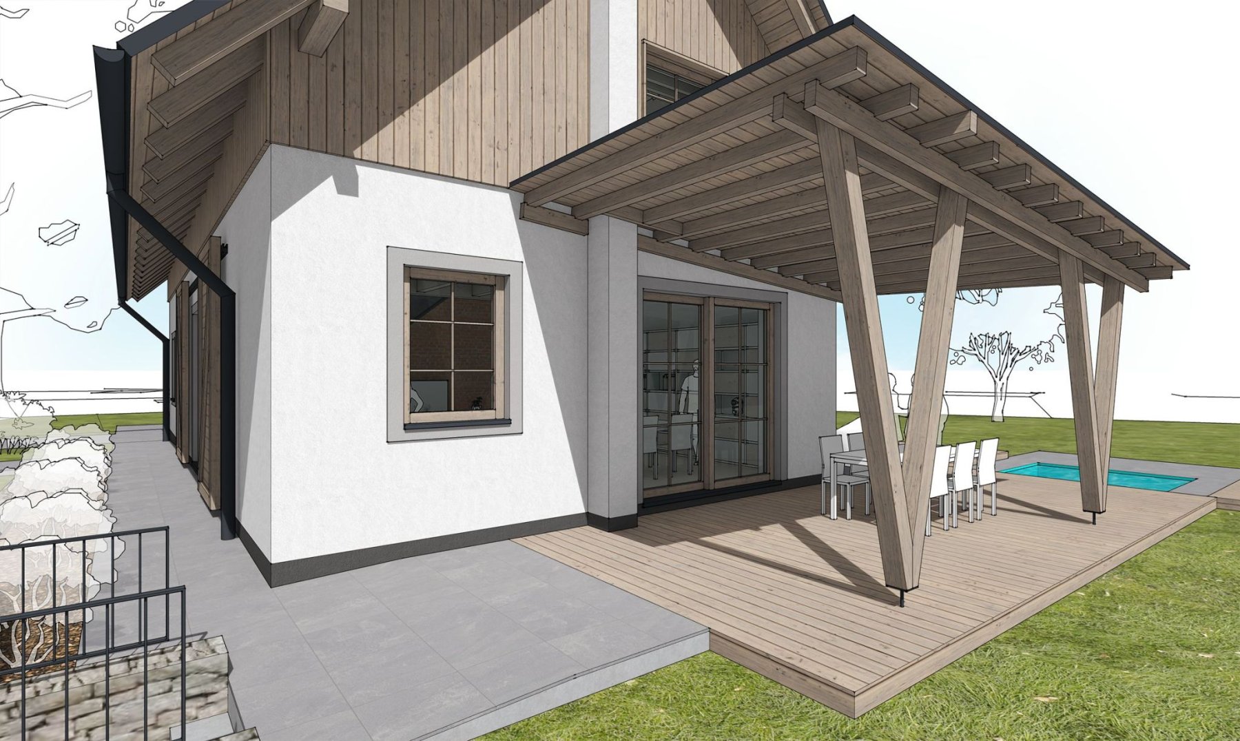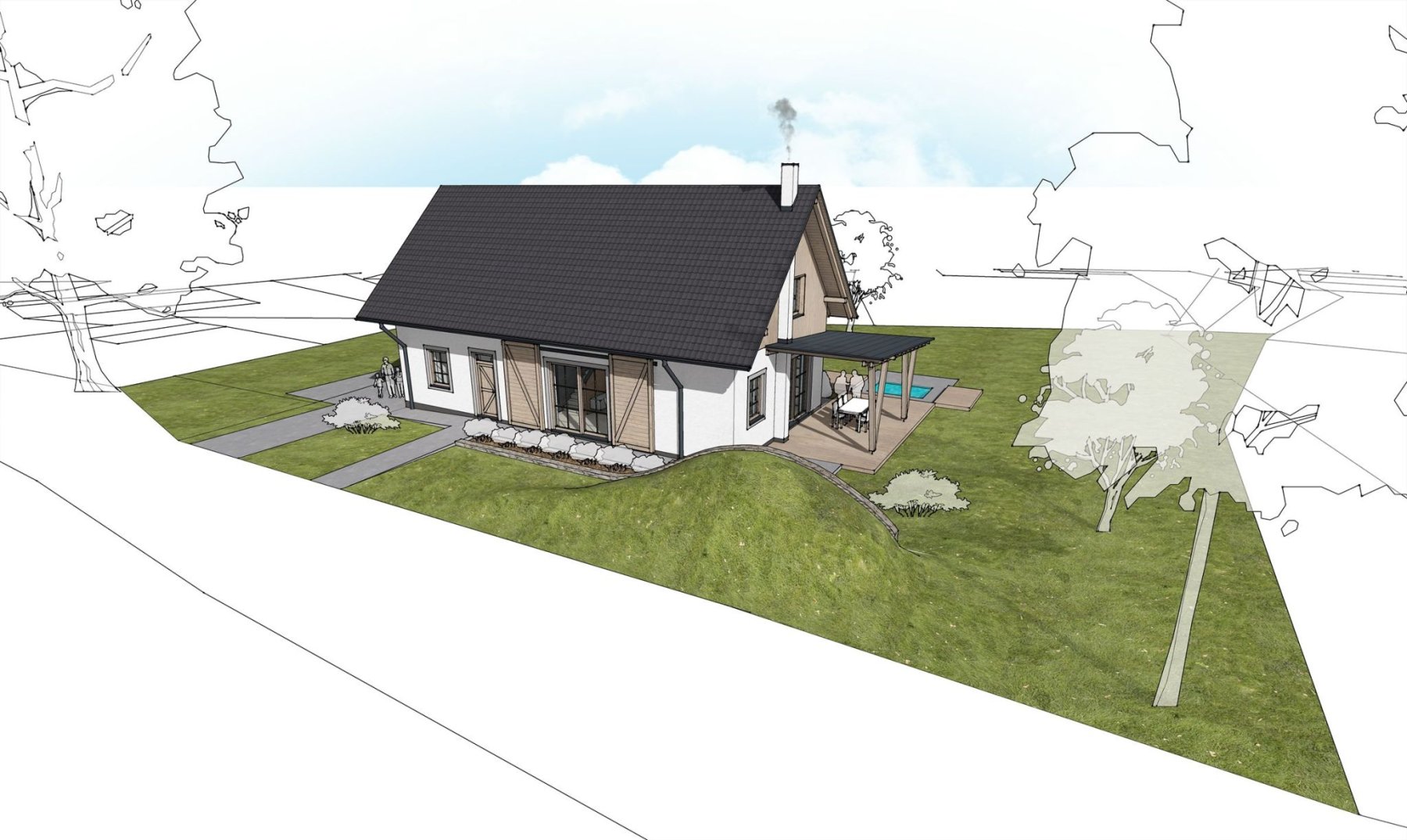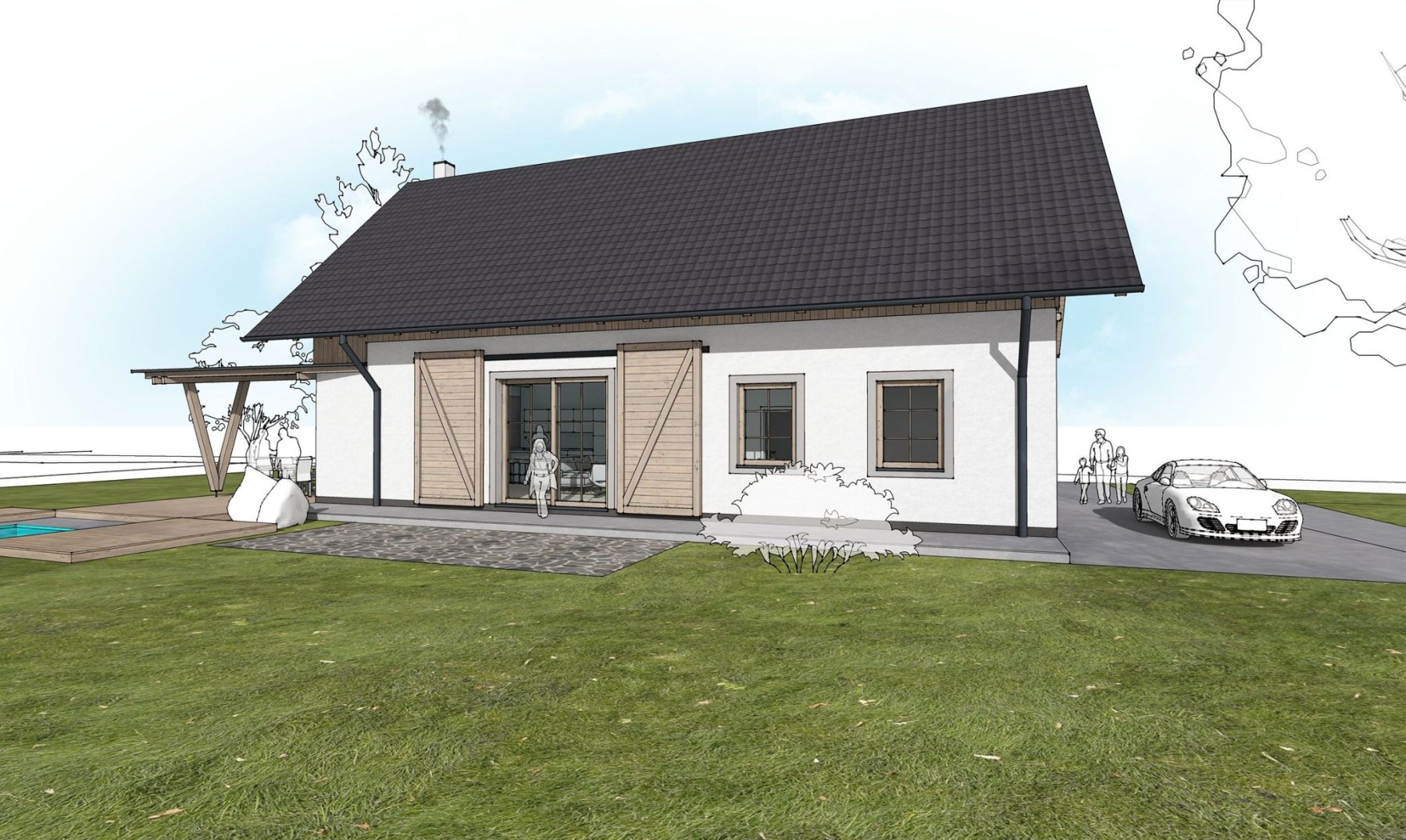 návrh venkovského rodinného domu - jižní pohled od bazénu