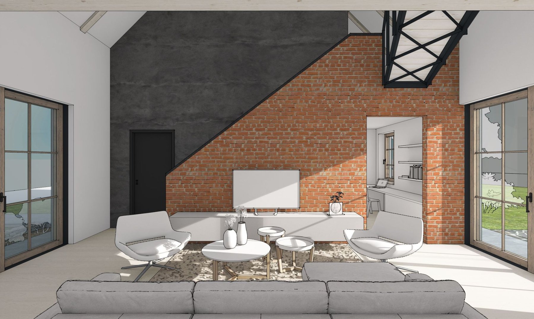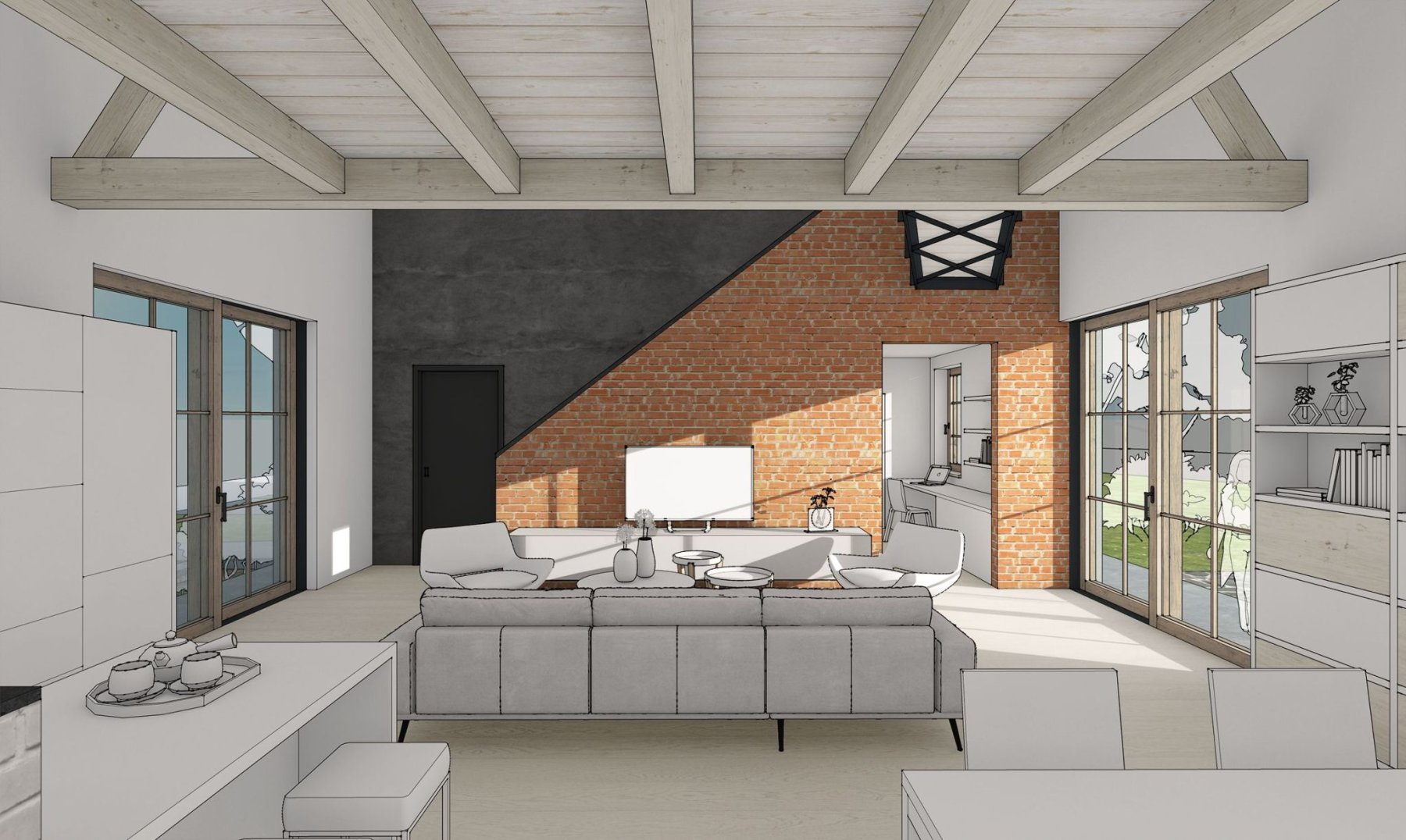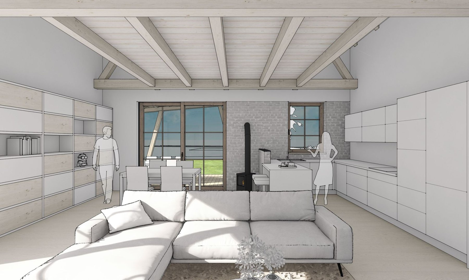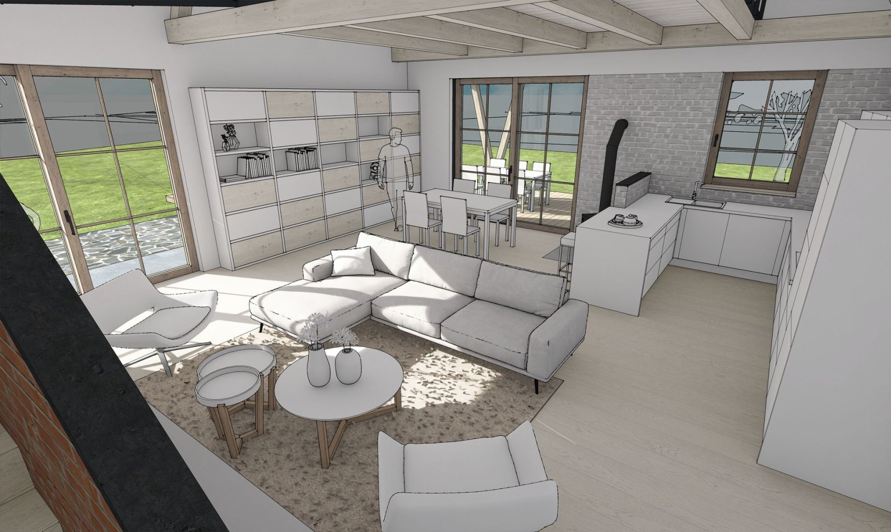 návrh venkovského rodinného domu - pohled na obývací prostor