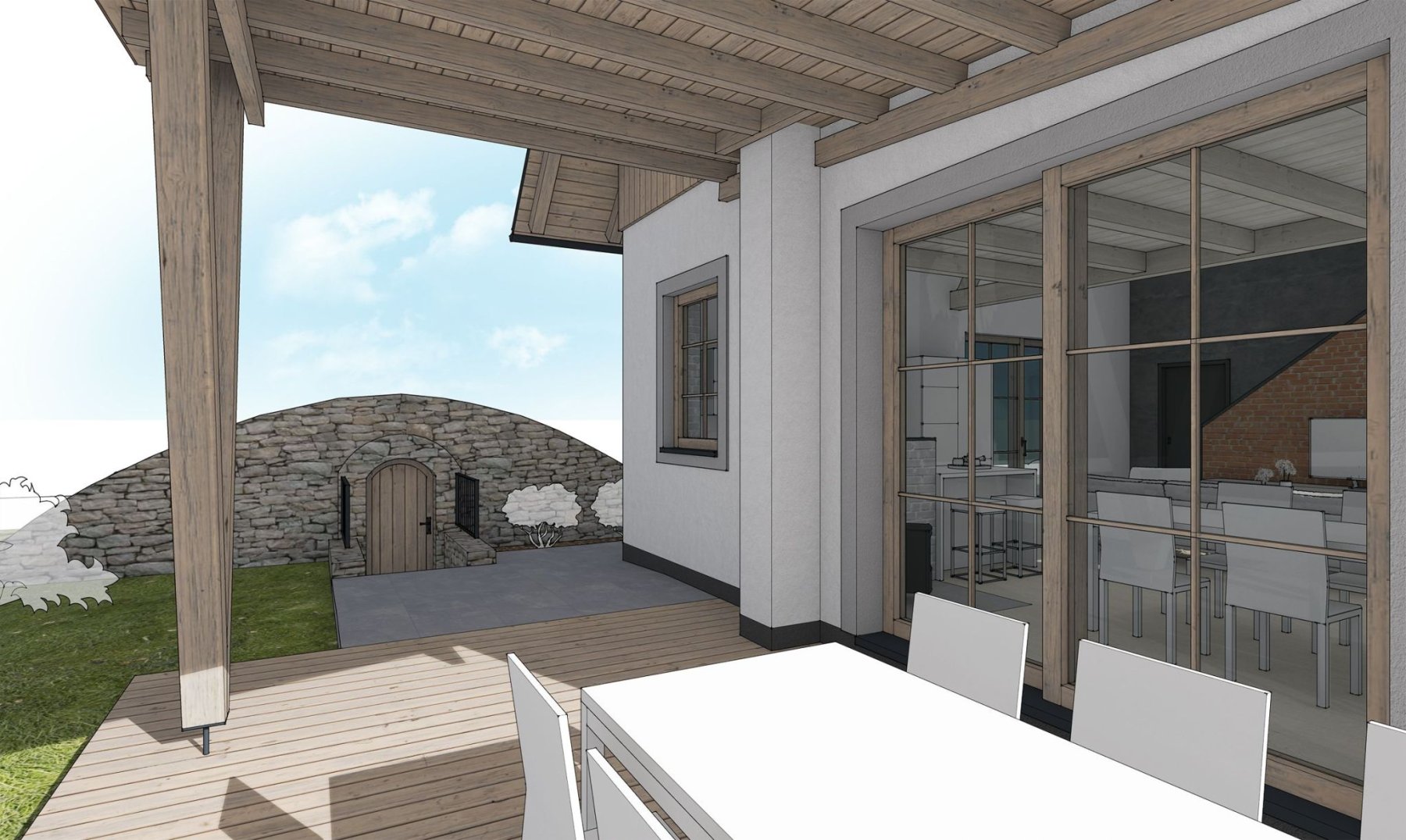 Tento rodinný dům vychází z české tradice, tu však interpretuje v moderním podání. Na místní historii nás odkazují tradiční prvky jako sedlová střecha, dřevěný obklad, křídla okenic nebo sklípek pod úrovní terénu. Velké prosklené plochy s výhledy do krajiny a netradičně zastřešená terasa však dávají tušit, že uvnitř Vás překvapí neotřelý interiér.