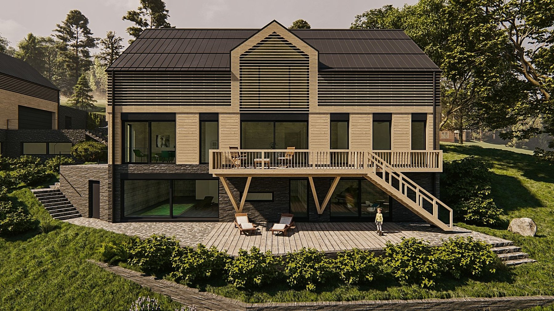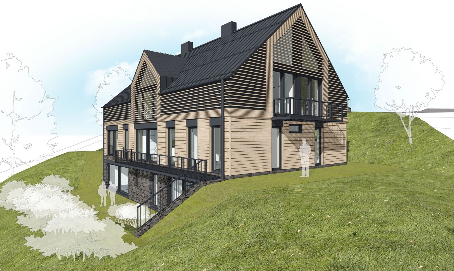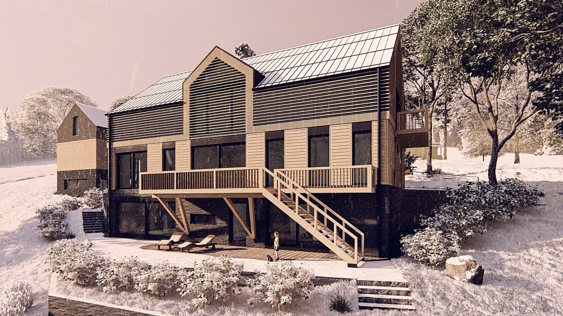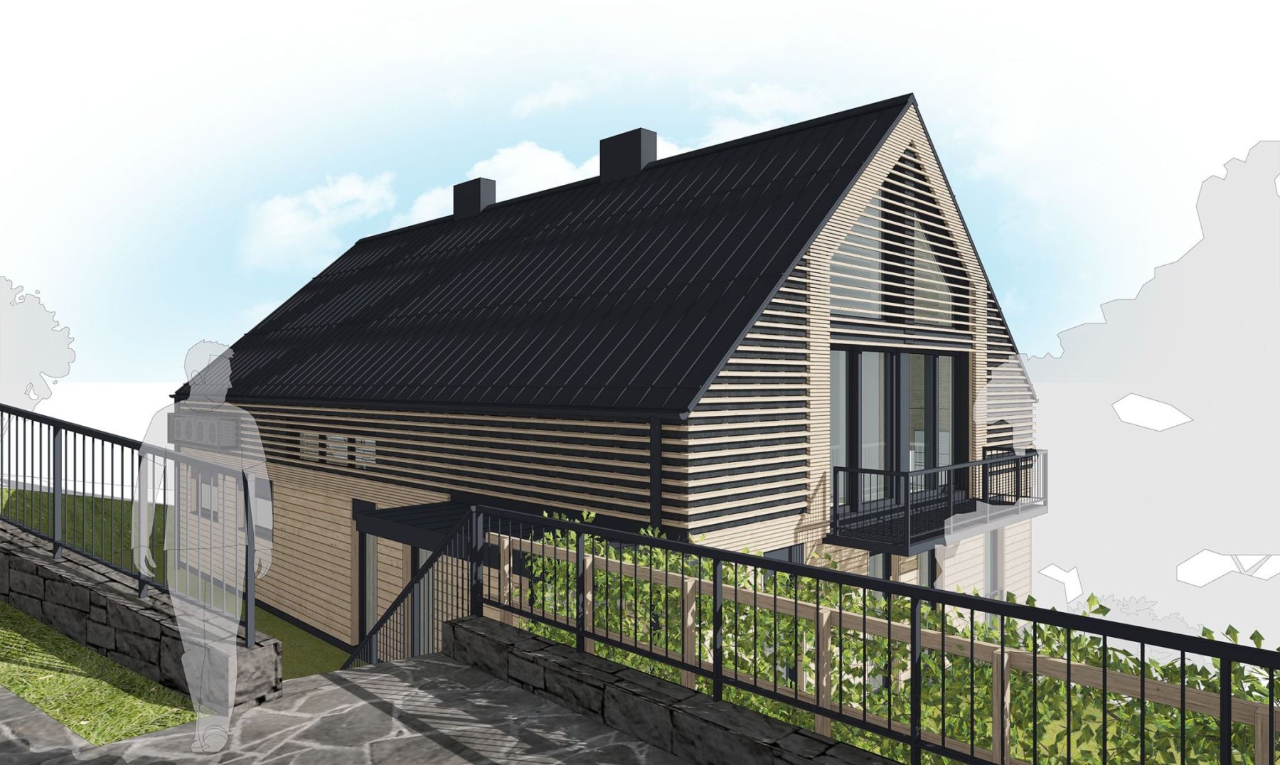 Projekt rodinného domu v Krkonoších byl specifický svým zadáním. Měl sloužit nejen rodině majitelů, ale umožňovat i ubytování hostů a fungovat zároveň jako penzion. Hosté měli mít možnost využívat vnitřní bazén, společenskou místnost, venkovní kryté posezení s krbem i rozlehlou zahradu s krásným výhledem. Vše mělo být vizuálně a funkčně spojeno tak, aby uživatelé měli pocit jednotného areálu, který zapadá do okolní krajiny a maximálně využívá potenciál místa. Vznikla tak studie rodinného domu s krásným i útulným bydlením v přírodě.