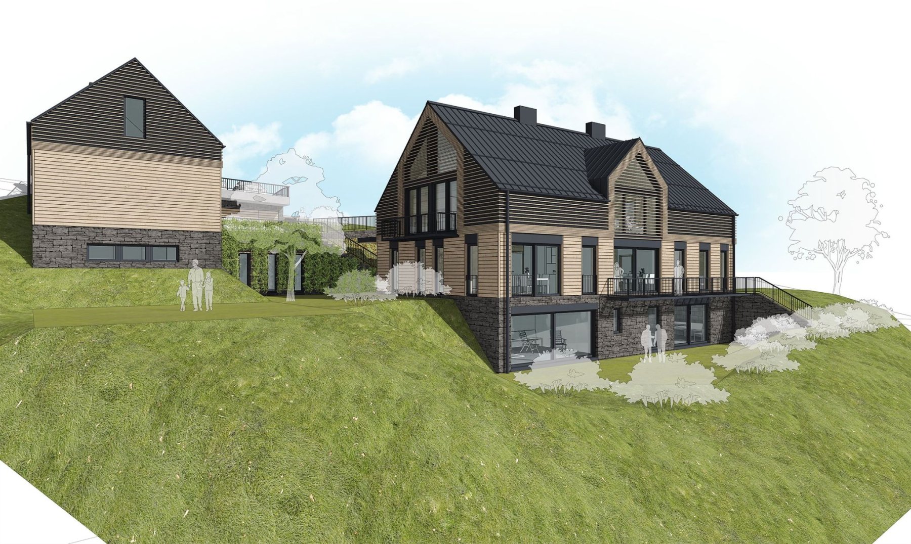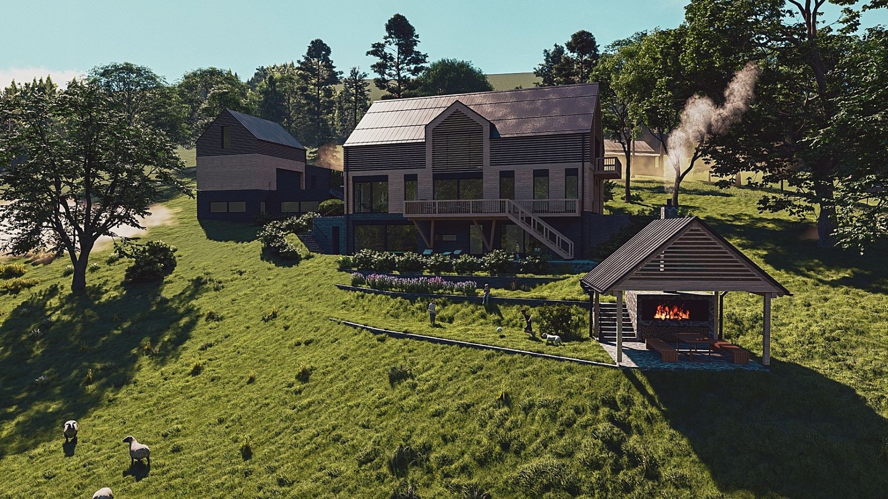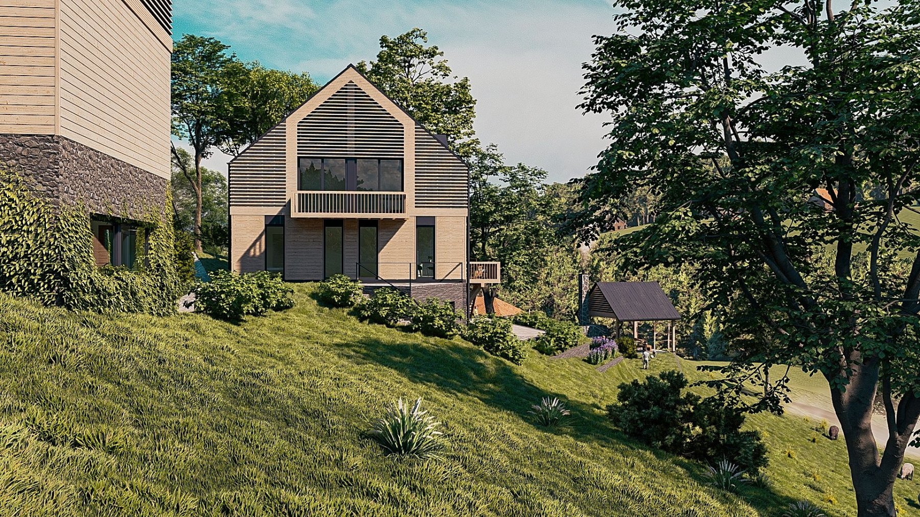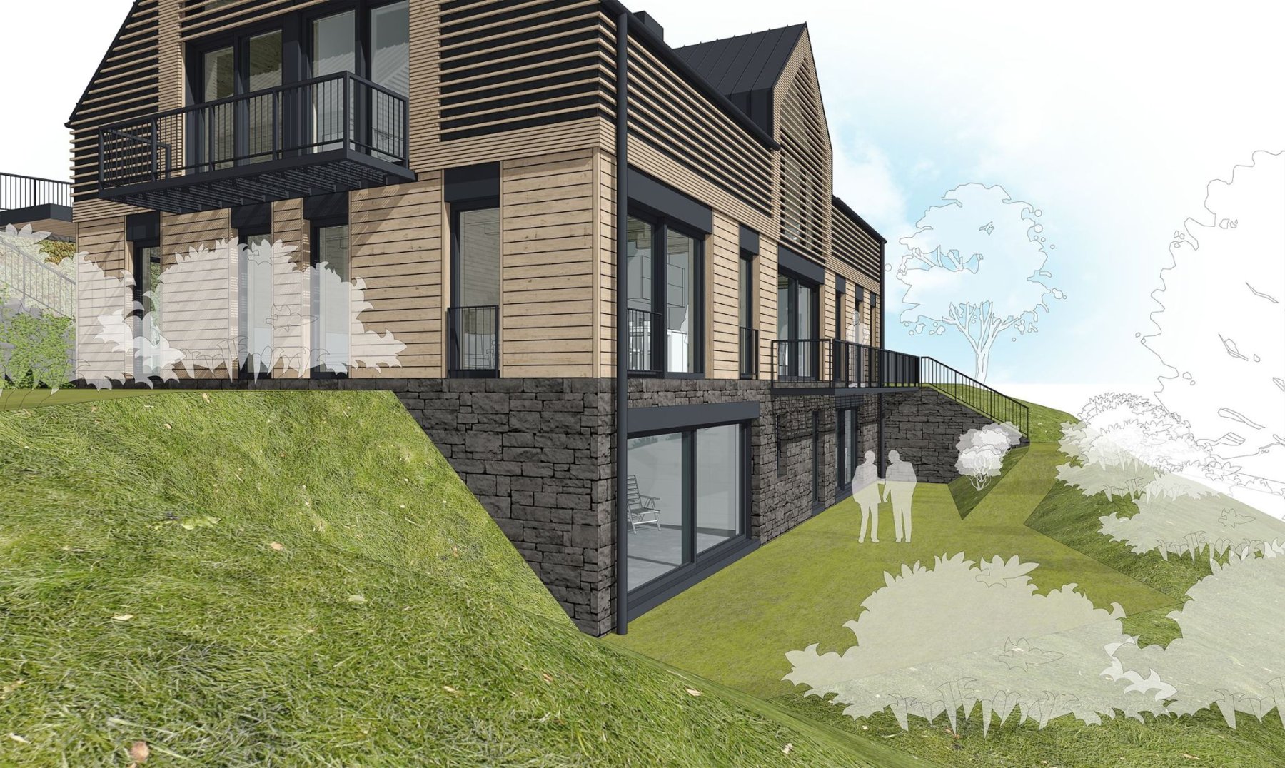 Aby bylo respektováno měřítko a rámec prostředí, byly navrženy tři samostatné budovy se sedlovými střechami, obložené dřevem a propojující vnitřní prostor s okolní krajinou spoustou prosklených ploch. Hlavní budova poskytla ubytování majitelům i hostům v prvním a druhém patře, a společenskou místnost a bazén v přízemí. Další možnosti ubytování byly navrženy ve druhém samostaném objektu. Venkovní posezení s krbem bylo umístěno samostatně na nejnižší terase.