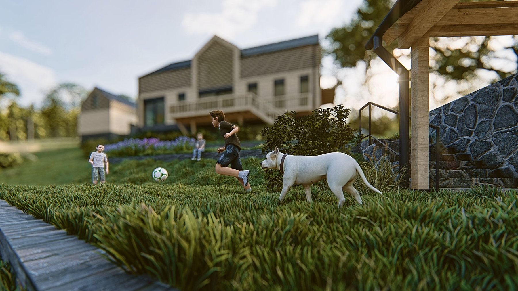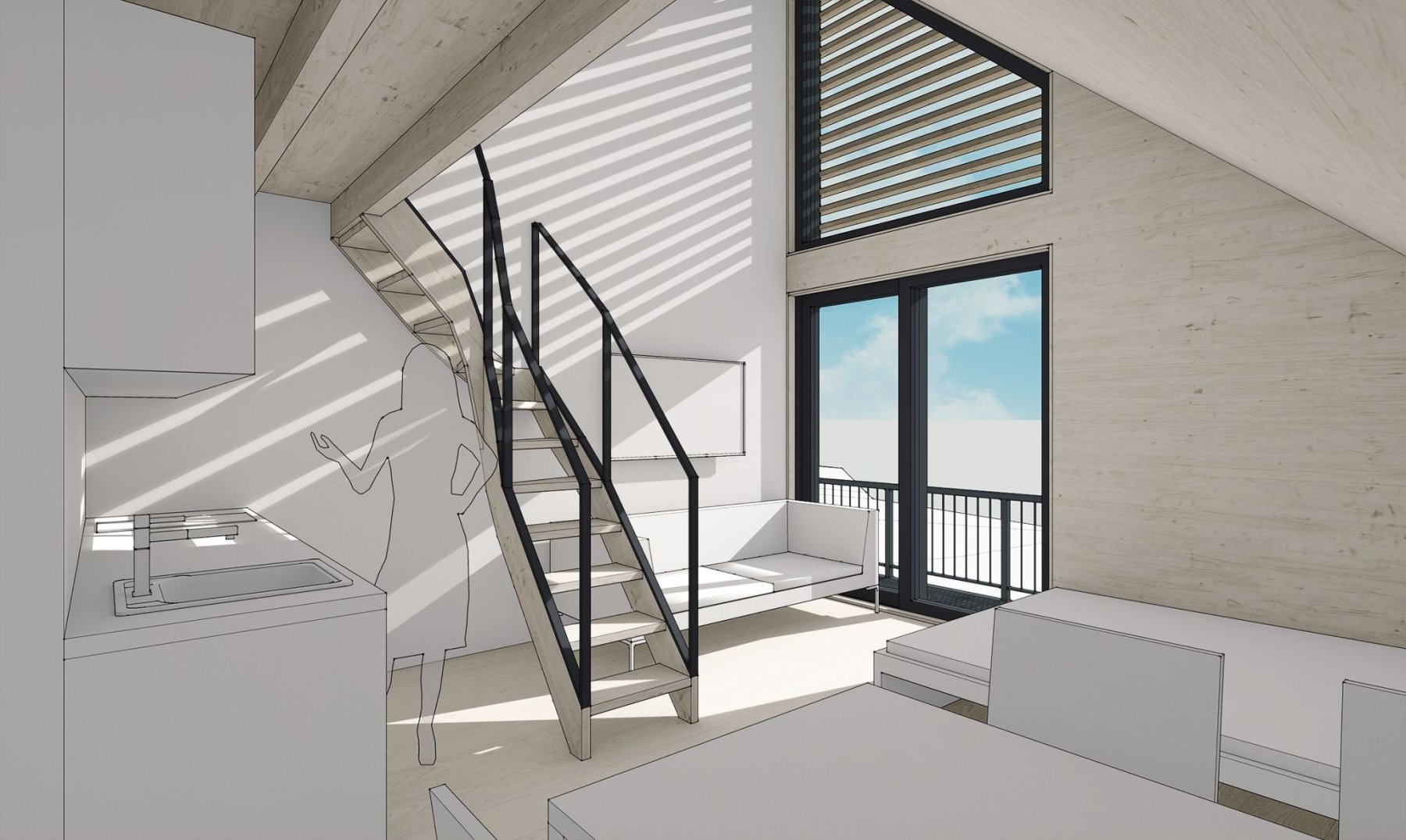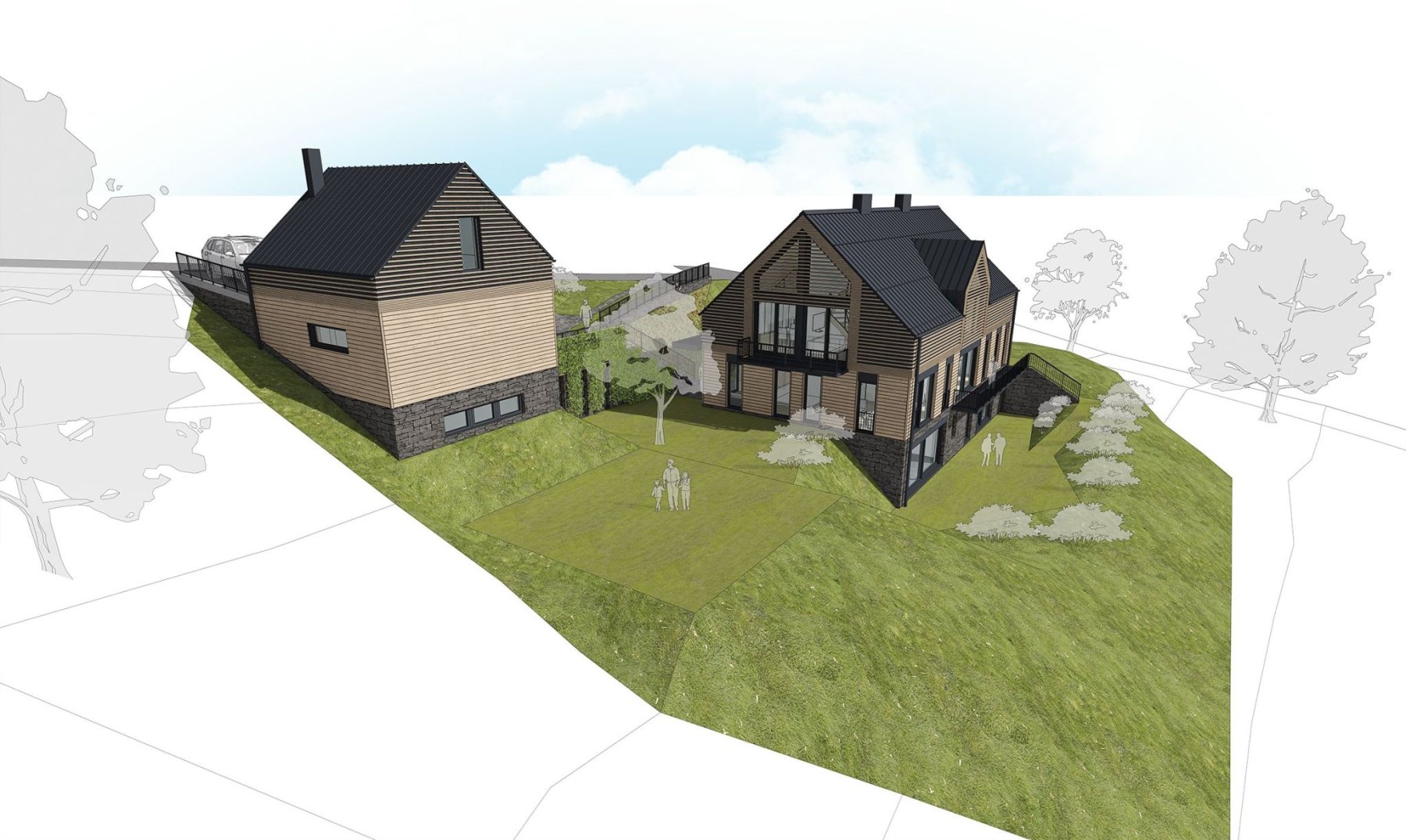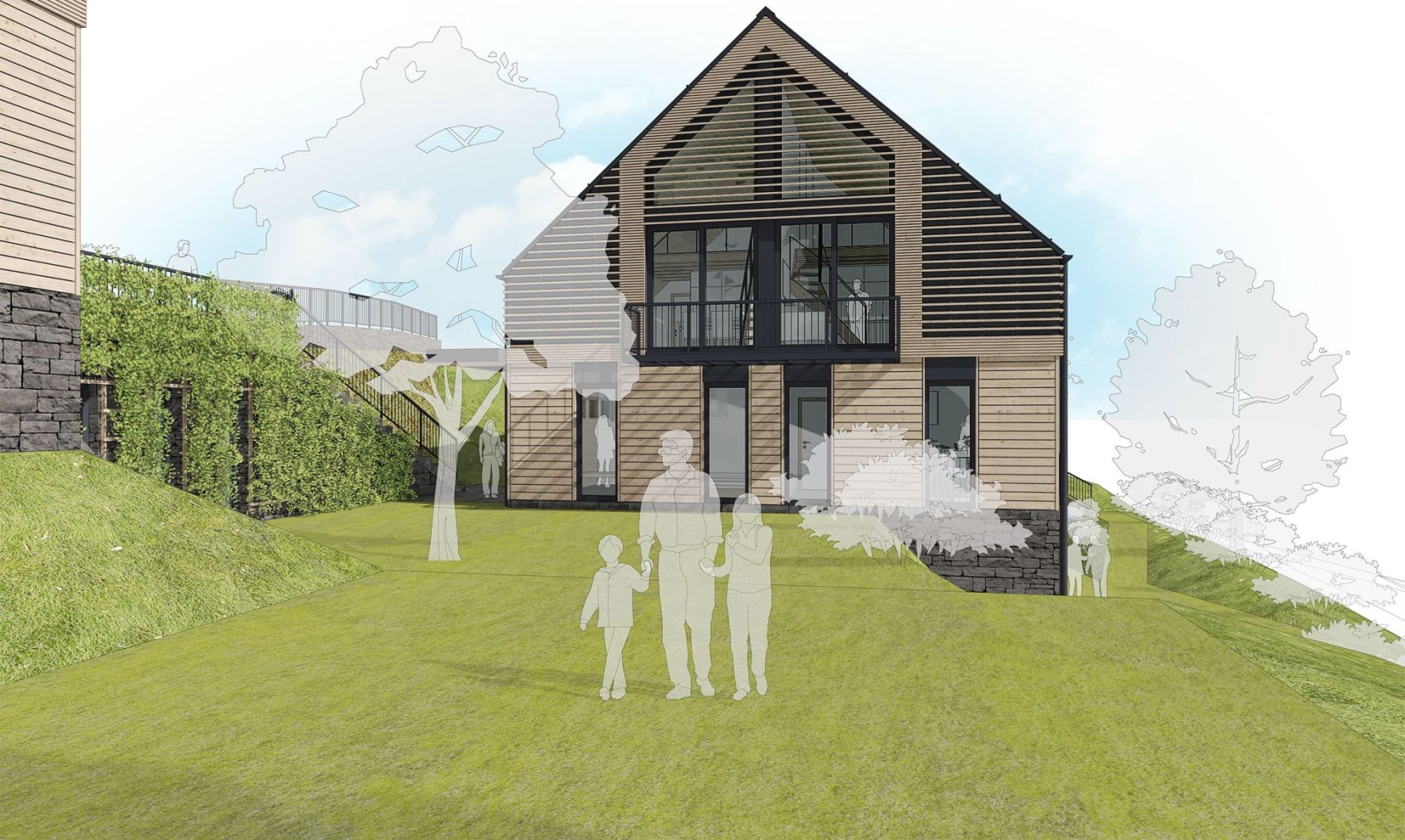 Aby bylo respektováno měřítko a rámec prostředí, byly navrženy tři samostatné budovy se sedlovými střechami, obložené dřevem a propojující vnitřní prostor s okolní krajinou spoustou prosklených ploch. Hlavní budova poskytla ubytování majitelům i hostům v prvním a druhém patře, a společenskou místnost a bazén v přízemí. Další možnosti ubytování byly navrženy ve druhém samostaném objektu. Venkovní posezení s krbem bylo umístěno samostatně na nejnižší terase.