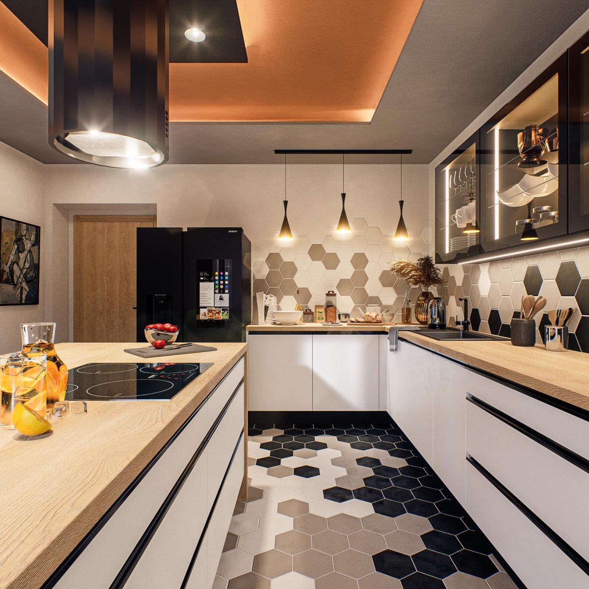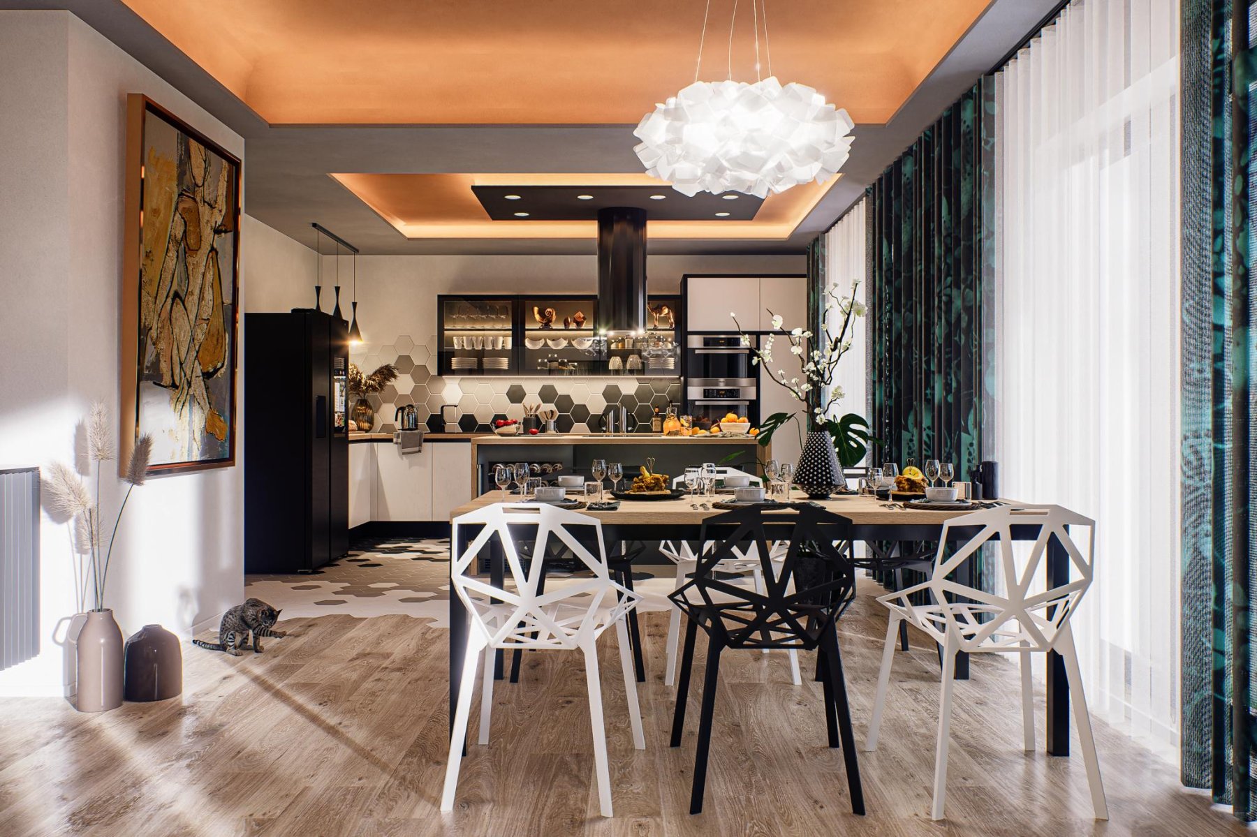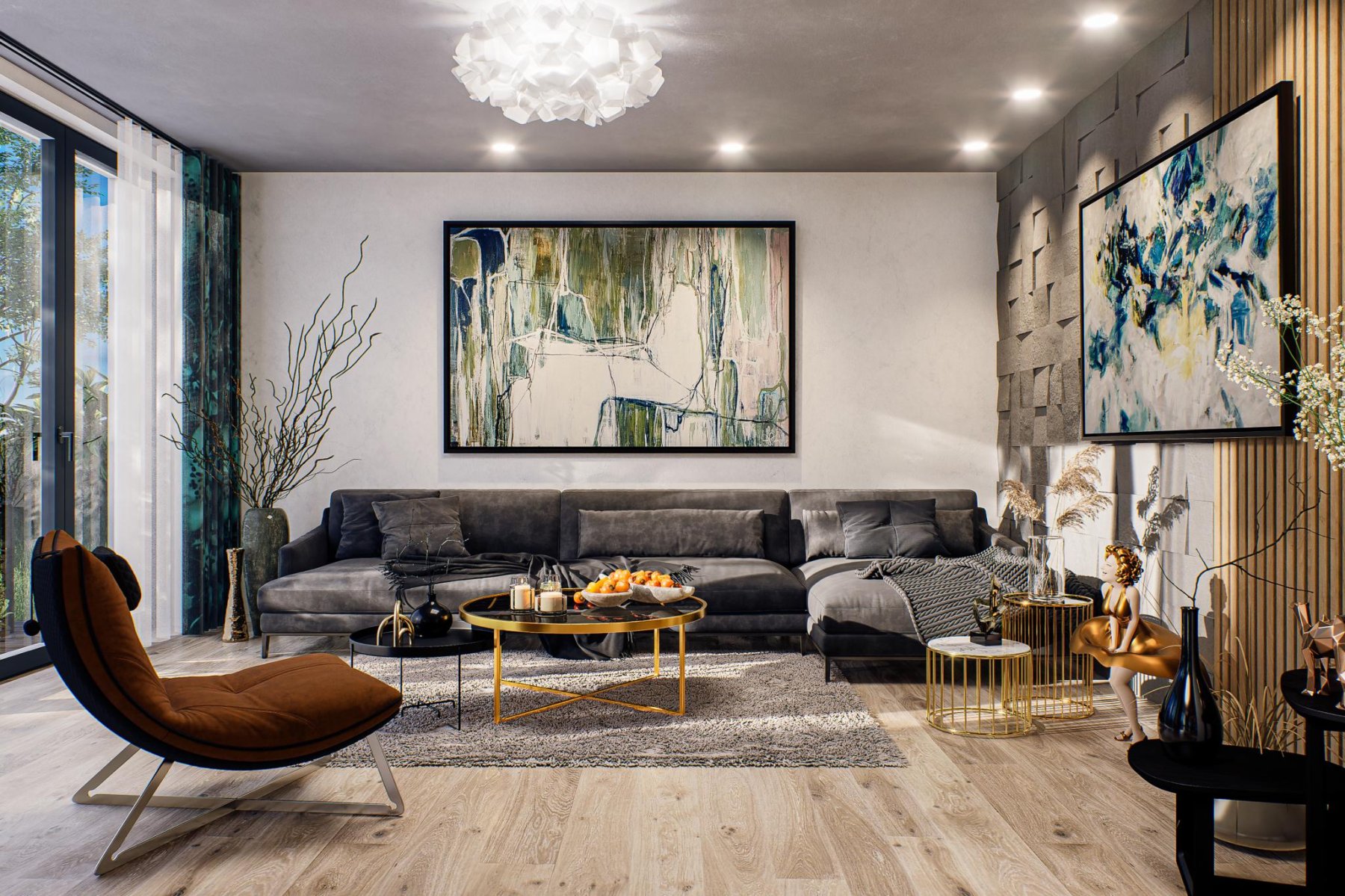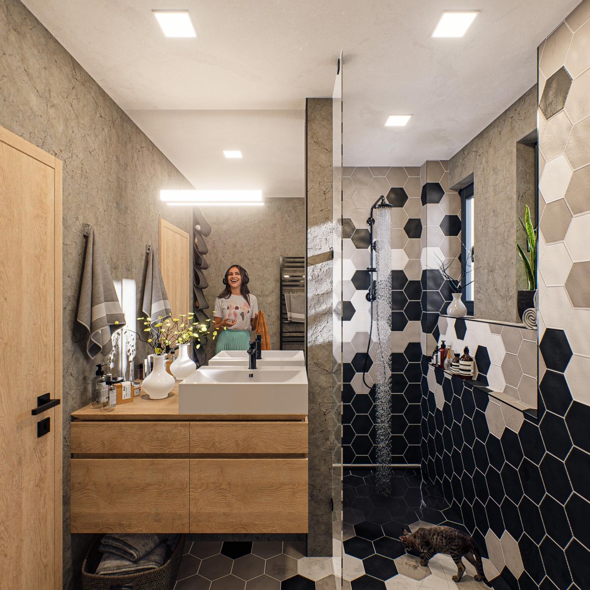 Tento krásný interiér vznikal za milé spolupráce s klientem. Ten nám nechal hodně volnou ruku a tak jsme si návrh nejen užili, ale vznikl díky tomu velmi originální projekt. Majitel je velkým milovníkem umění a tak se plátna stala základem tohoto prostoru. Navázali jsme na ně materiály v přírodních odstínech, které dají dílům nejen vyniknout, ale doplňují je svými texturami a vzory. Podlaha kuchyně ze šestibokých dlaždic přecházejících z antracitové do krémové a později plynule do dřevěné podlahy obývacího pokoje je sama malým uměleckým dílem. Stejné řešení naleznete i v koupelně, a díky tomu celý prostor domu na sebe plynule navazuje. Netradiční výběr povrchů doplňuje moderně řešená kuchyň s ostrůvkem a digestoří v prostoru, jídelní stůl s originálními židlemi a komfortní obývací prostor s pohodlnou sedací soupravou a křeslem. Atmosféra prostoru je dotvořena krásnými závěsy a jak už je naším zvykem také osvětlením. Netradiční závěsná světla, funkční osvětlení obrazů, ale i jemné osvětlení stropními rampami to vše umožňuje dotvoření atmosféry podle aktuální nálady.