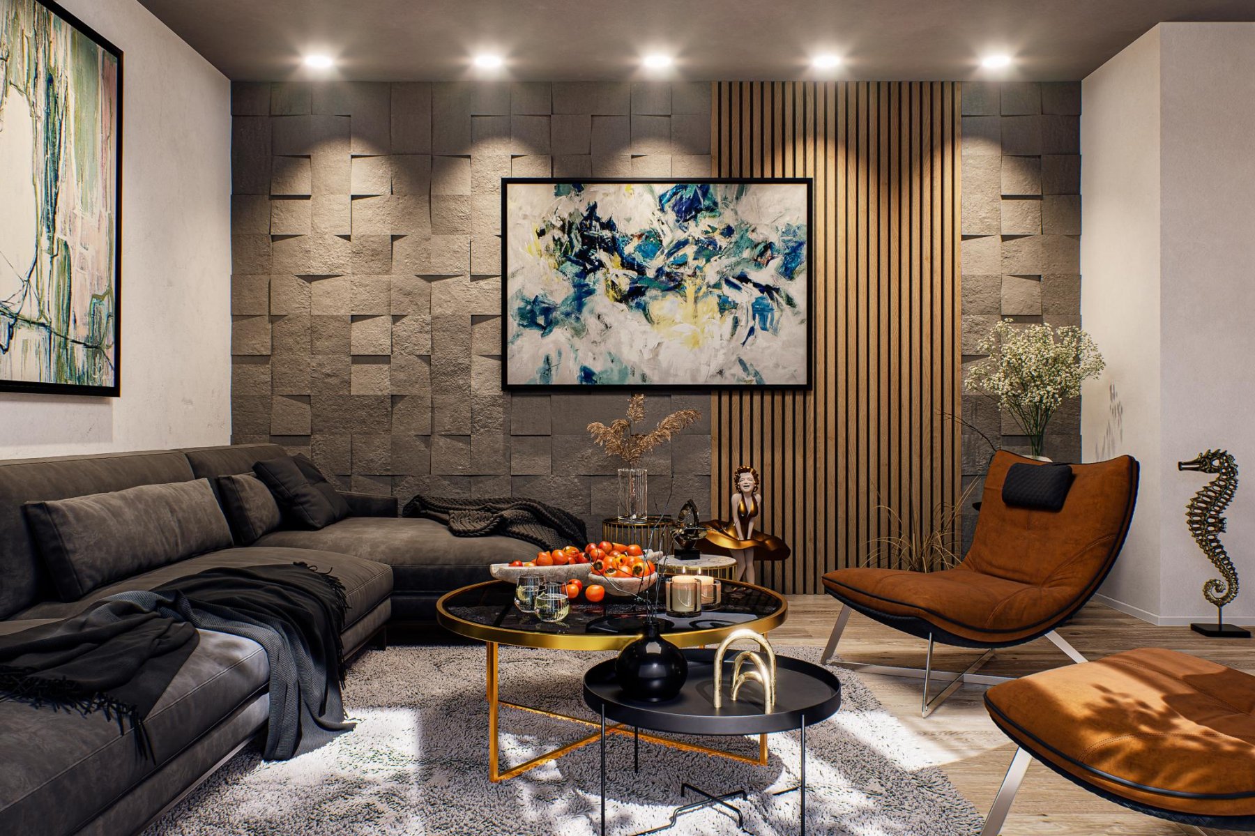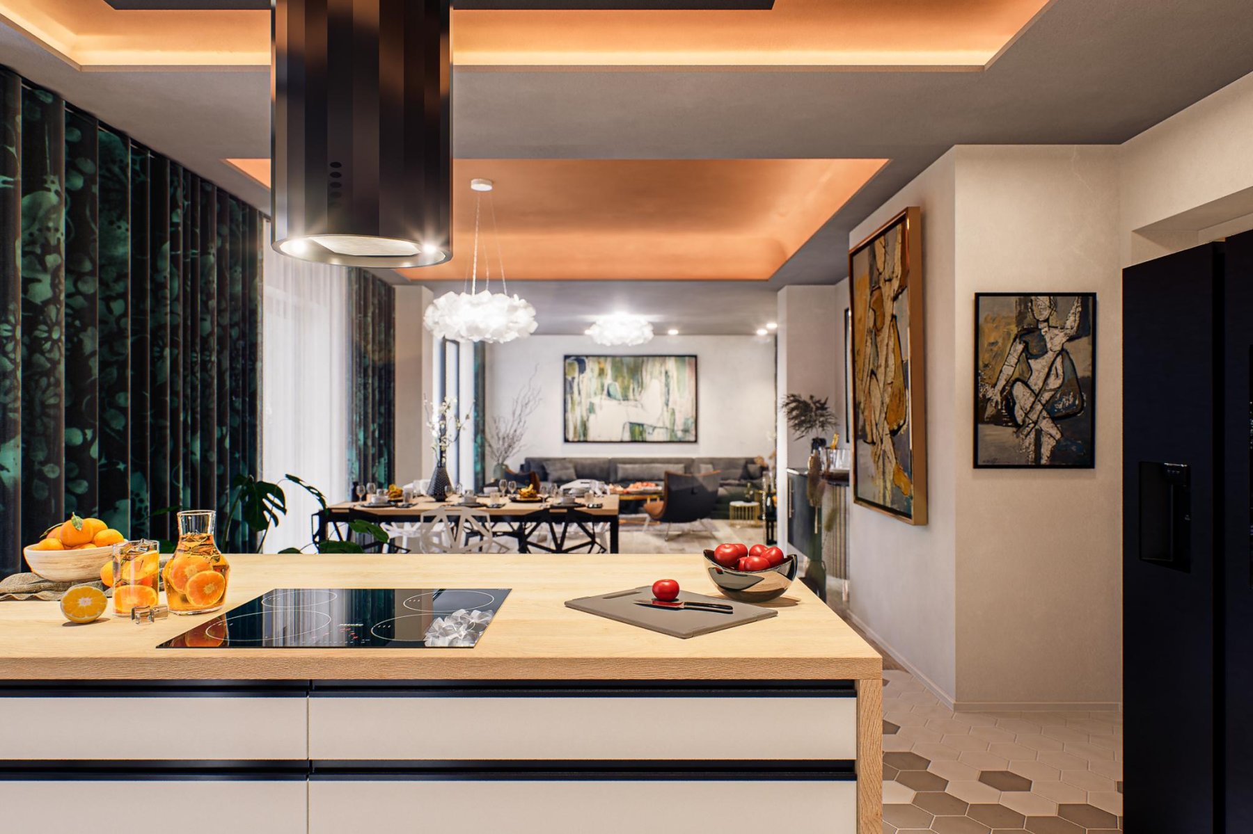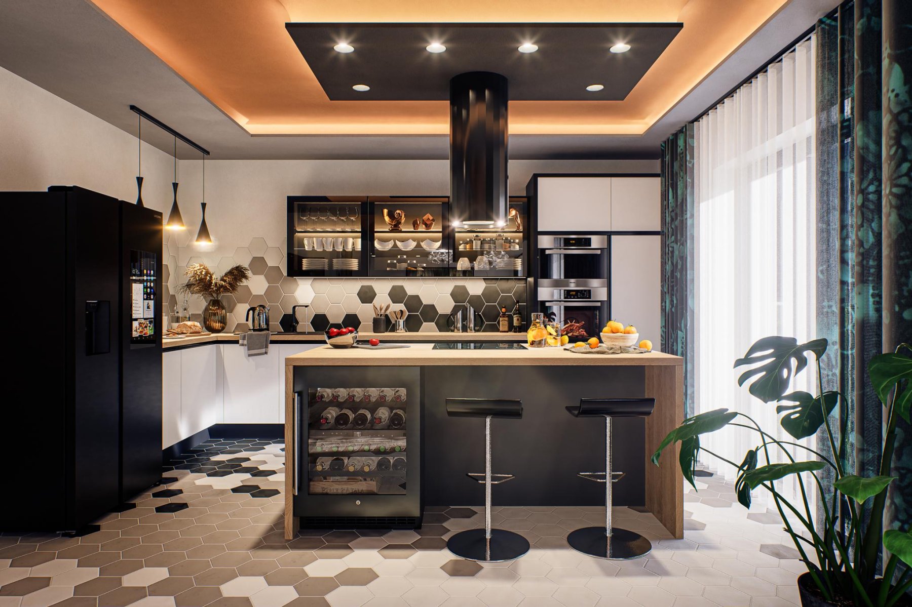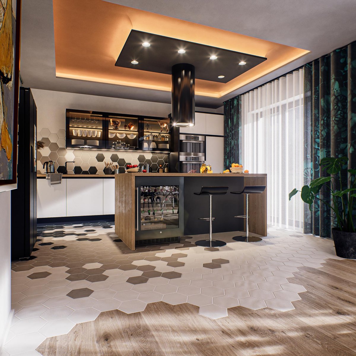 Tento krásný interiér vznikal za milé spolupráce s klientem. Ten nám nechal hodně volnou ruku a tak jsme si návrh nejen užili, ale vznikl díky tomu velmi originální projekt. Majitel je velkým milovníkem umění a tak se plátna stala základem tohoto prostoru. Navázali jsme na ně materiály v přírodních odstínech, které dají dílům nejen vyniknout, ale doplňují je svými texturami a vzory. Podlaha kuchyně ze šestibokých dlaždic přecházejících z antracitové do krémové a později plynule do dřevěné podlahy obývacího pokoje je sama malým uměleckým dílem. Stejné řešení naleznete i v koupelně, a díky tomu celý prostor domu na sebe plynule navazuje. Netradiční výběr povrchů doplňuje moderně řešená kuchyň s ostrůvkem a digestoří v prostoru, jídelní stůl s originálními židlemi a komfortní obývací prostor s pohodlnou sedací soupravou a křeslem. Atmosféra prostoru je dotvořena krásnými závěsy a jak už je naším zvykem také osvětlením. Netradiční závěsná světla, funkční osvětlení obrazů, ale i jemné osvětlení stropními rampami to vše umožňuje dotvoření atmosféry podle aktuální nálady.