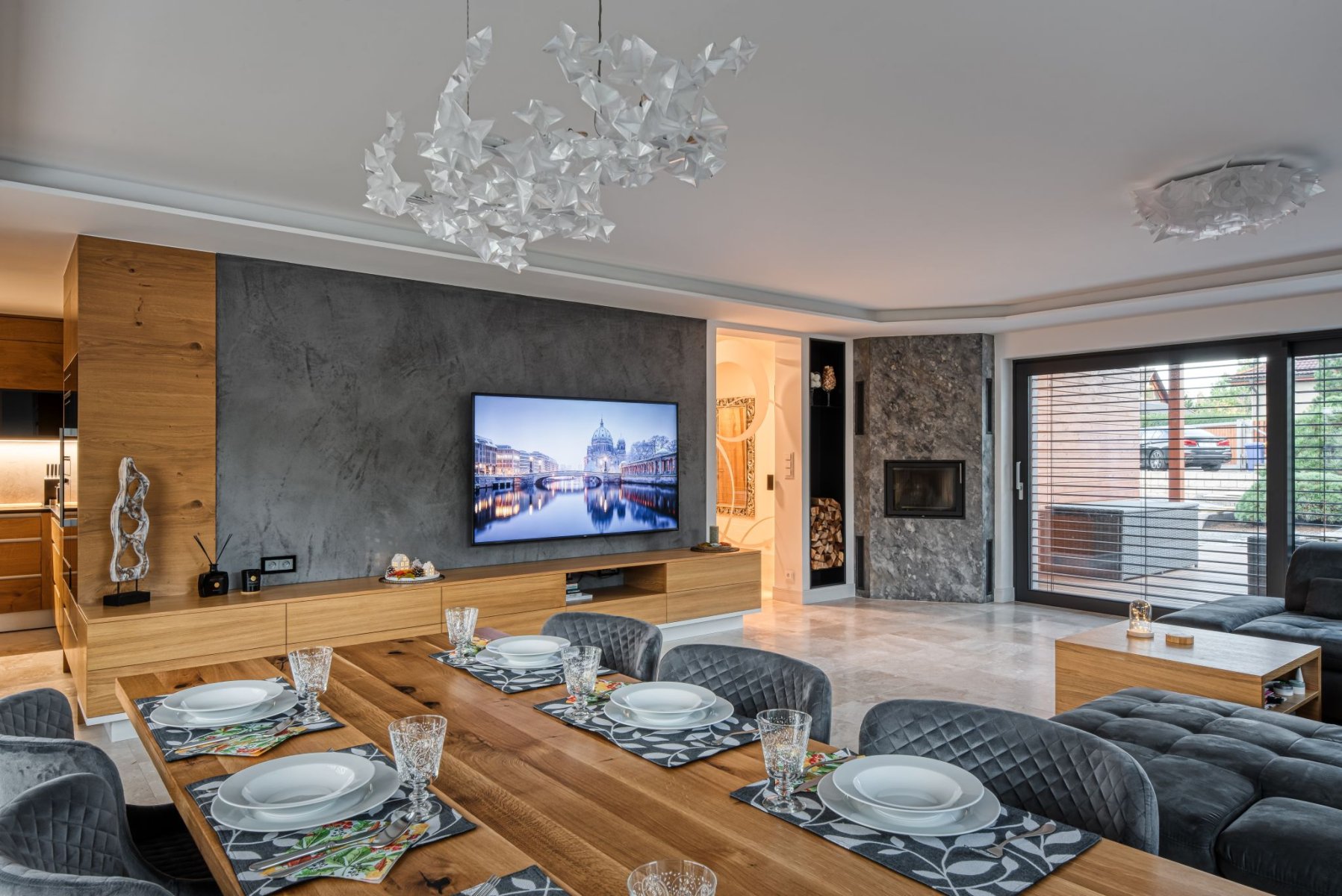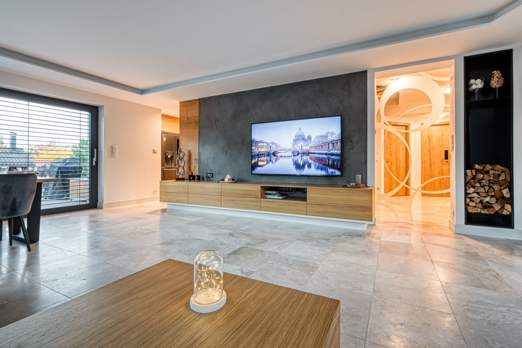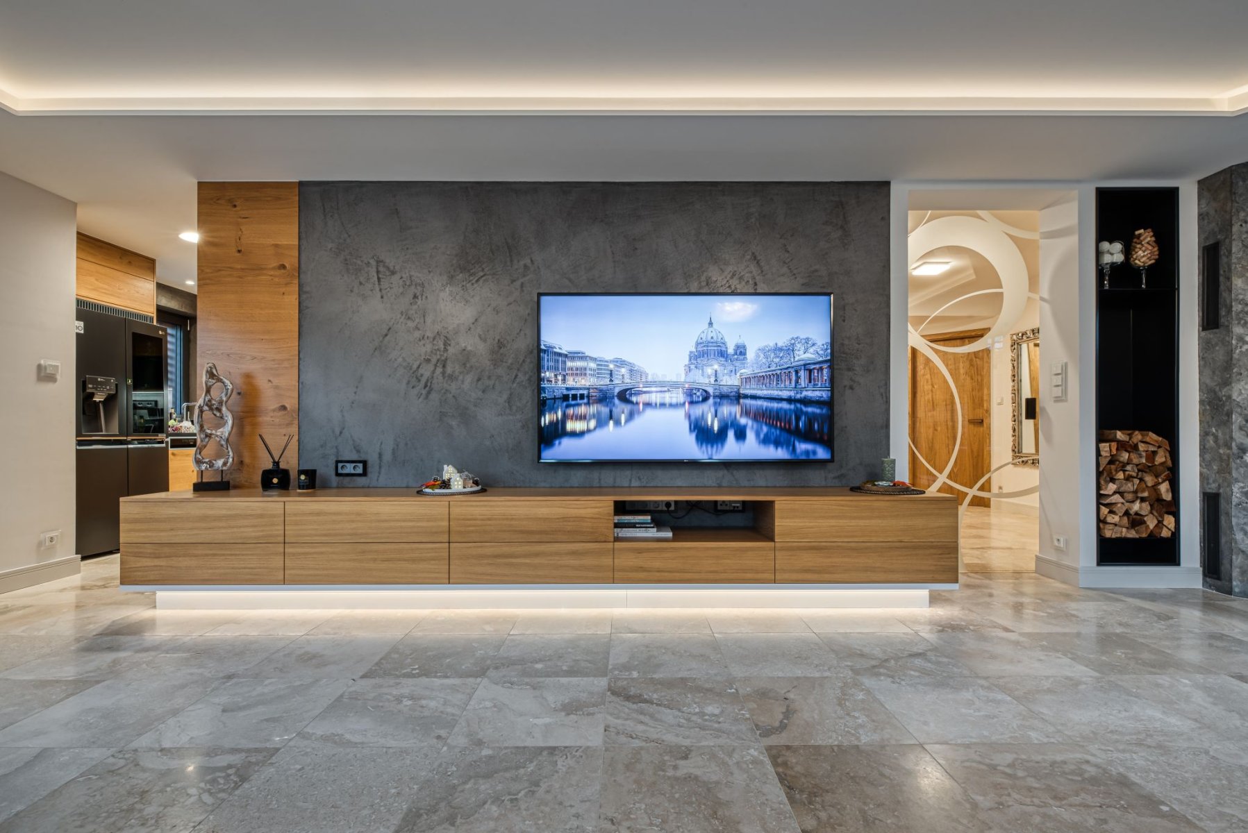 Betonová stěrka v obývacím pokoji plynule navazuje na řešení kuchyně a skryje i plochu televize