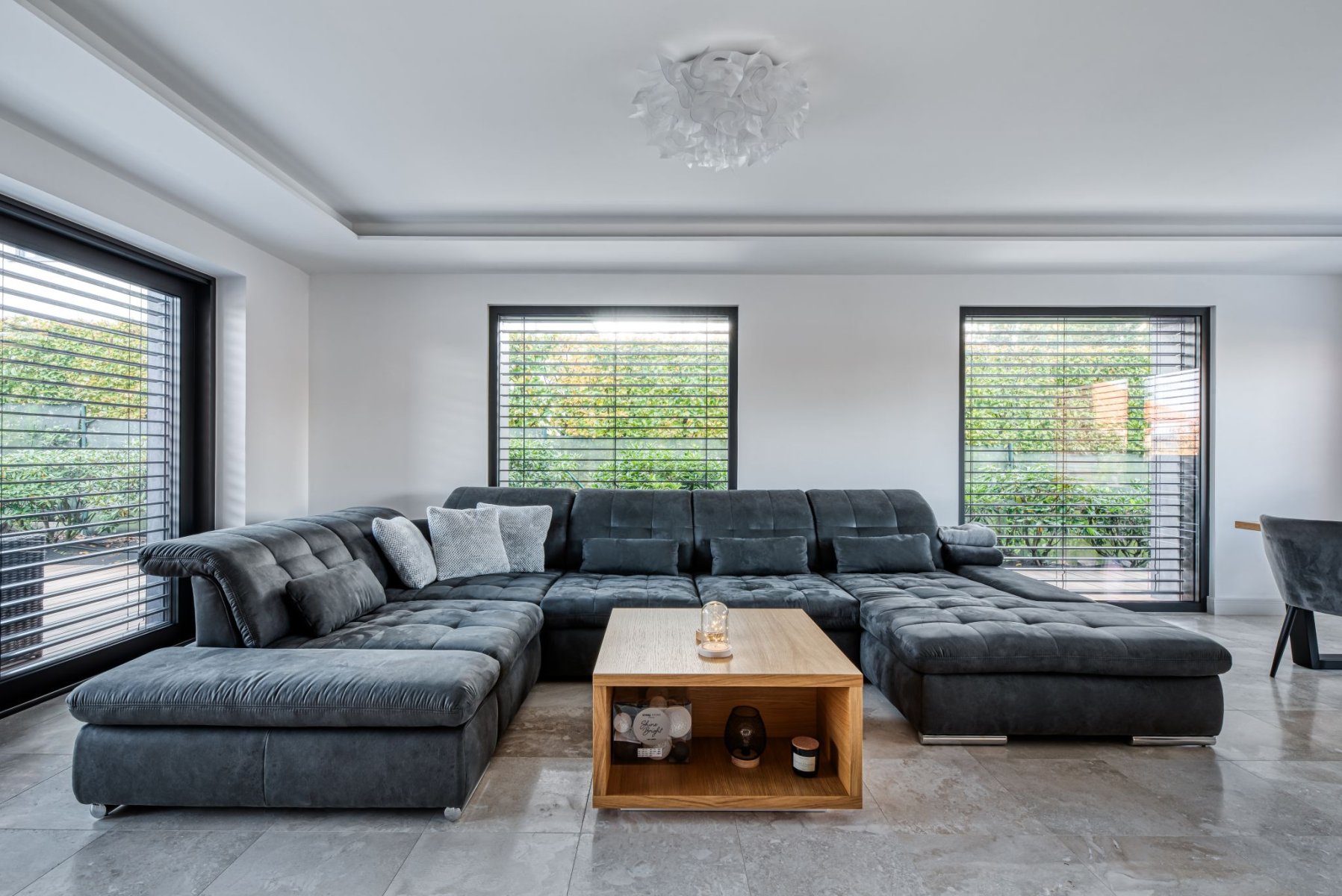 Prostorná sedací souprava se stolkem a netradičním osvětlením