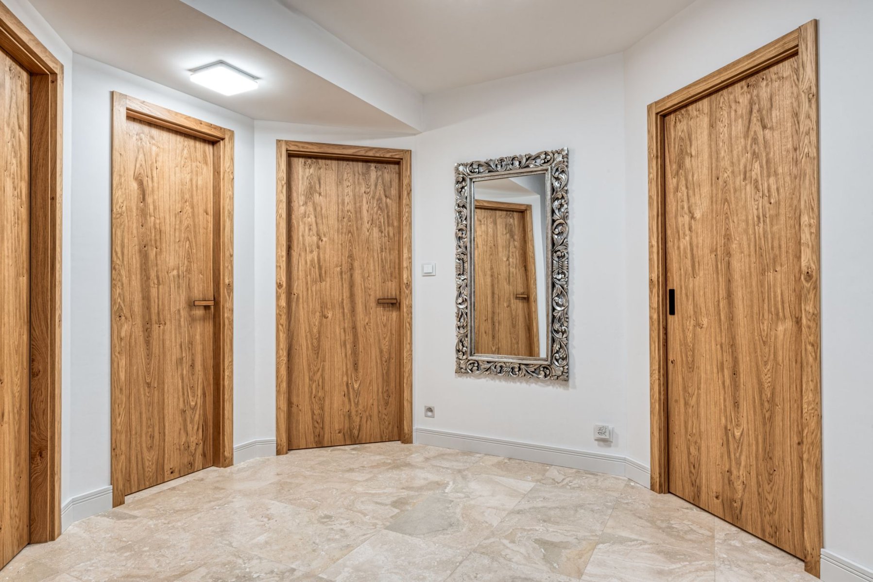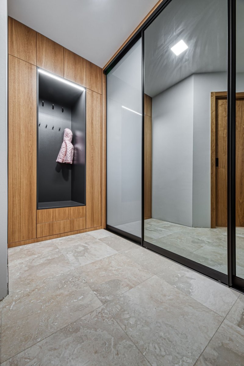 Podlaha s kresbou kamene a dřevo propojuje chodbu se zbytkem domu