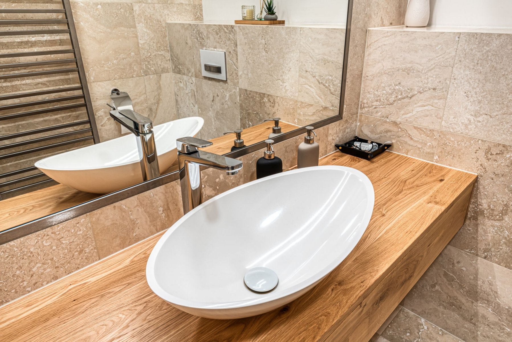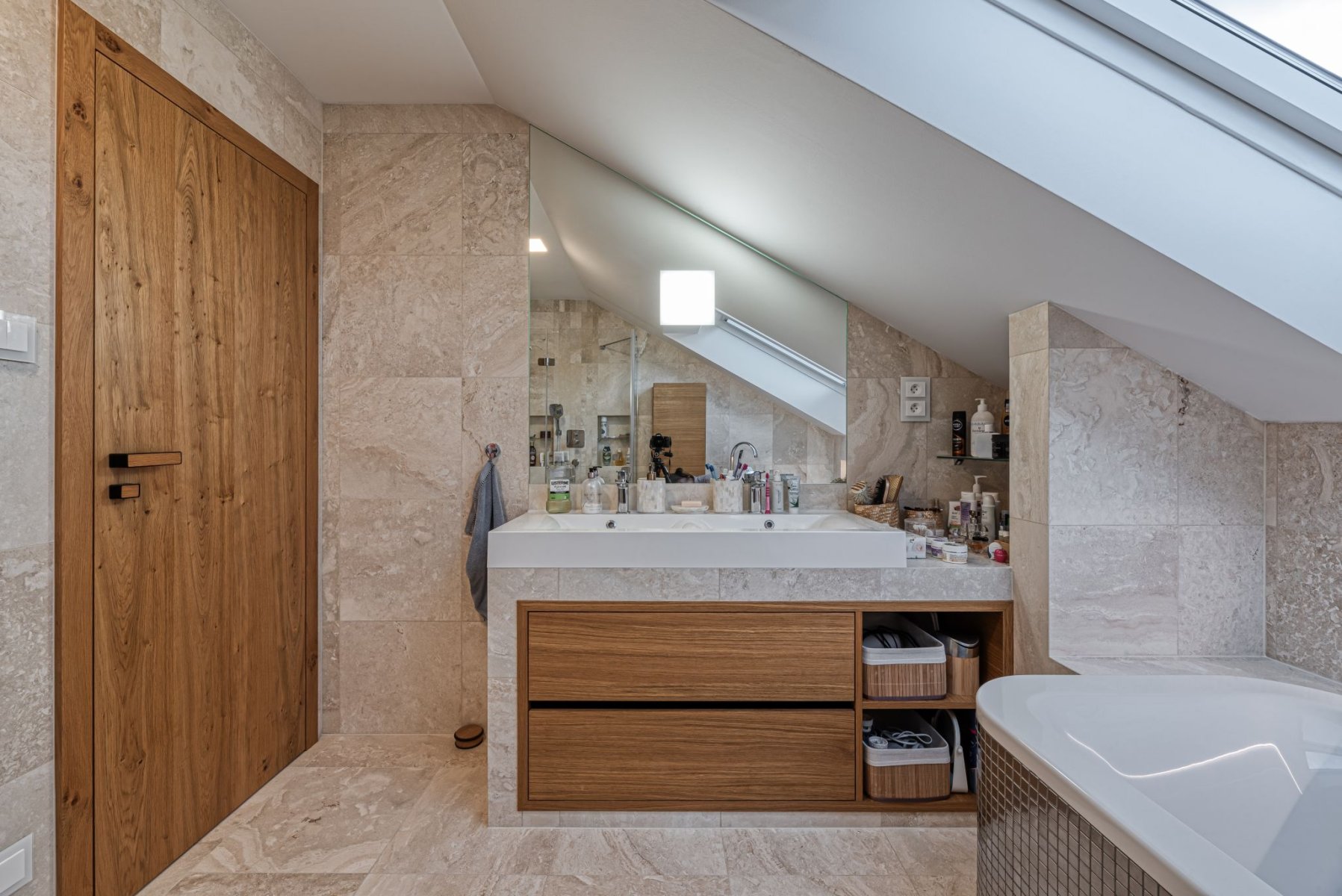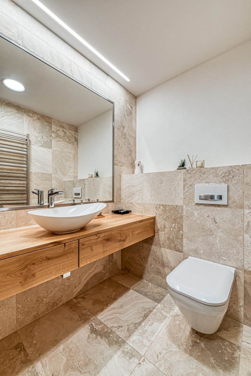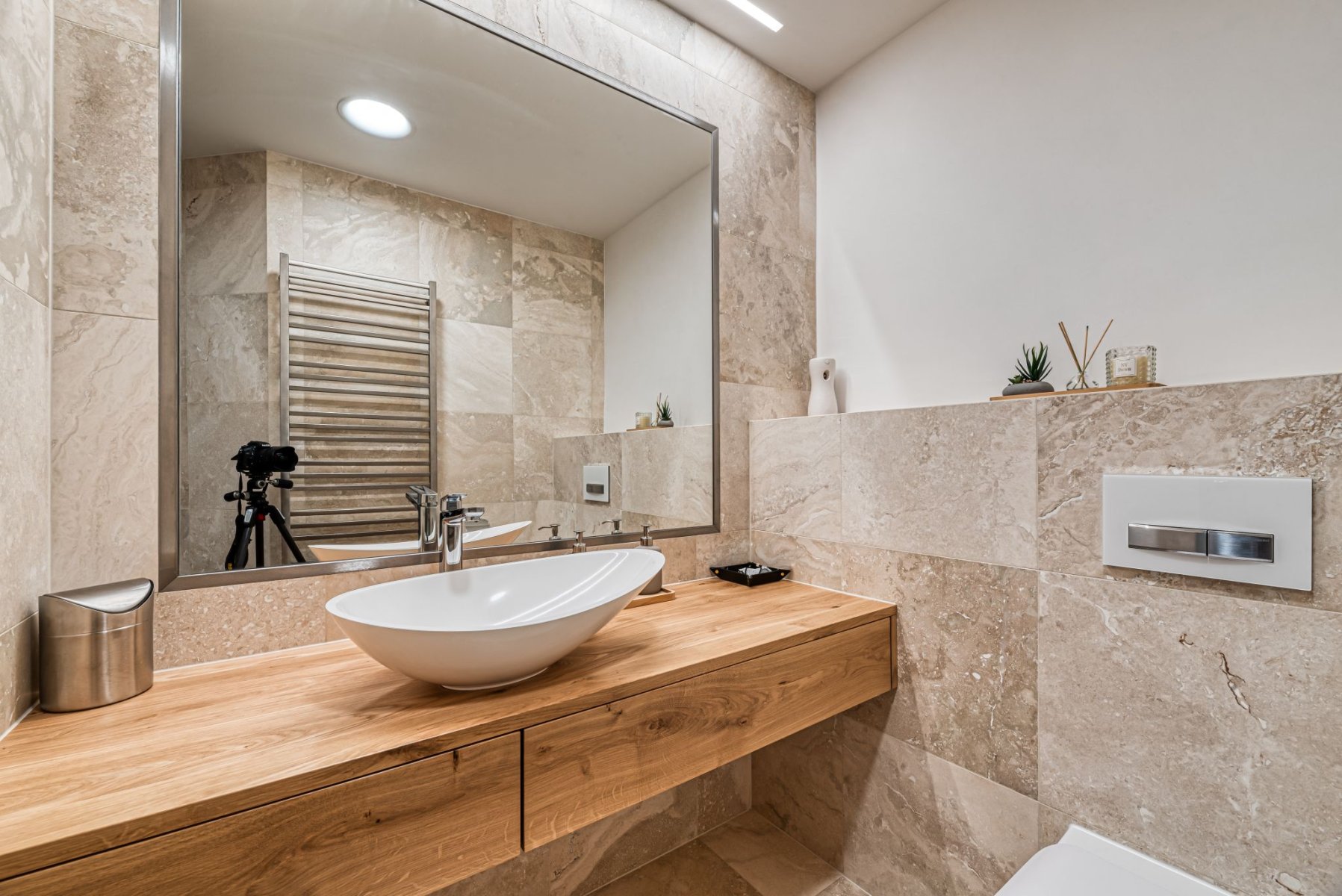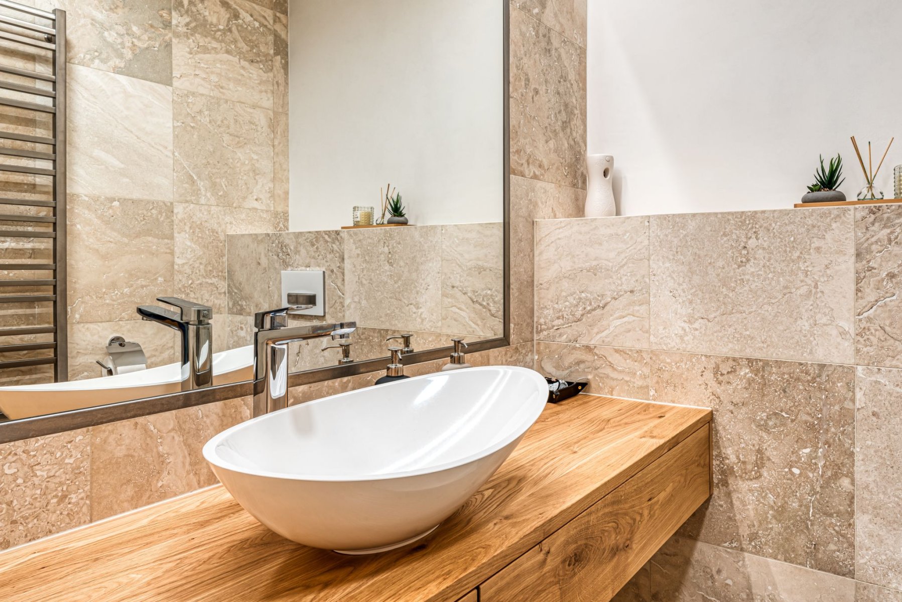 Dřevo, kámen, bílá sanita a chromované detaily tvoří útulný celek