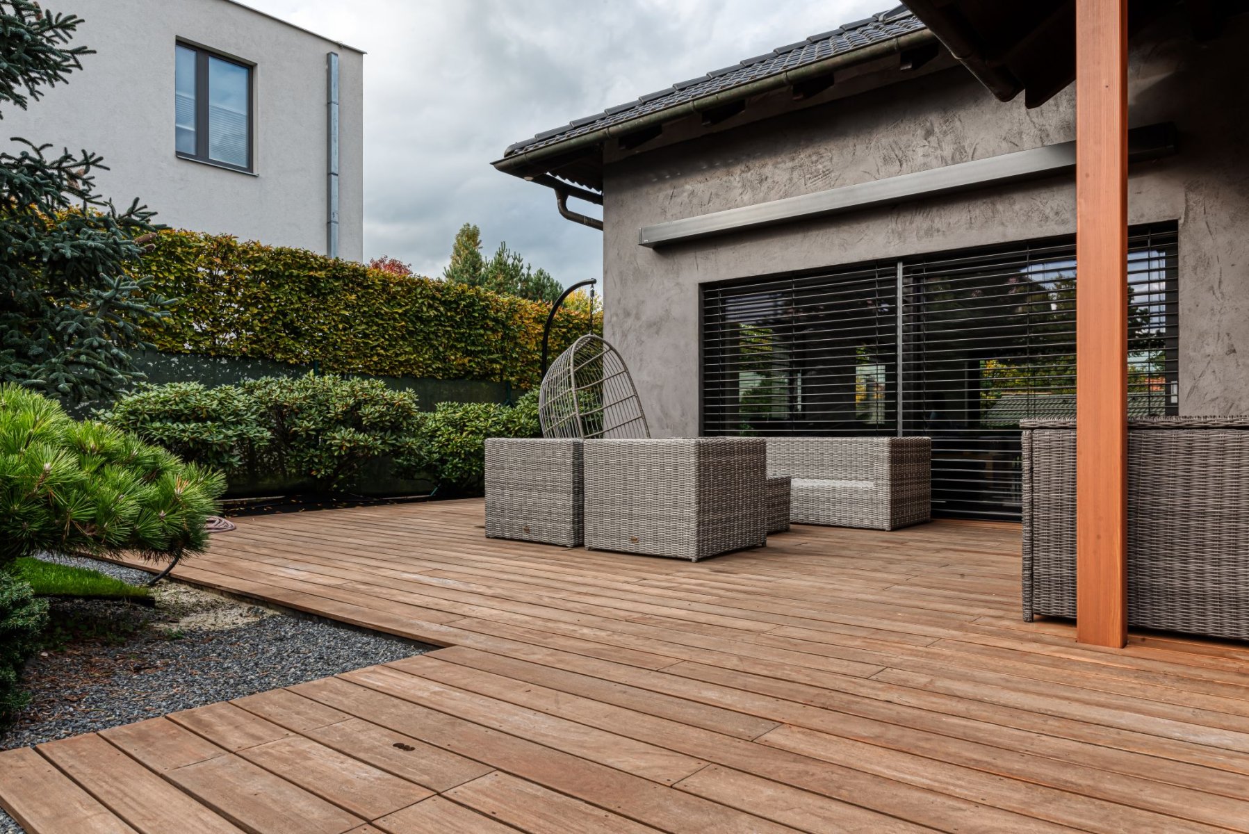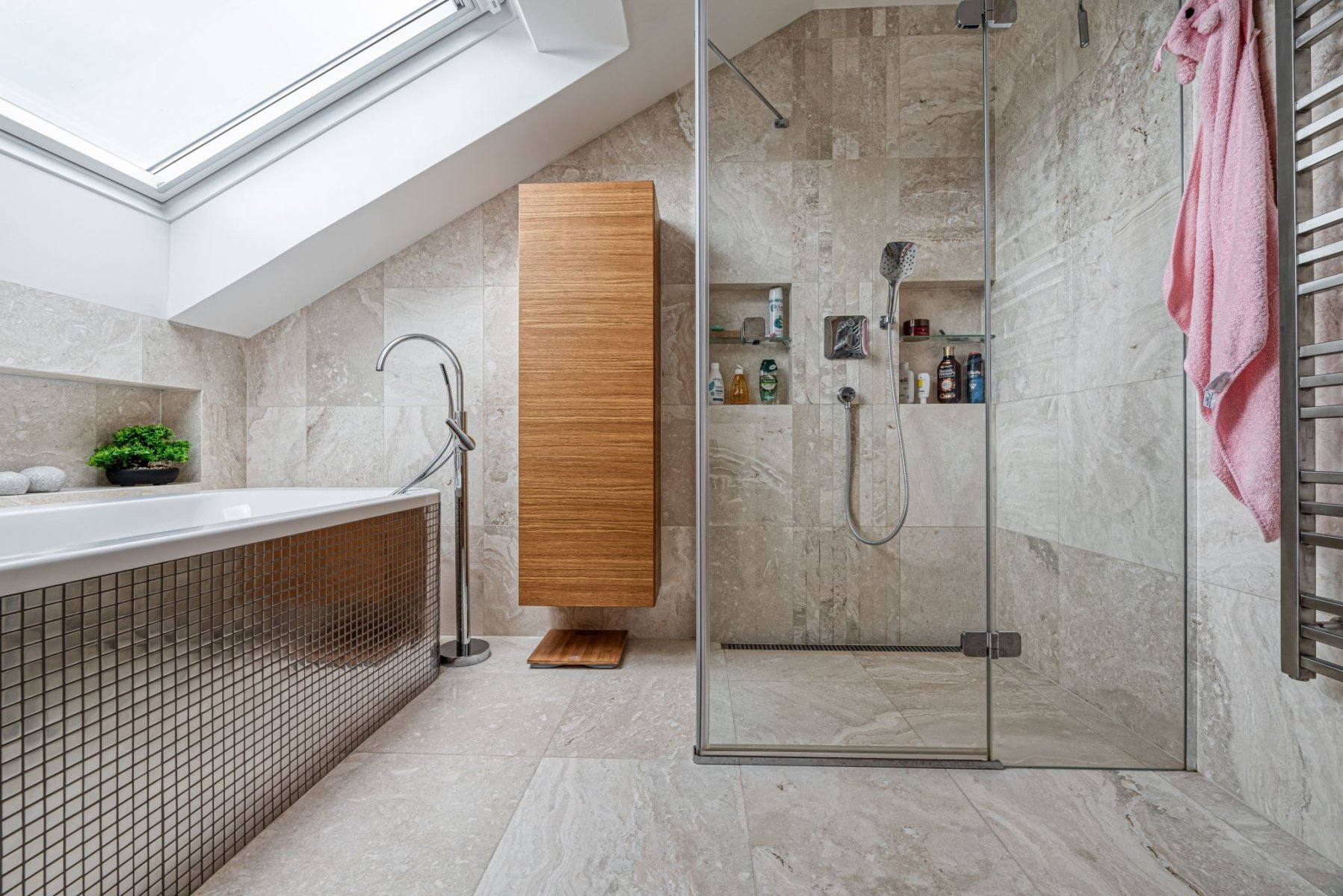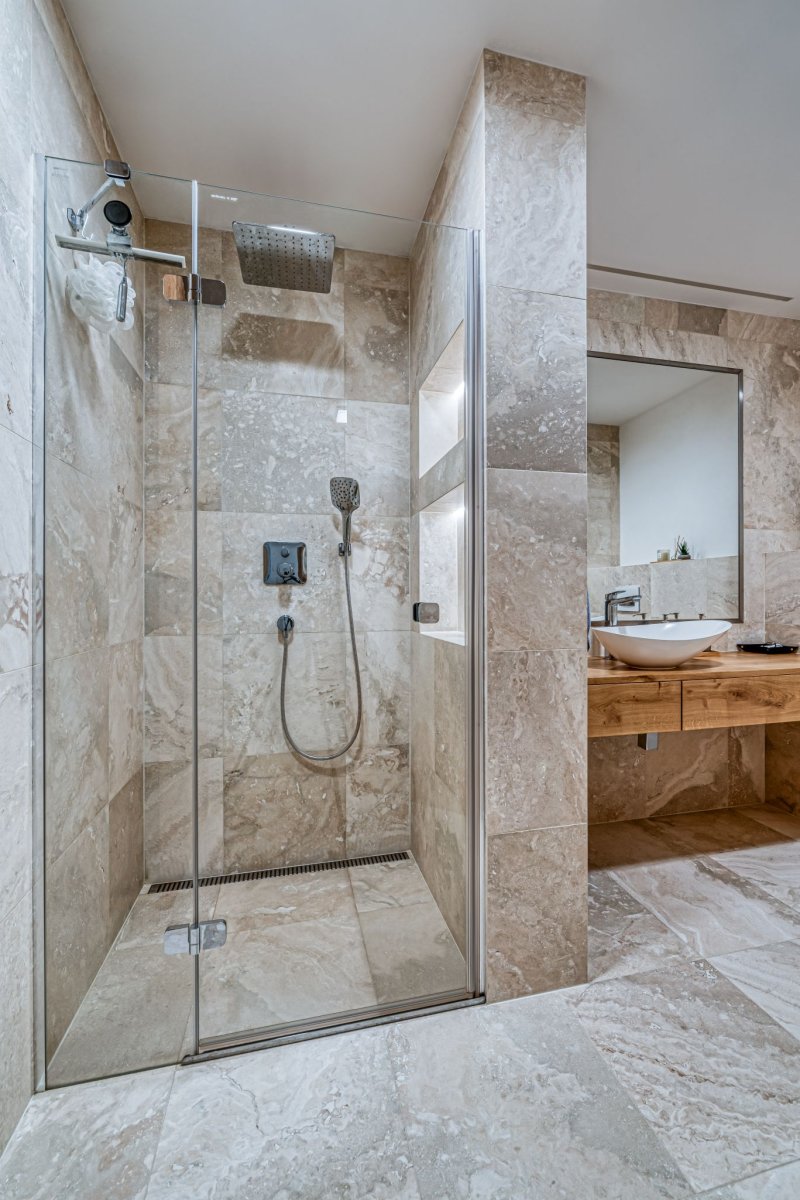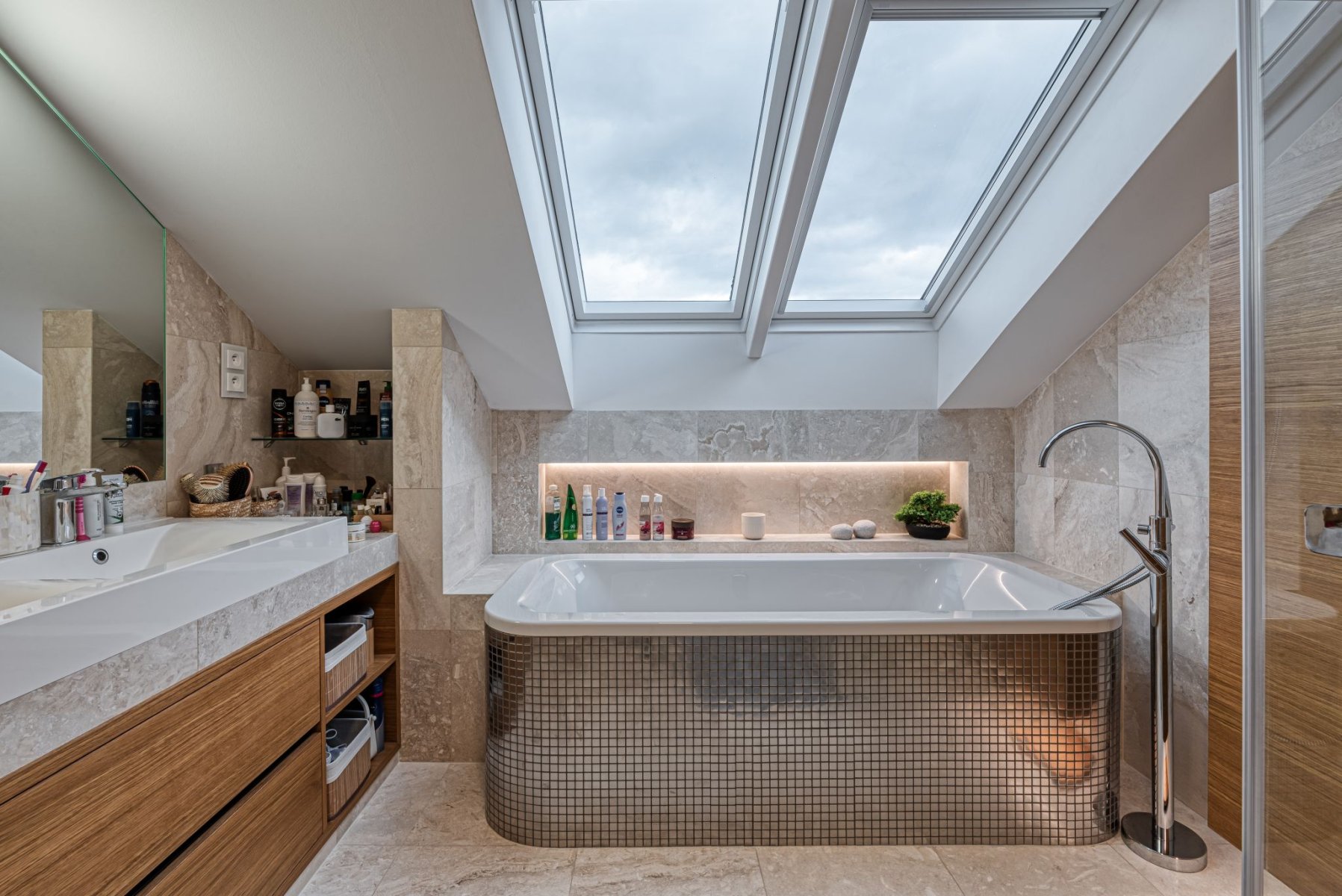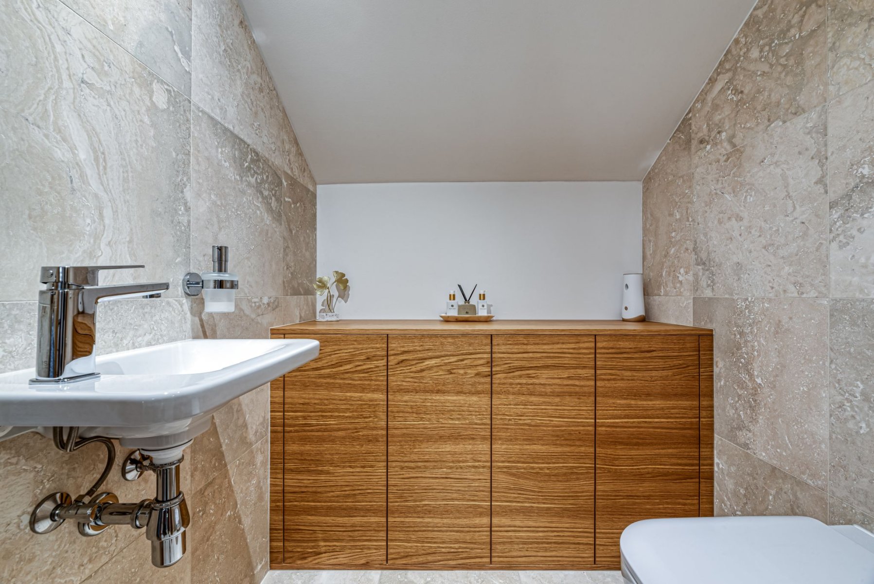 Dřevo, kámen, bílá sanita a chromované detaily tvoří útulný celek