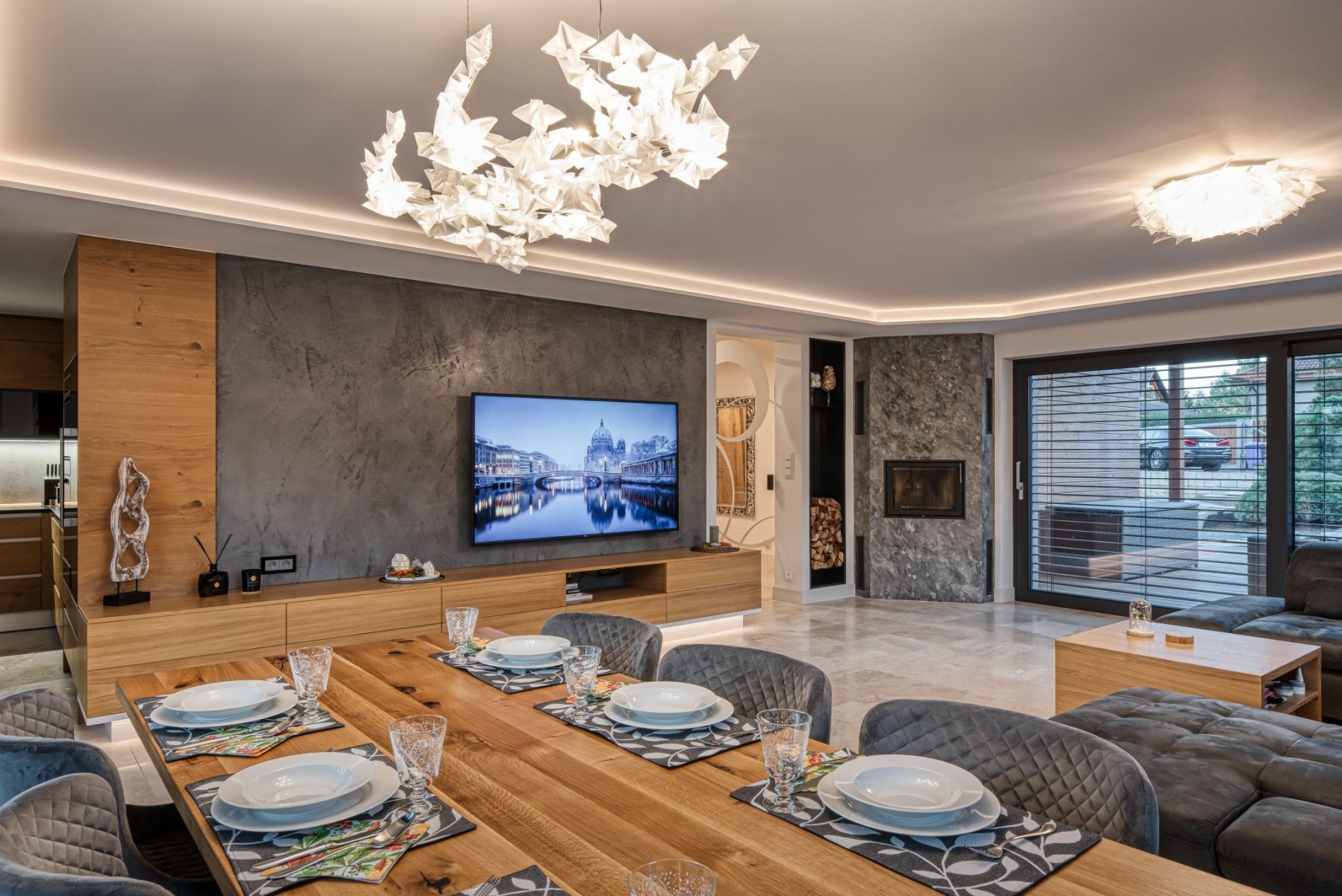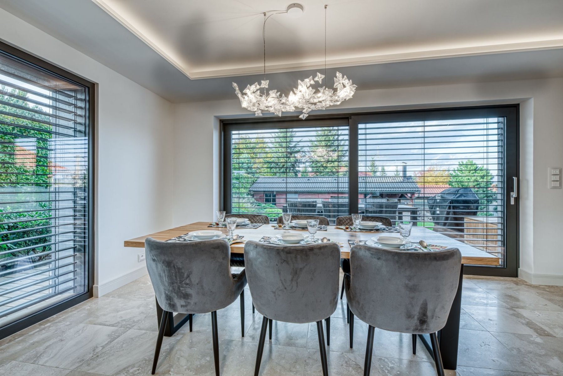 Jídelní stůl se šedými polstrovanými židlemi a krásným lustrem