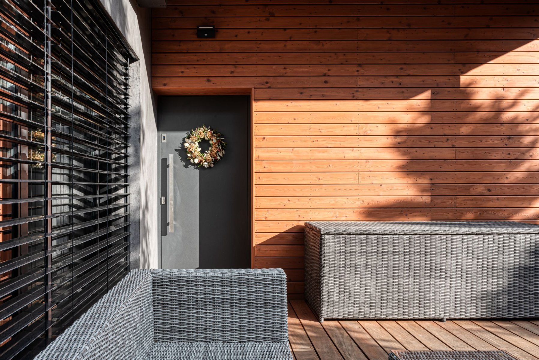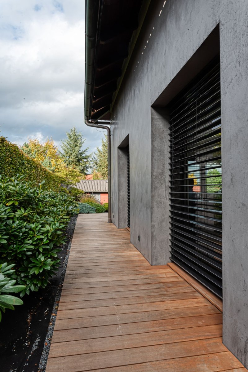 Návrh tohoto rodinného domu a jeho interiéru charakterizují tlumené barevné tóny a jemná kresba kamene, dřeva a betonové stěrky. To vše dokresluje netradiční florální osvětlení a lesklé akcenty skla a kovu. Celý interiér díky tomu působí velmi kompaktně a navozuje pocit klidu a pohody. Dostatek úložných prostor, které byly požadavkem klienta, je řešen na míru a v interiéru působí velmi nenápadně a podtrhuje dojem prostornosti. Na řešení uvnitř domu jsme navázali i v návrhu venkovních ploch, které zvolený koncept přenesly i do provedení zahrady. Vzniklo tak stylové bydlení poskytující majitelům příjemný a praktický prostor pro trávení času s rodinou.