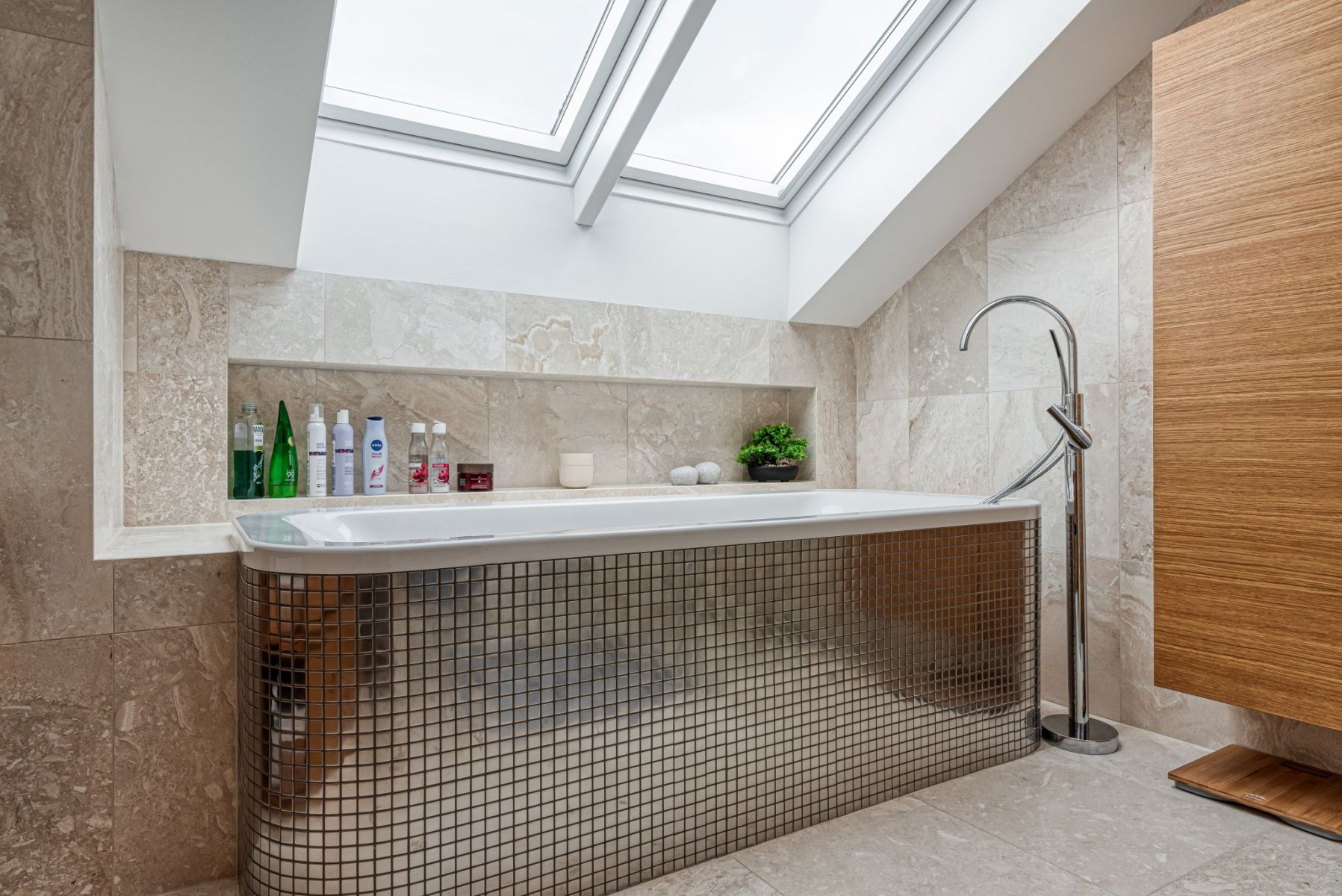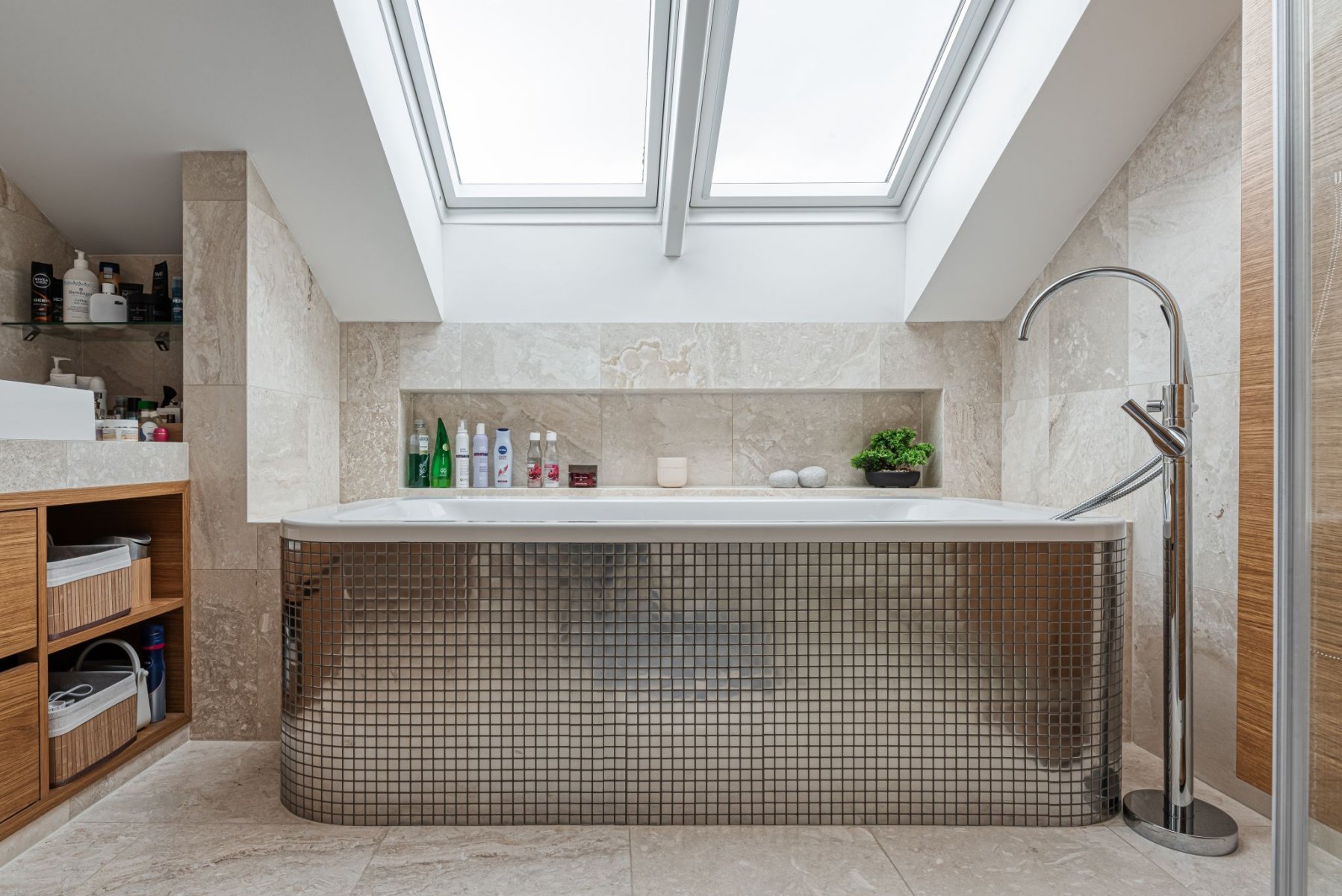 Lesklá mozaika na boku vany tvoří výrazný akcent místnosti