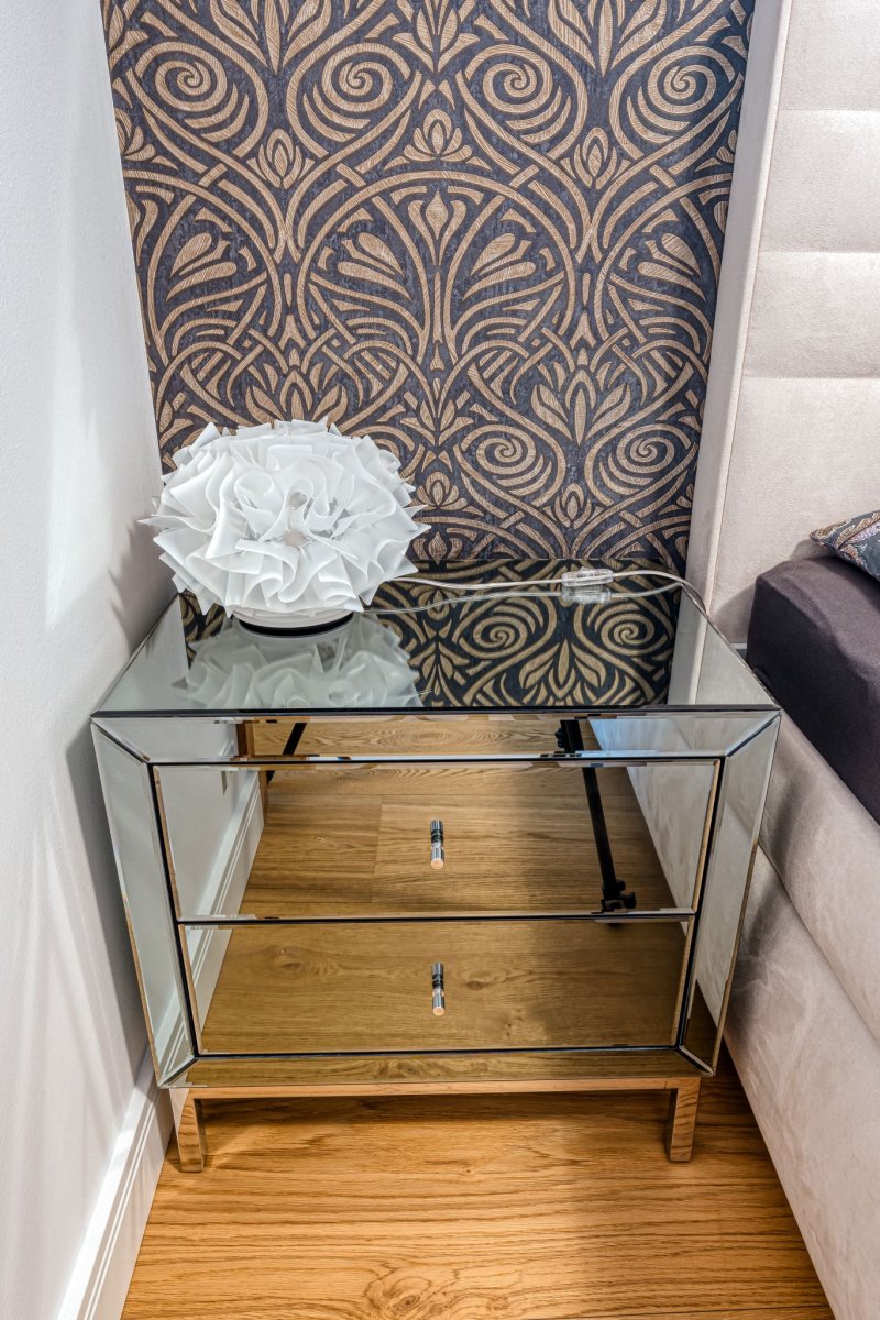 Krásná tapeta je doplněna nočním stolkem se zrcadlovým povrchem a jemným osvětlením