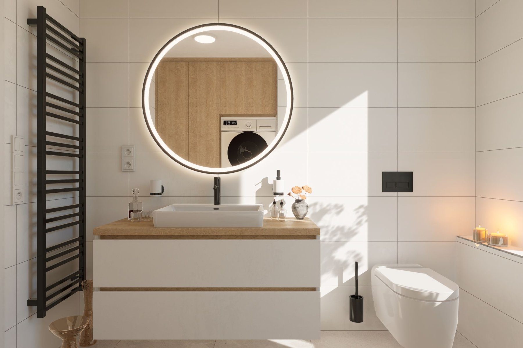 Celý byt je řešen velmi prakticky, aby nájemníkům poskytoval vysoký komfort bydlení. Mysleli jsme na každý detail. Např. v koupelně byly využity obklady velkých formátů pro lepší údržbu, byl zde navržen dostatek úložných prostor, osvětlení zrcadla bylo integrováno přímo v něm a držáky tekutých mýdel nebo toaletního kartáče byly umístěny na stěnu pro snadnější úklid.