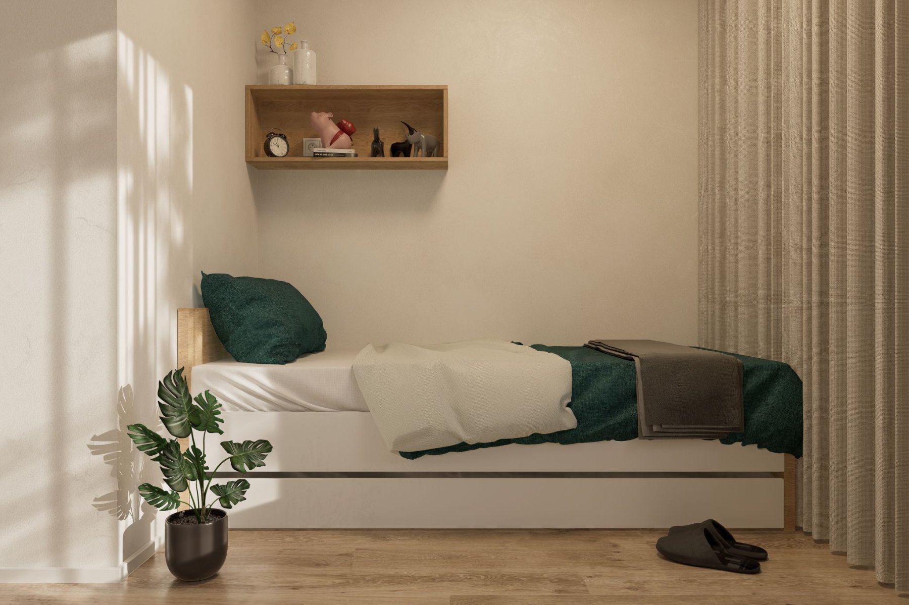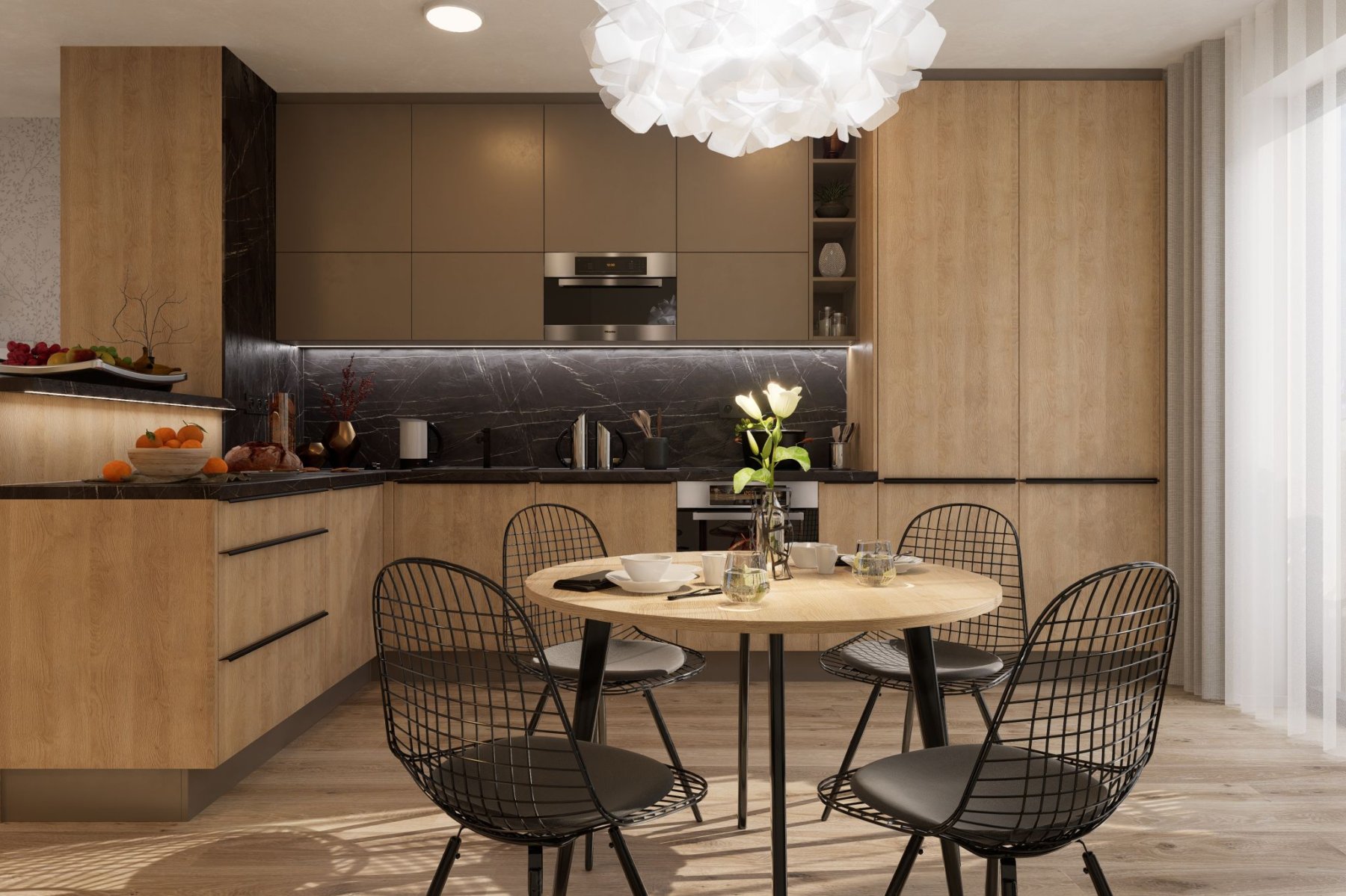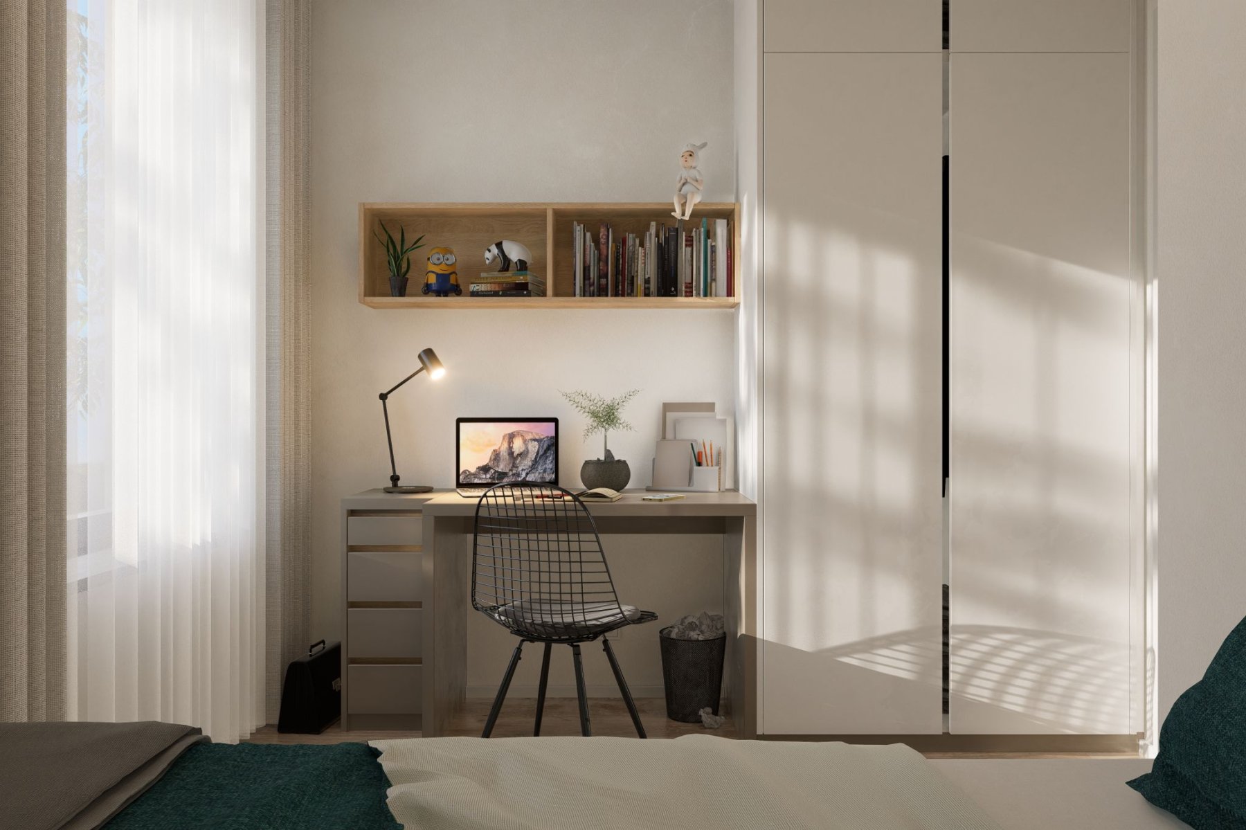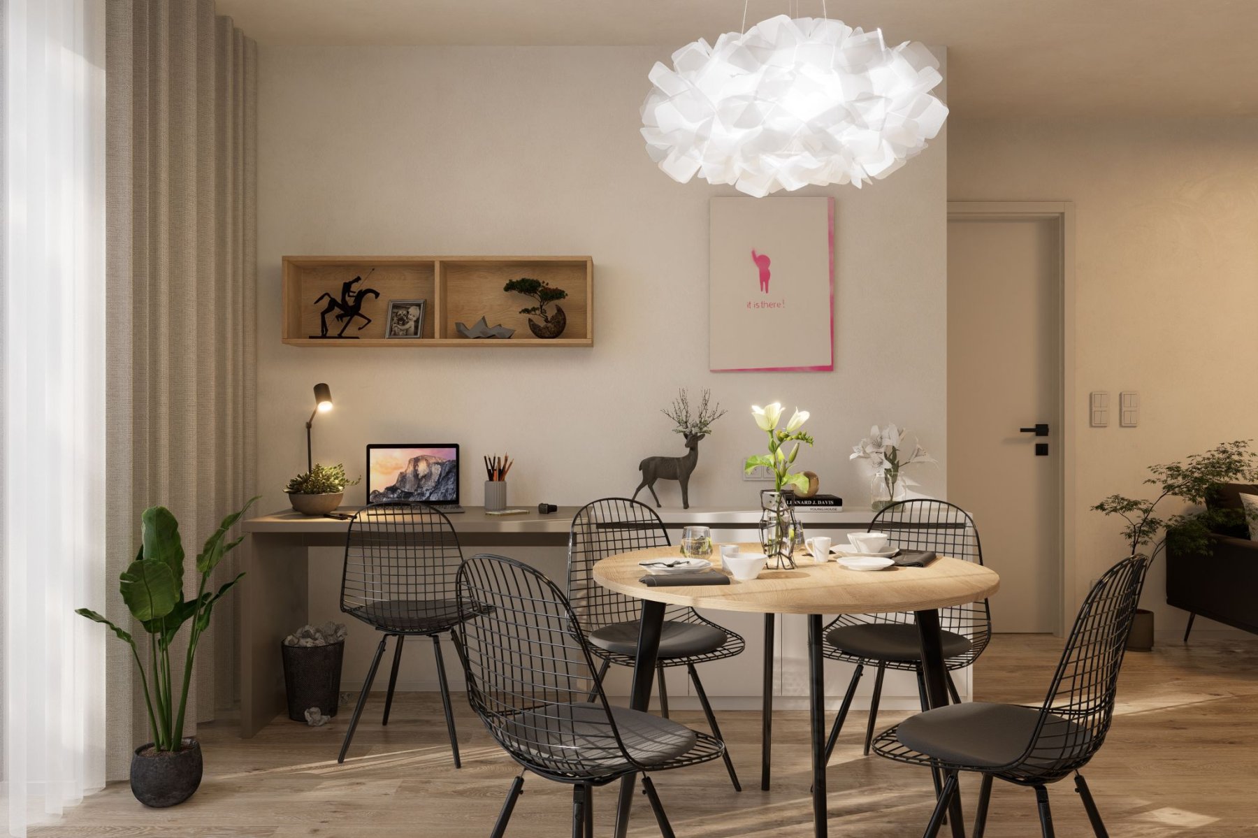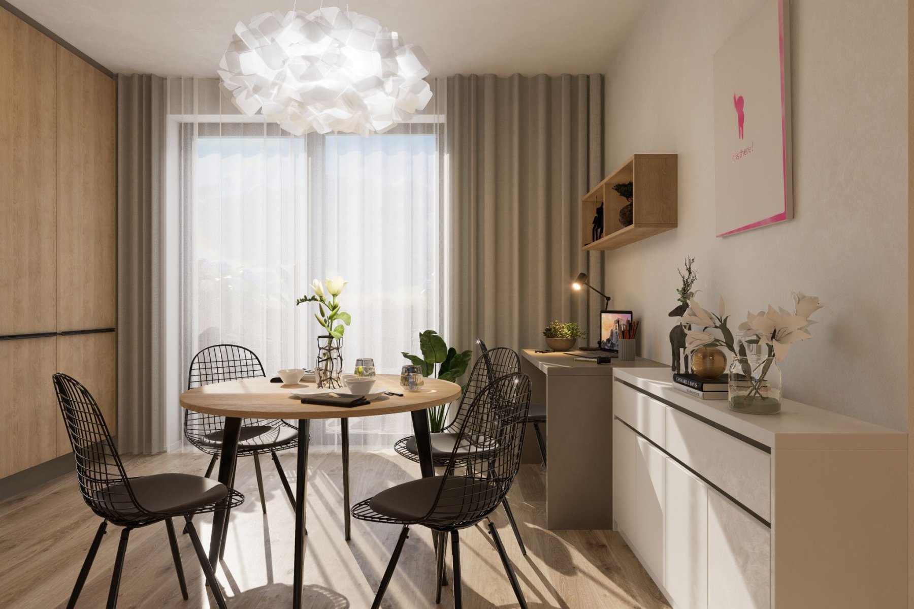 V rámci své práce se specializujeme také na interiéry developerských projektů, kde poskytujeme také službu kompletní realizace. Návrh interiéru tohoto bytu je součástí projektu návrhů interiérů nájemních bytů pro investora v Nymburce. S ohledem na zadání jsme kladli důraz na praktická řešení s dostatkem úložných prostor. Byt má sloužit čtyřčlenné rodině a poskytuje jim k užívání tři místnosti a kuchyňský kout (obývací pokoj s kuchyní a jídelnou, ložnici, dětský/studentský pokoj, vstupní chodbu a koupelnu). Vše jsme navrhli v neutrálních přírodních odstínech bílé, béžové, světle hnědé, šedé, antracitové a dekorech světlého dřeva a tmavého kamene, použili jsme také tapetu s květinovým motivem.