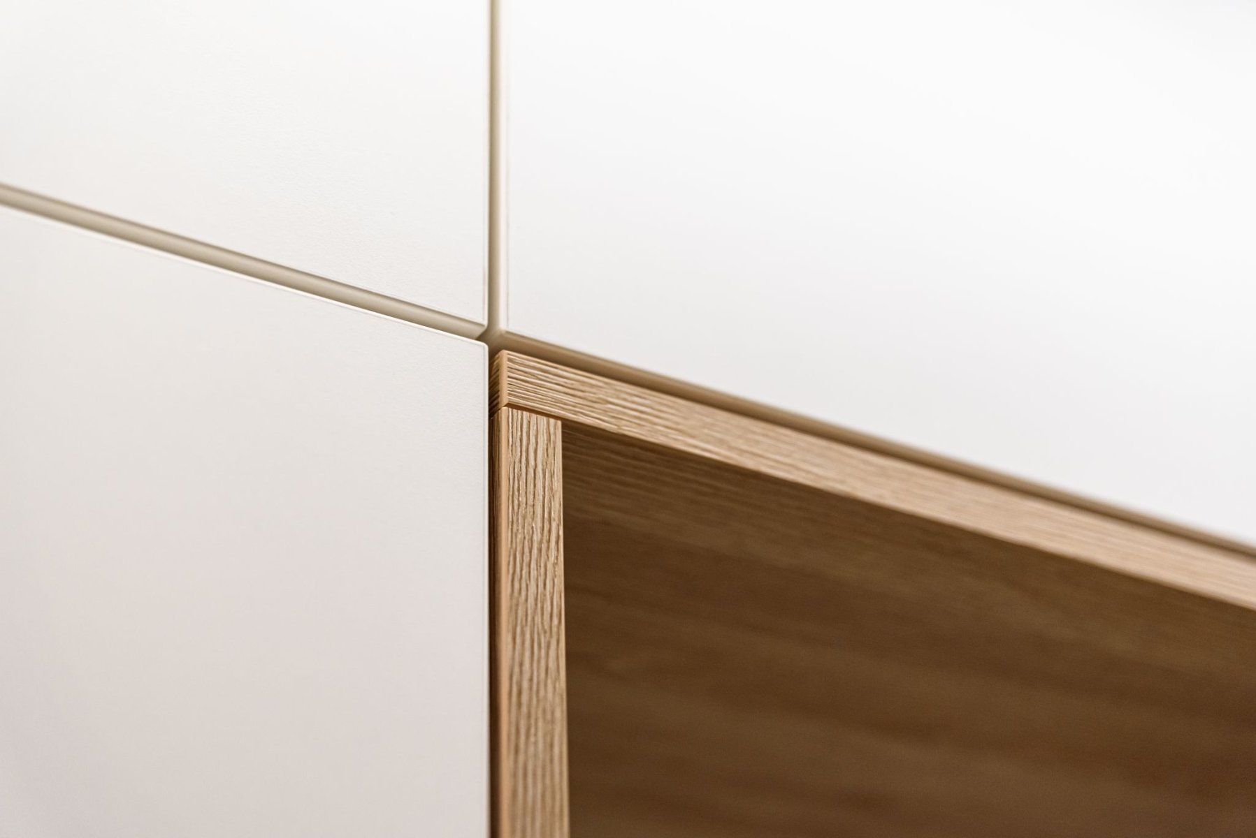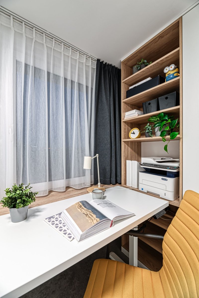 Rekonstrukce panelového bytu je vždy výzvou. Nábytek vytvořený na míru nám umožnil byt plně využít a koncentrovat hodně úložného místa na malém prostoru. Vestavěné skříně po celé výšce a šířce stěn působí jako zesílené stěny, celek vizuálně odlehčují a zároveň zvukově izolují.