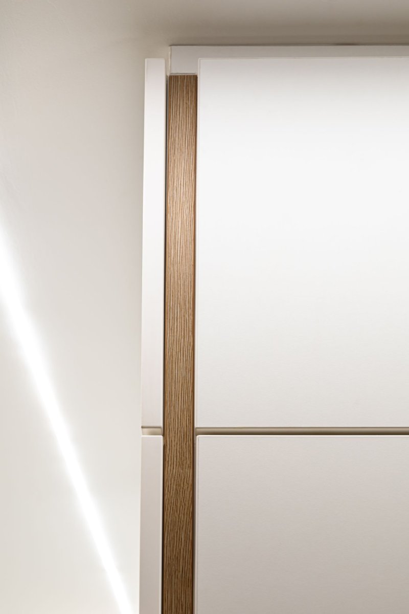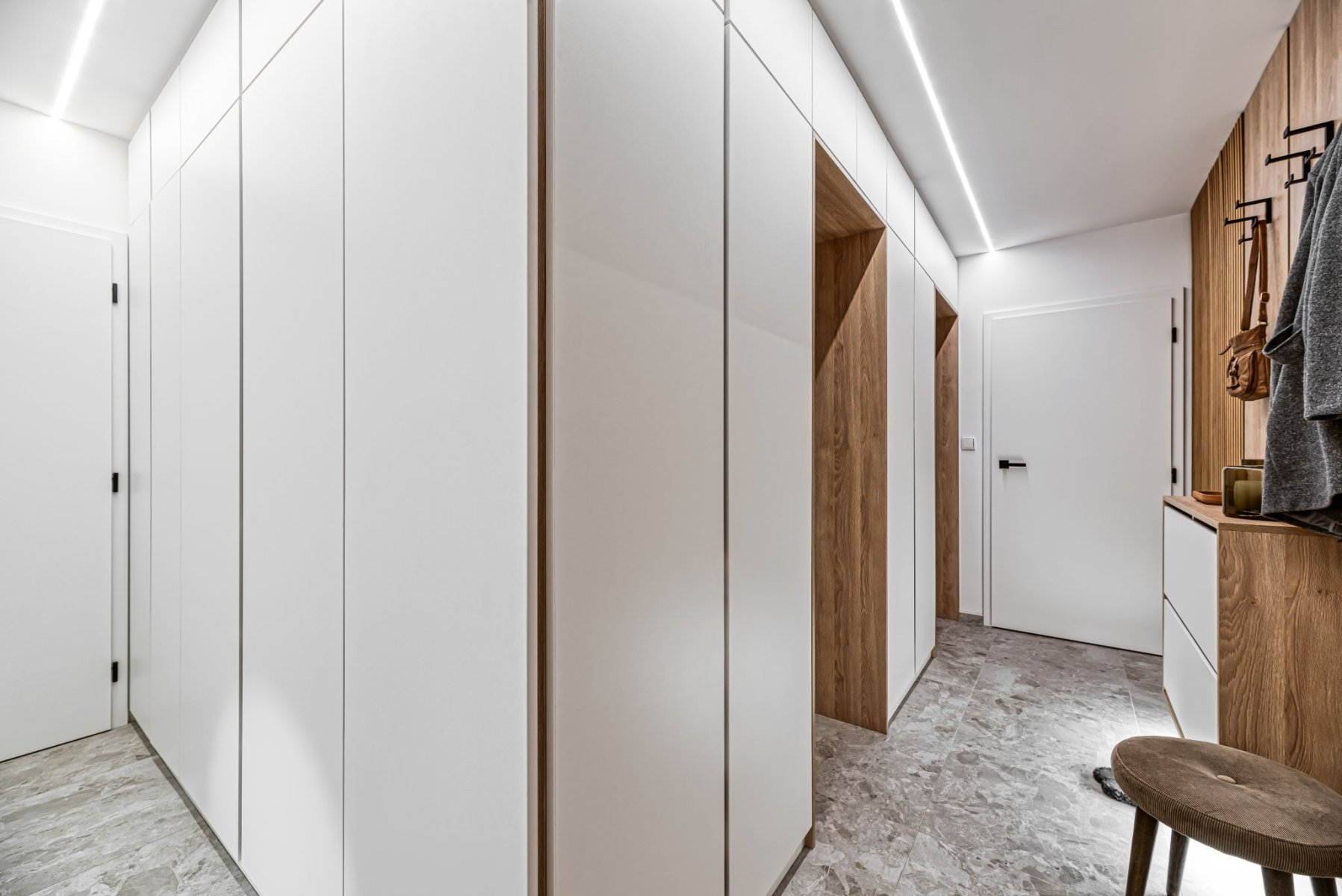 Šatní skříň na míru byla navržena podél celé stěny do chodby, majitelé tak získali maximum úložné plochy.