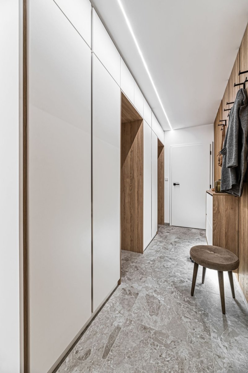 Skříň v chodbě je navržena přes celou výšku a šířku stěn, tvoří tak jakousi širokou stěnu, skrze kterou se vstupuje do koupelny a na toaletu.