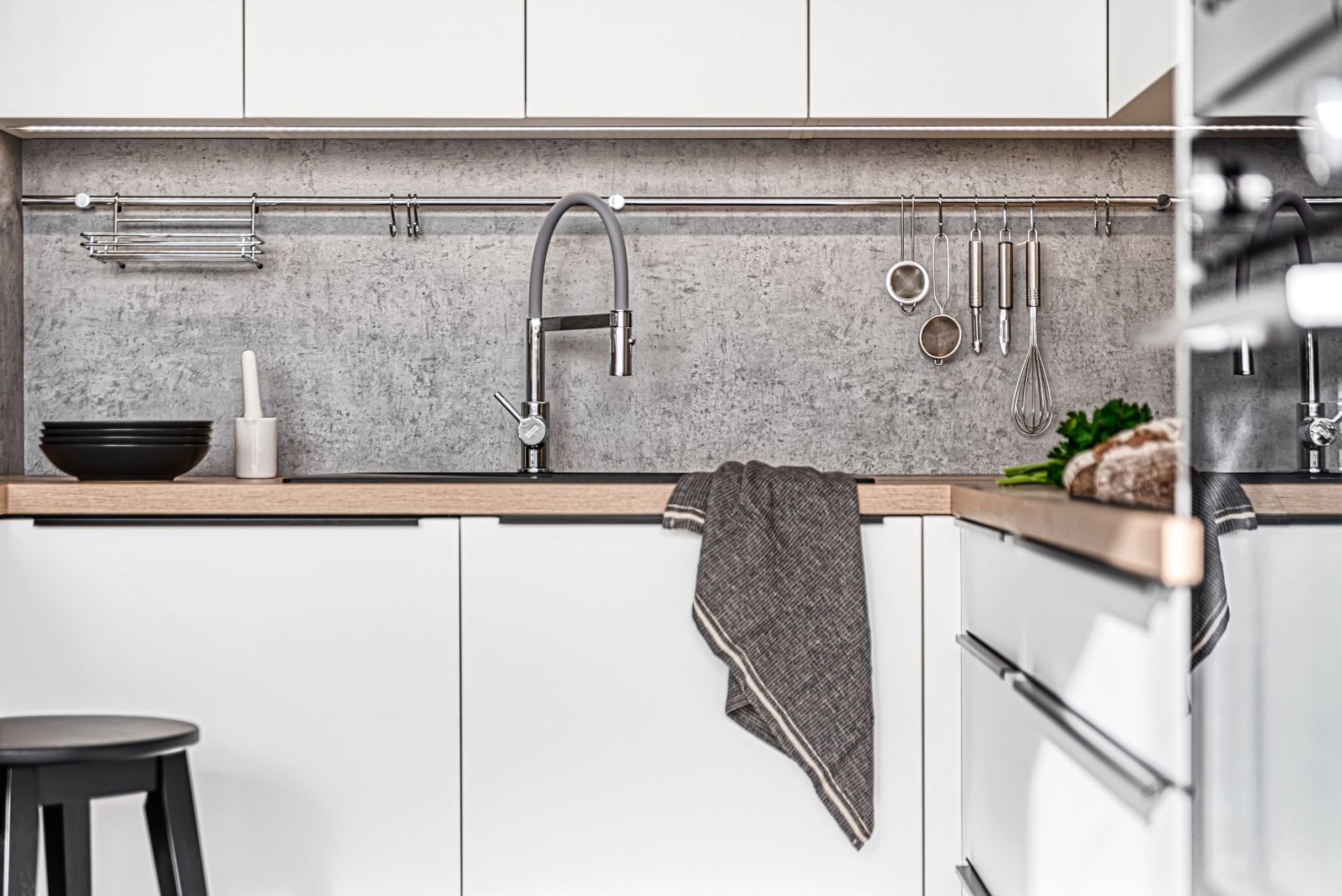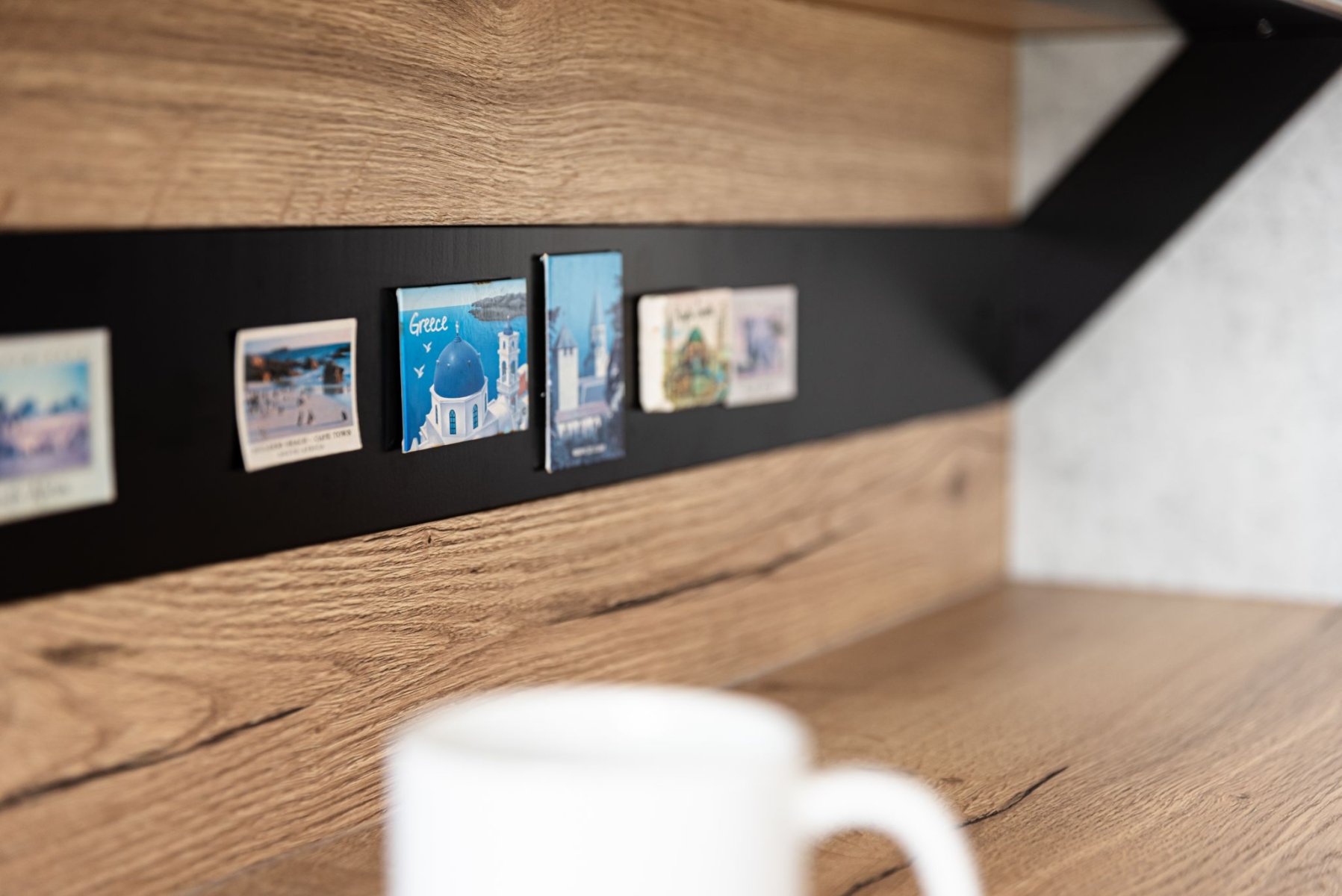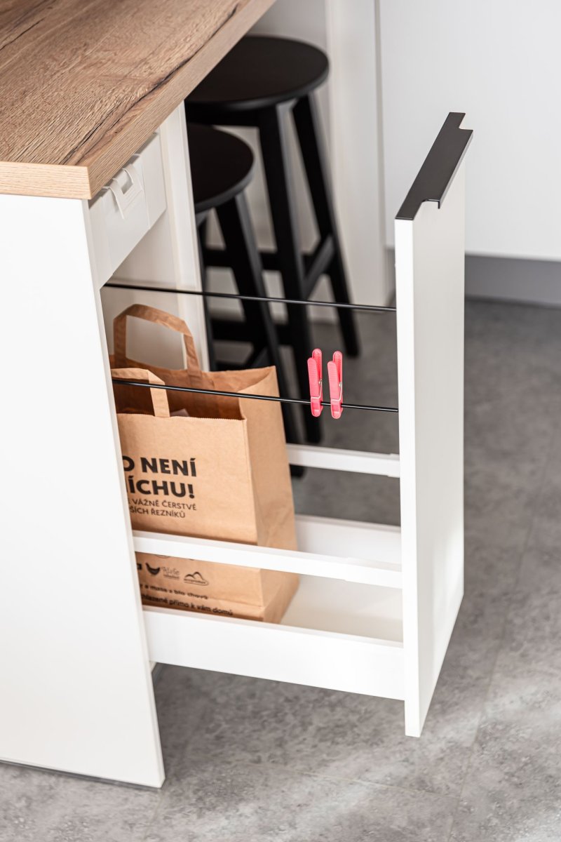 Kuchyňská linka je navržena do detailu. K práci se můžete posadit, napsaný recept pověsit na magnetickou lištu, potřebné kuchyňské náčiní pověsit na nástěnnou lištu...