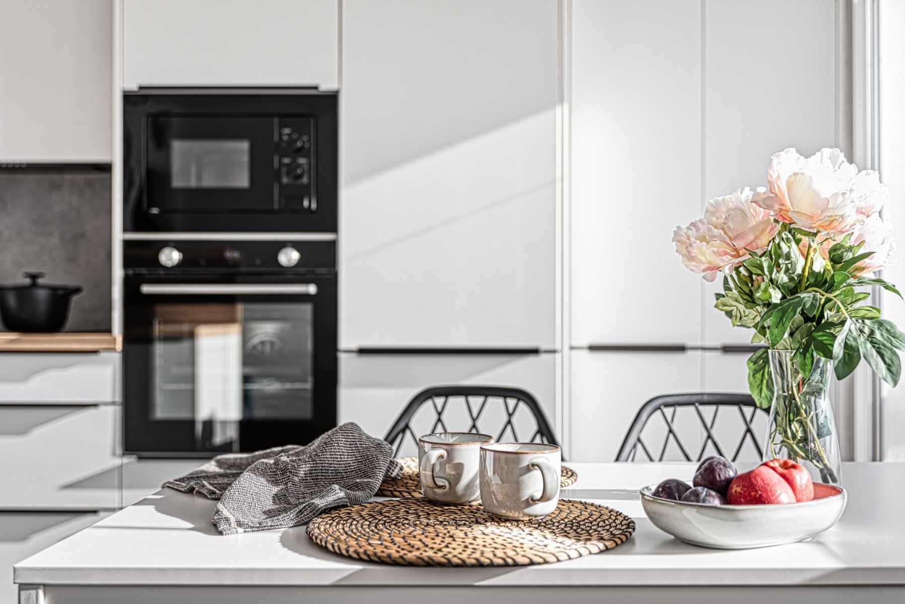 Kuchyňské skříňky jsou vysoké až do stropu, aby poskytovaly co nejvíce úložného prostoru.