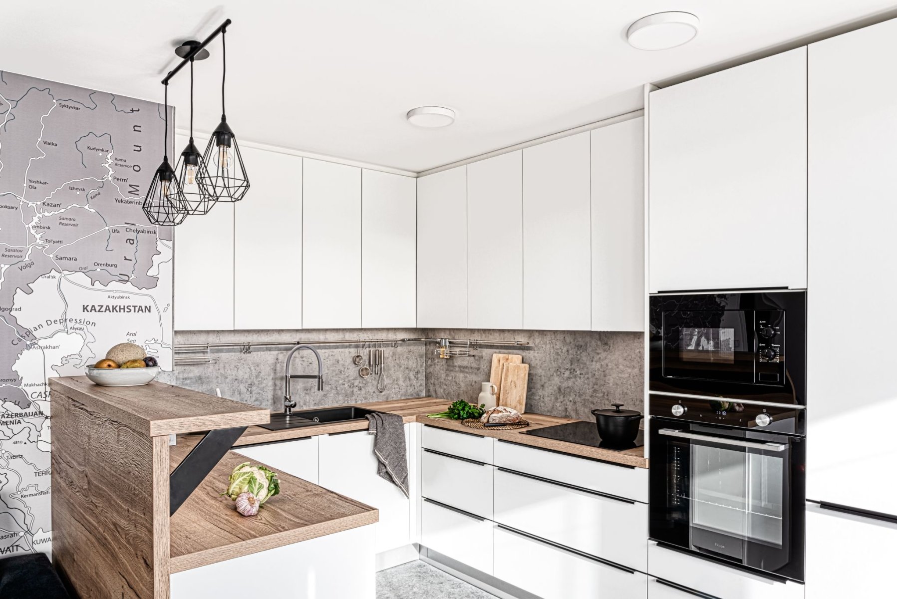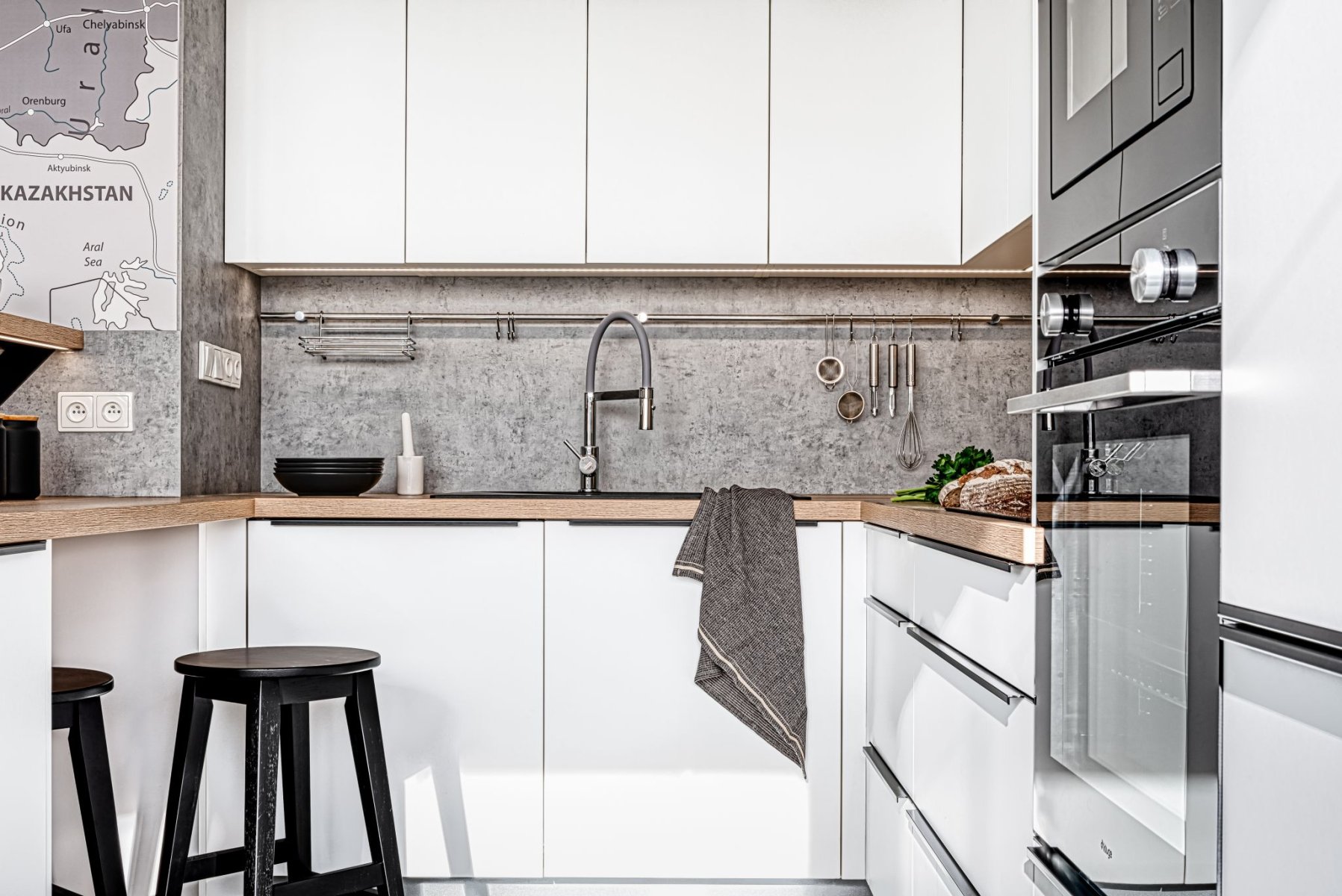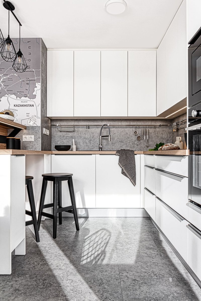 Barevnost kuchyně koresponduje s řešením celého bytu. Dominantní bílé plochy jsou doplněny dekorem kamene a dřeva, černými spotřebiči a dalším vybavením a stříbrnými detaily.