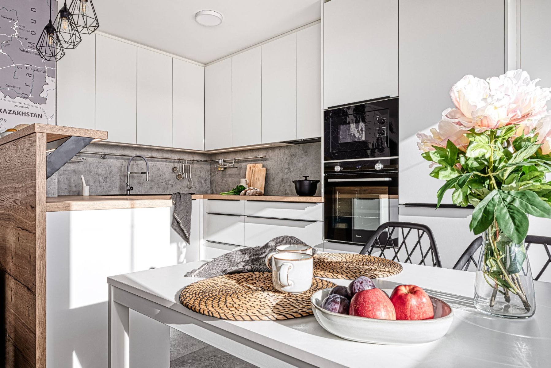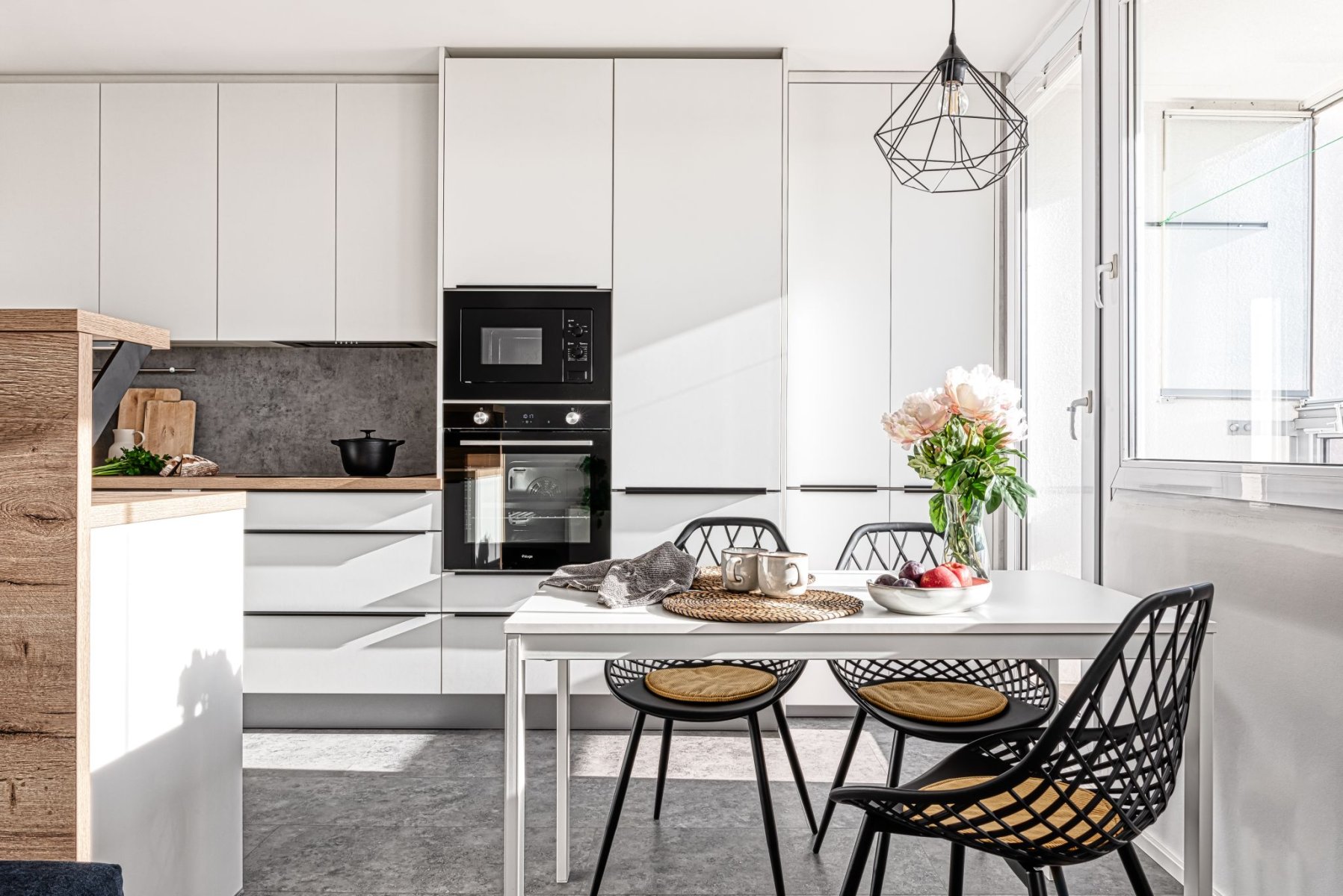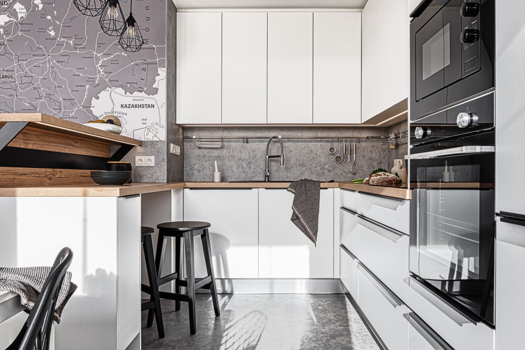 Barevnost kuchyně koresponduje s řešením celého bytu. Dominantní bílé plochy jsou doplněny dekorem kamene a dřeva, černými spotřebiči a dalším vybavením a stříbrnými detaily.