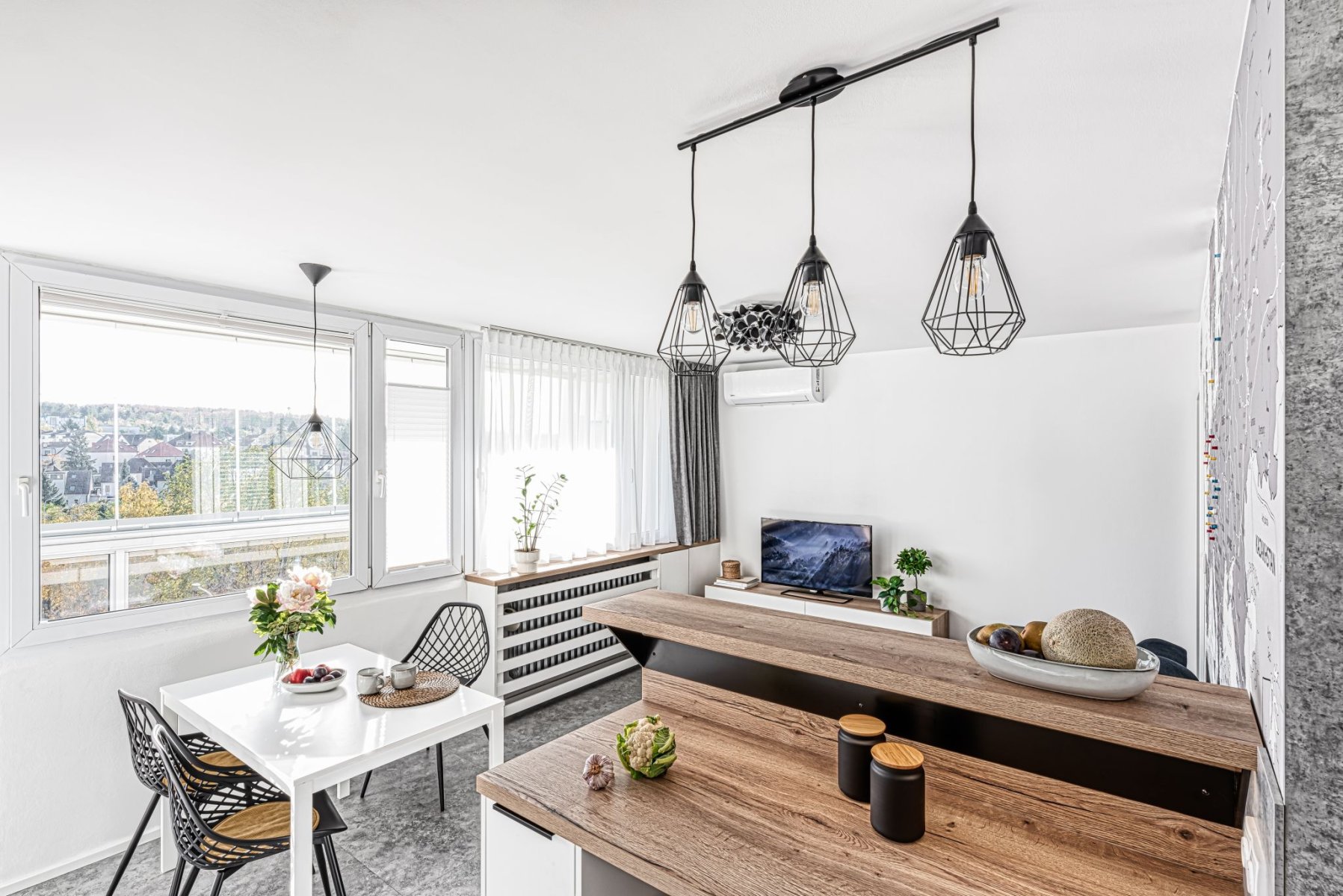 Jídelní stůl prostorově navazuje na kuchyň, díky tomu máte vždy vše po ruce.