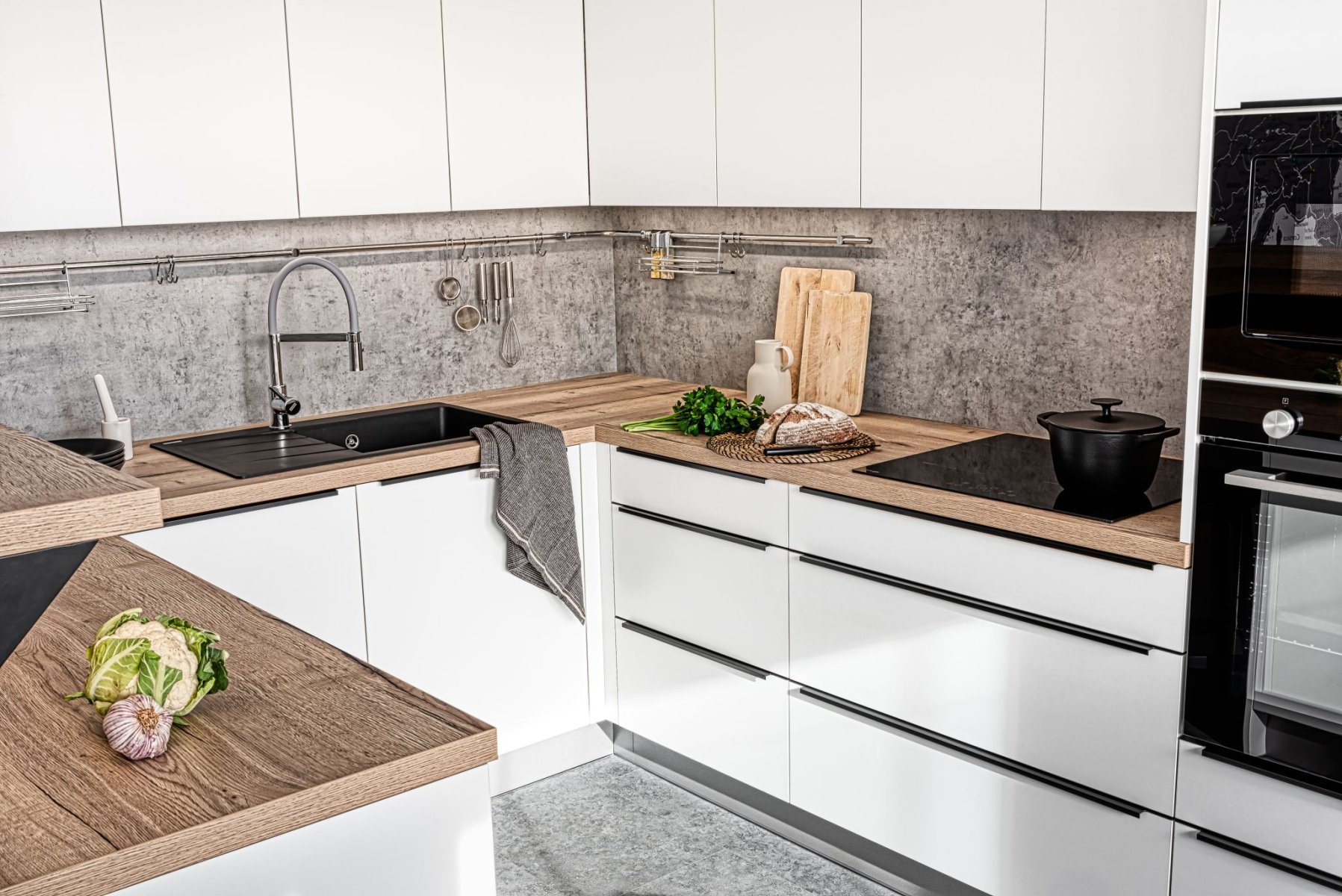Kuchyňská linka prakticky využívá celou výšku stěn, díky tomu může poskytnout dostatek úložné i pracovní plochy.