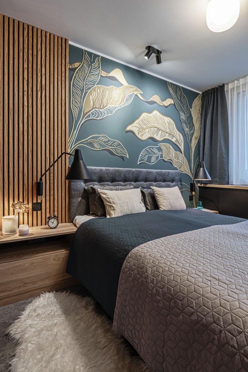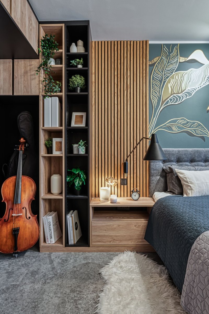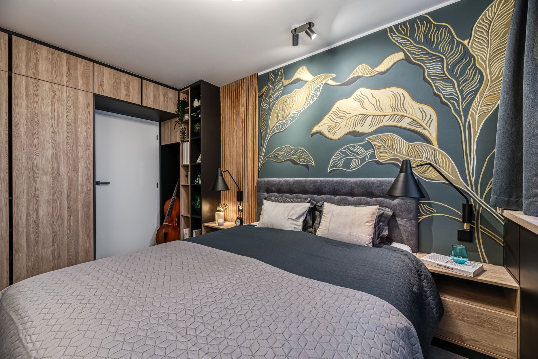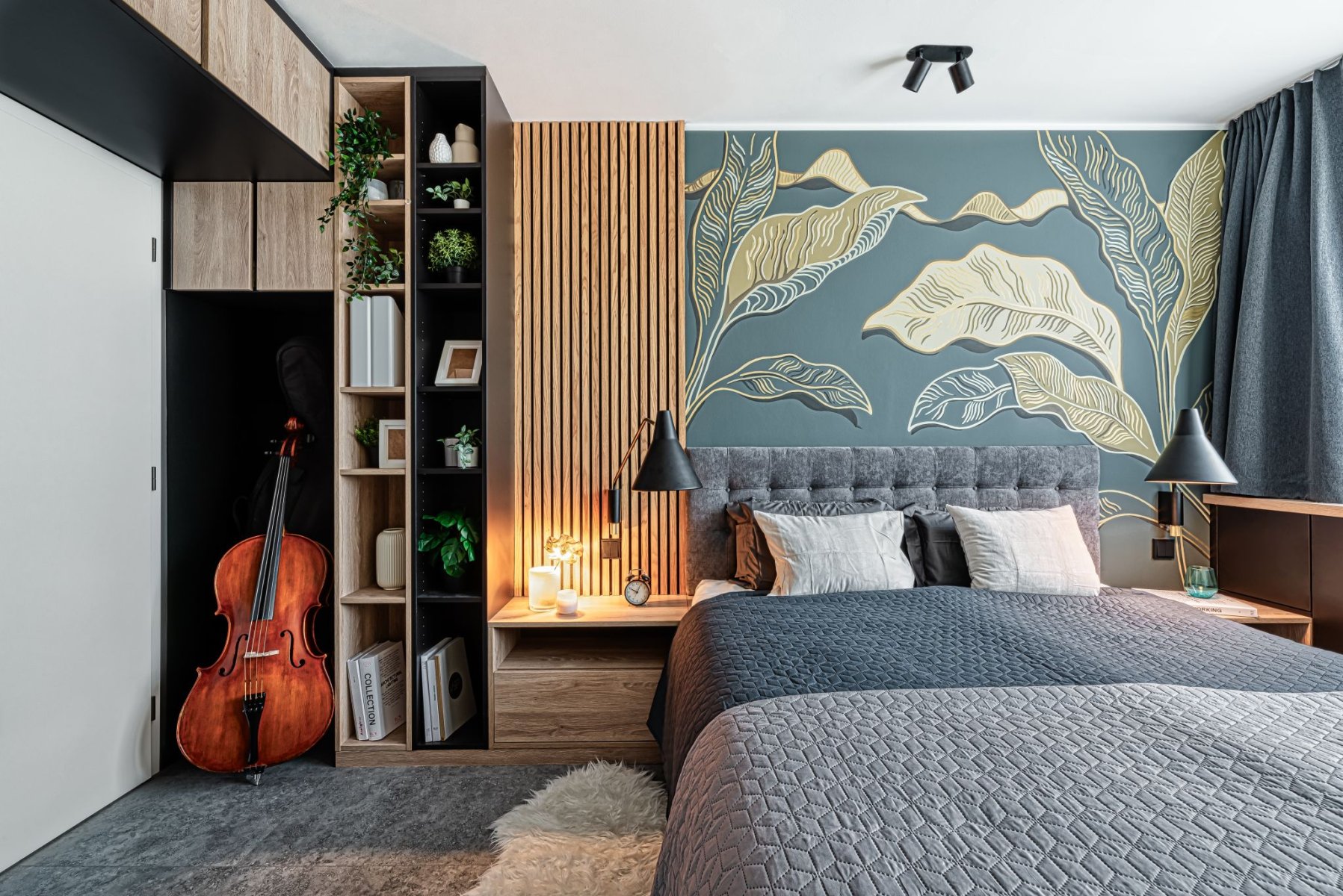 Pro řešení ložnice jsme zvolili odlišnou barevnou škálu. Celý pokoj je navržen do tmavších uklidňujících tónů. Pokoji dominuje nástěnná malba se zlatavými listy a vybavení v dekoru dřeva. Vše je doplněno jemnými a příjemnými textiliemi a tmavými detaily. Do pokoje se prochází “skříňovou stěnou”, díky které pokoj mohl zůstat vzdušný. A své místo tu našlo i violoncello!