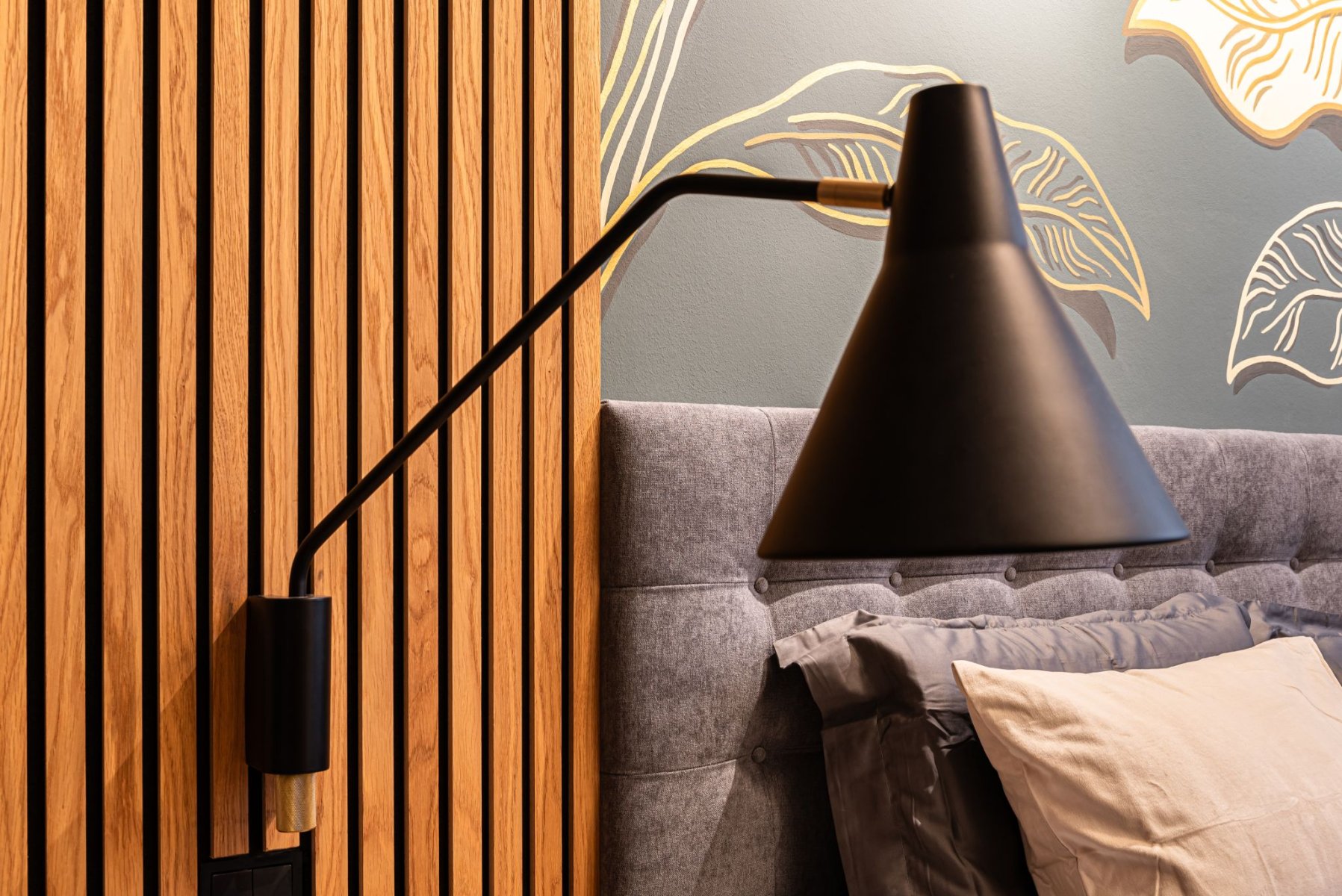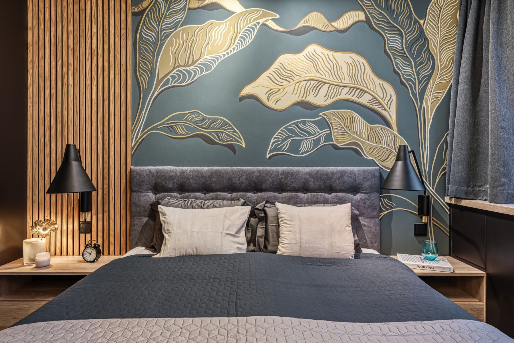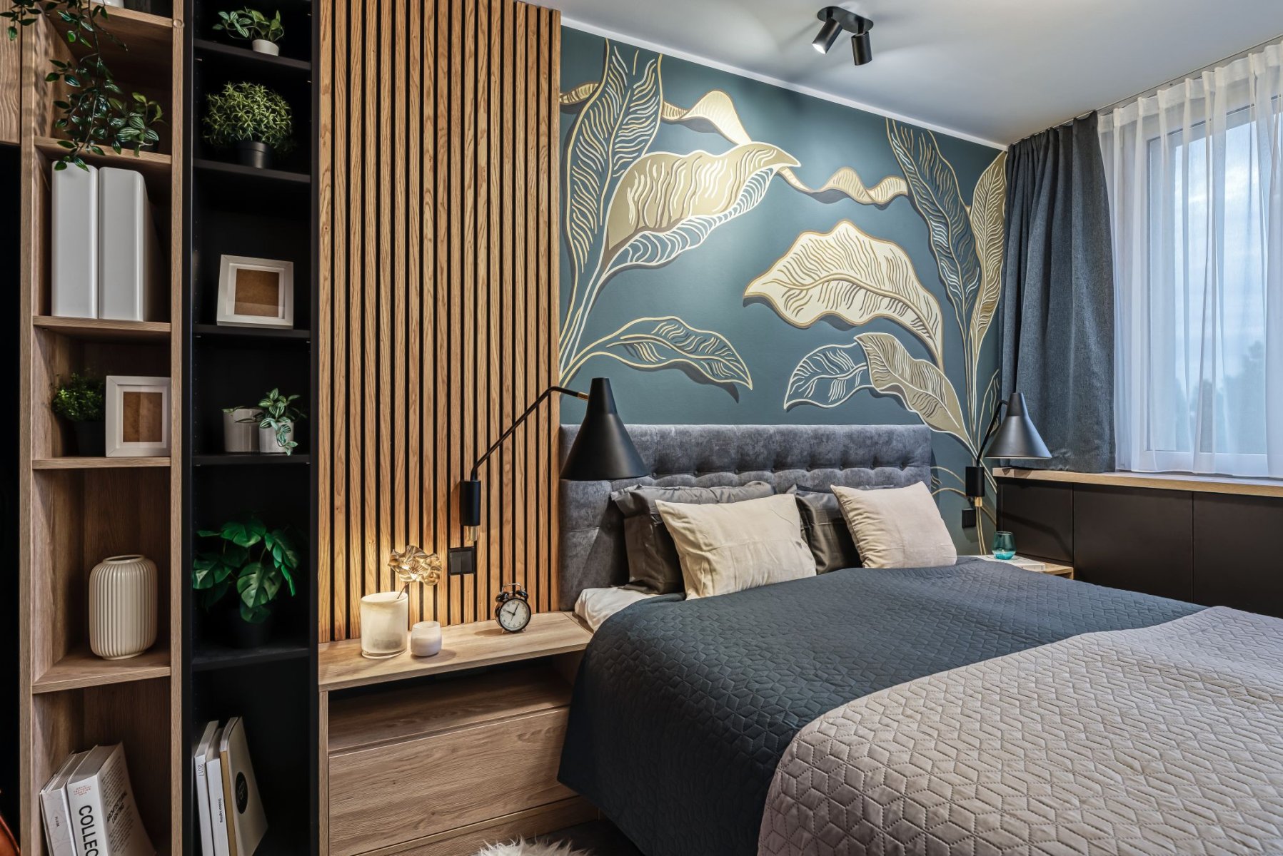 Pro řešení ložnice jsme zvolili odlišnou barevnou škálu. Celý pokoj je navržen do tmavších uklidňujících tónů. Pokoji dominuje nástěnná malba se zlatavými listy a vybavení v dekoru dřeva. Vše je doplněno jemnými a příjemnými textiliemi a tmavými detaily. Do pokoje se prochází “skříňovou stěnou”, díky které pokoj mohl zůstat vzdušný. A své místo tu našlo i violoncello!