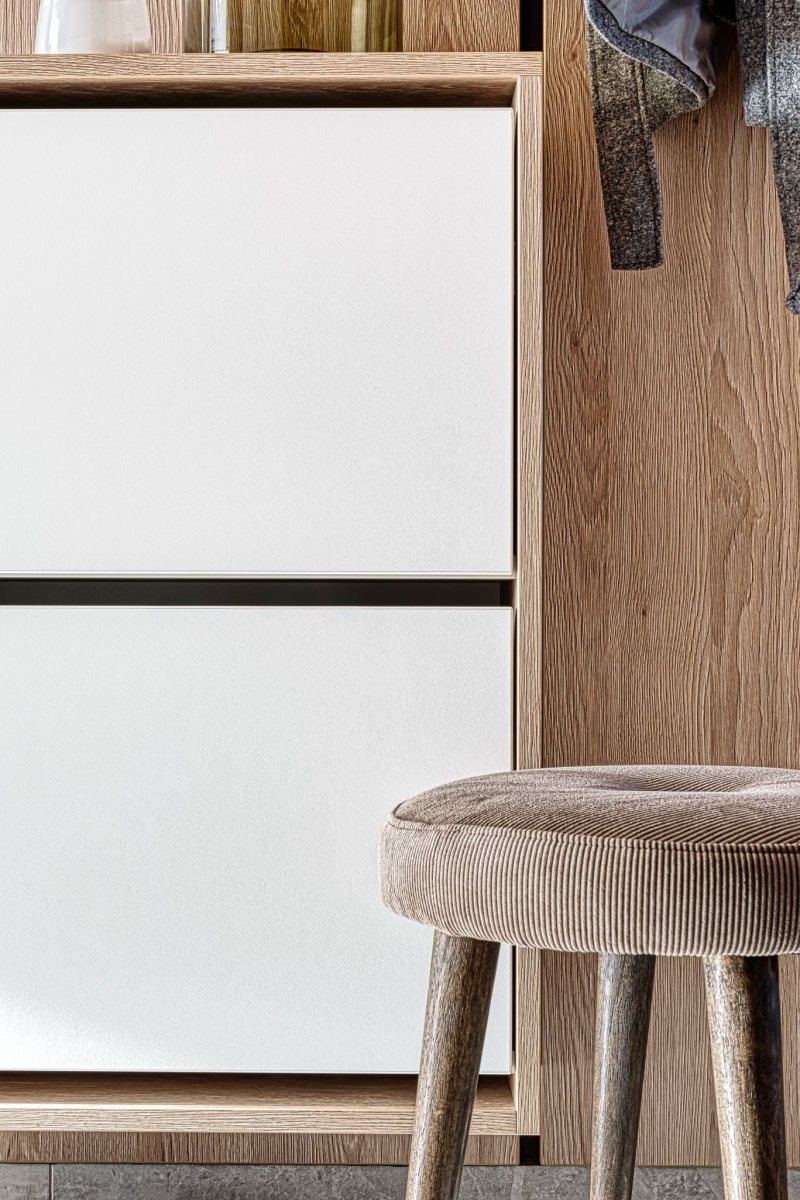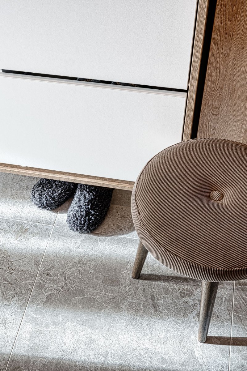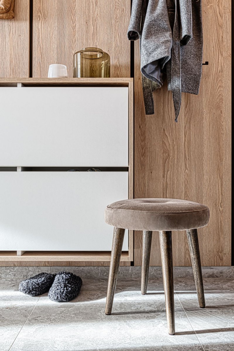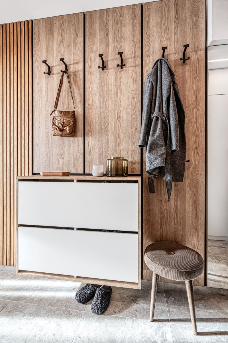 Ve vstupní chodbě naleznete botník se stoličkou a praktické háčky umístěné na zajímavém obkladu stěny.