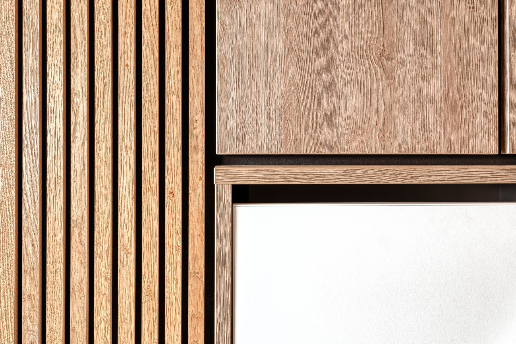 Obývací pokoj s kuchyní jsme rozčlenili do dvou zón tak, aby vše bylo prakticky propojené a zároveň maximálně funkční. Zatímco kuchyňská část nabízí množství úložných prostor, obývací zónu jsme ponechali volnější, aby zde bylo místo pro hry dětí i pro odpočinek.