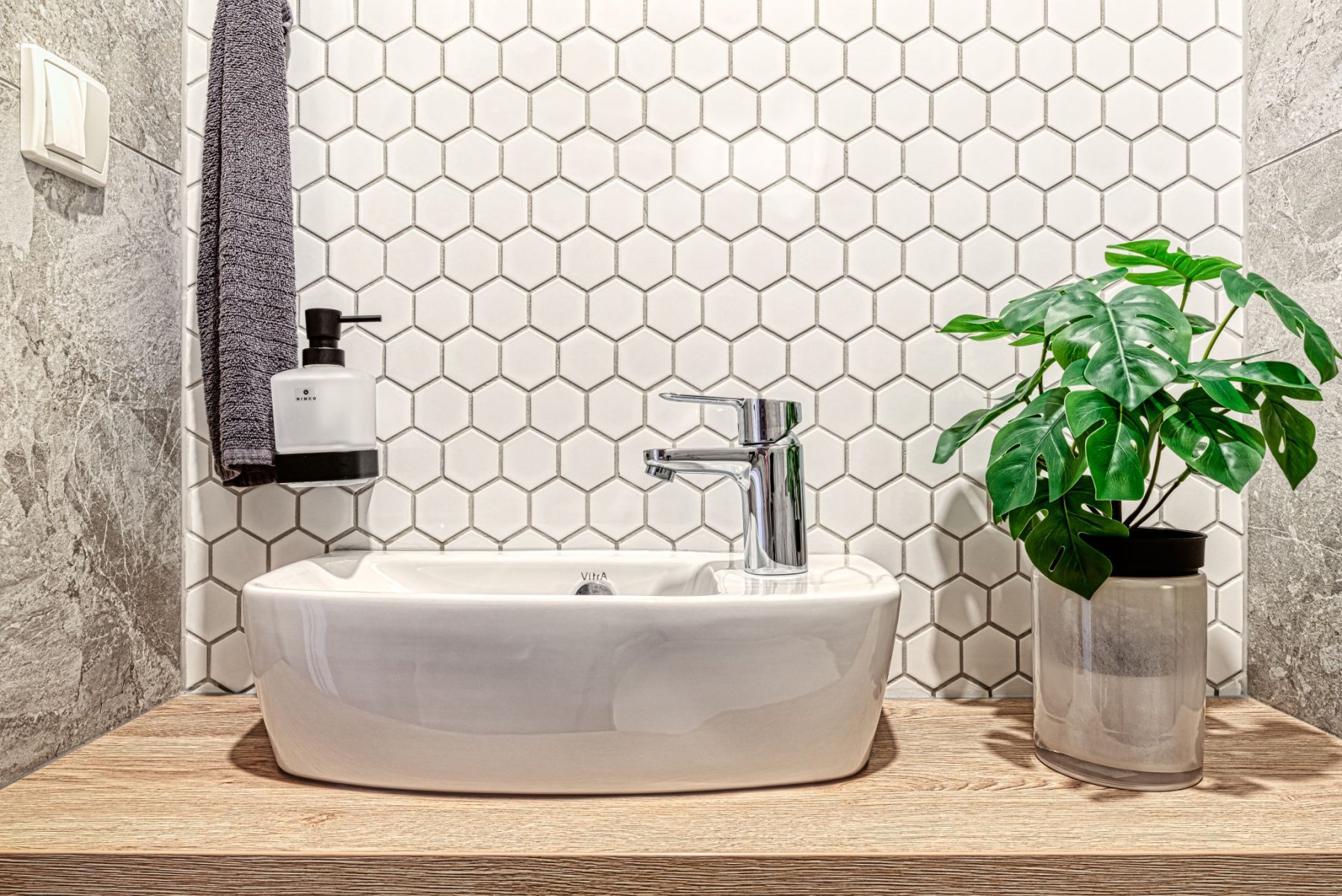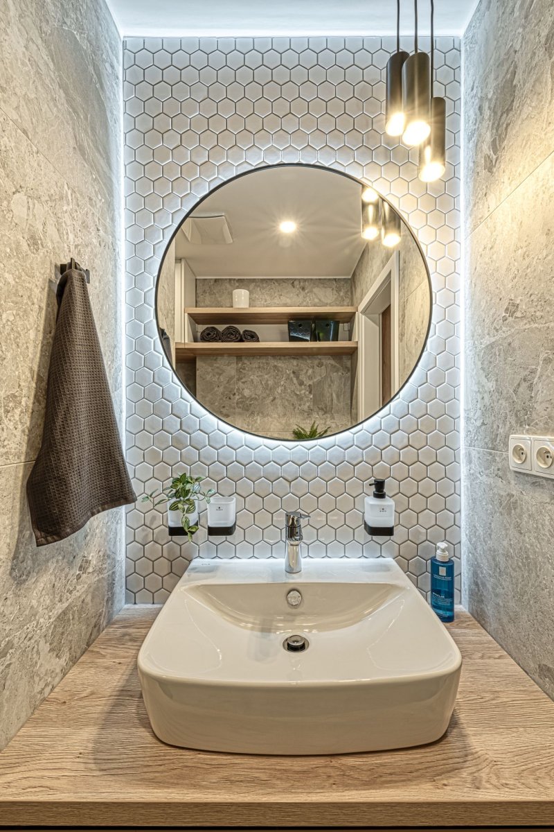 Obklad za umyvadlem je z bílé mozaiky, která krásně doplňuje obklad se vzorem kamene.