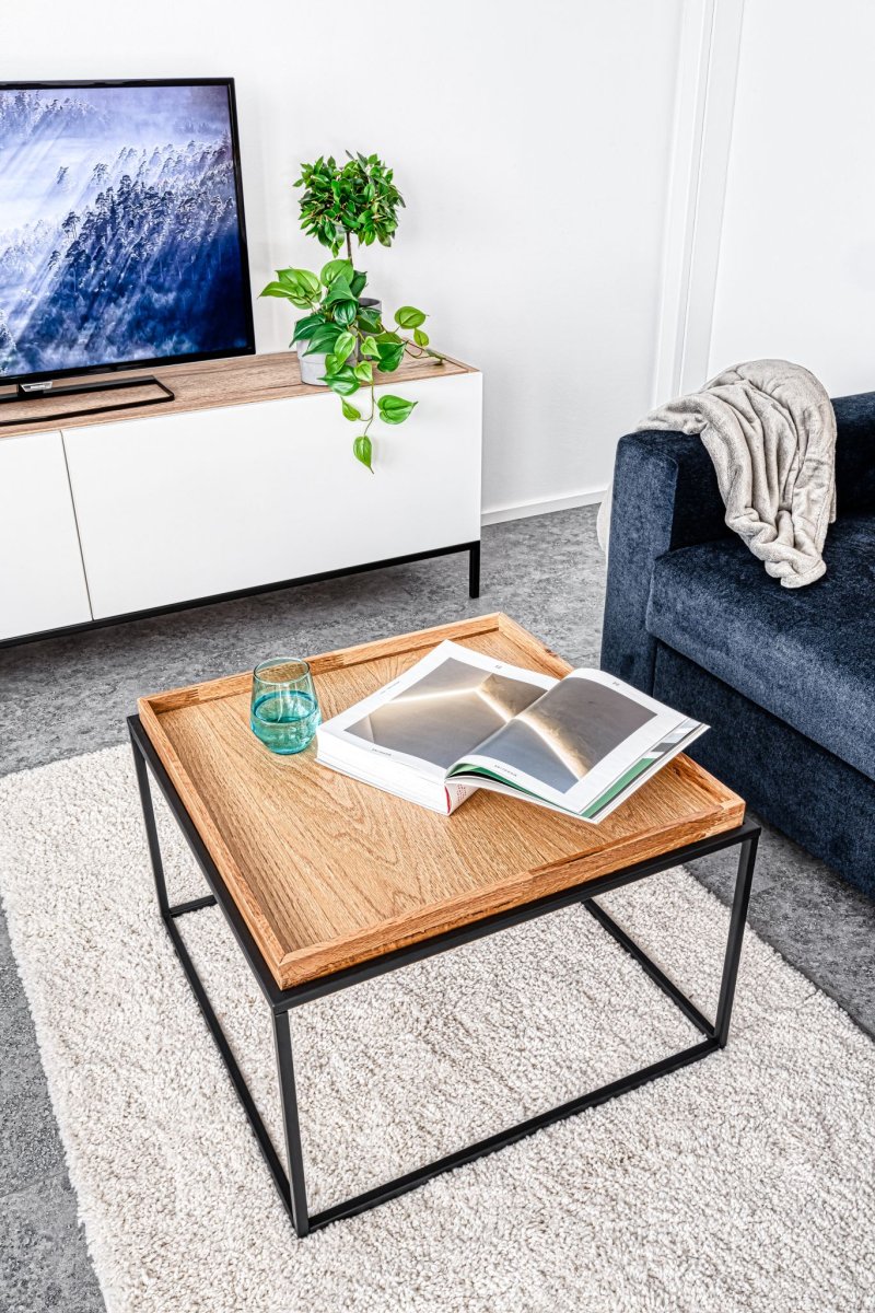 Sedací souprava je doplněna subtilnějším kávovým stolkem. Pokud tedy chcete odpočívat, snadno stolek posunete a gauč roztáhnete.