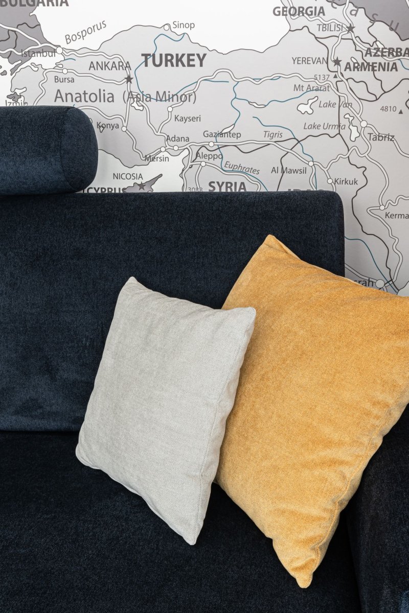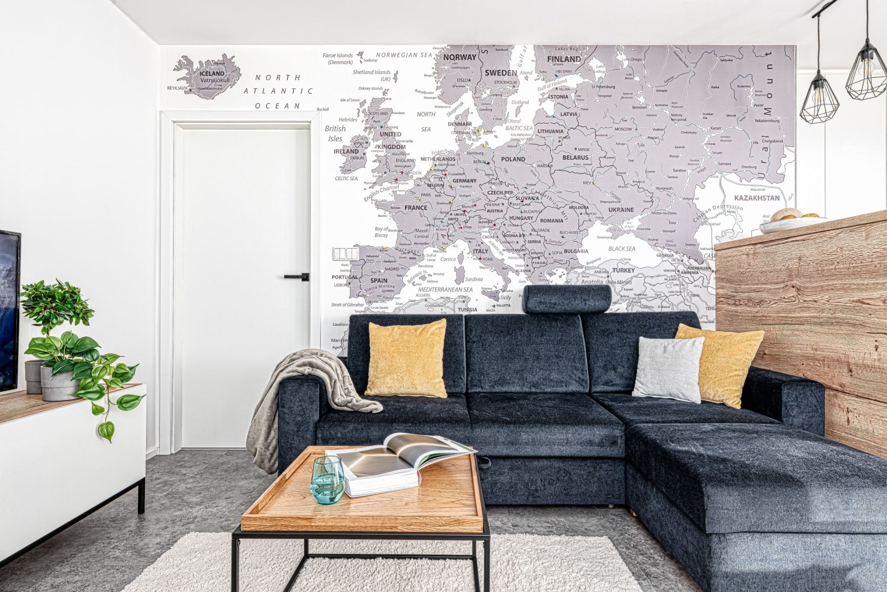 Tapeta v obývacím pokoji je navržena na míru. Majitelé bytu často cestují a zde si mohou své cesty zaznamenávat.