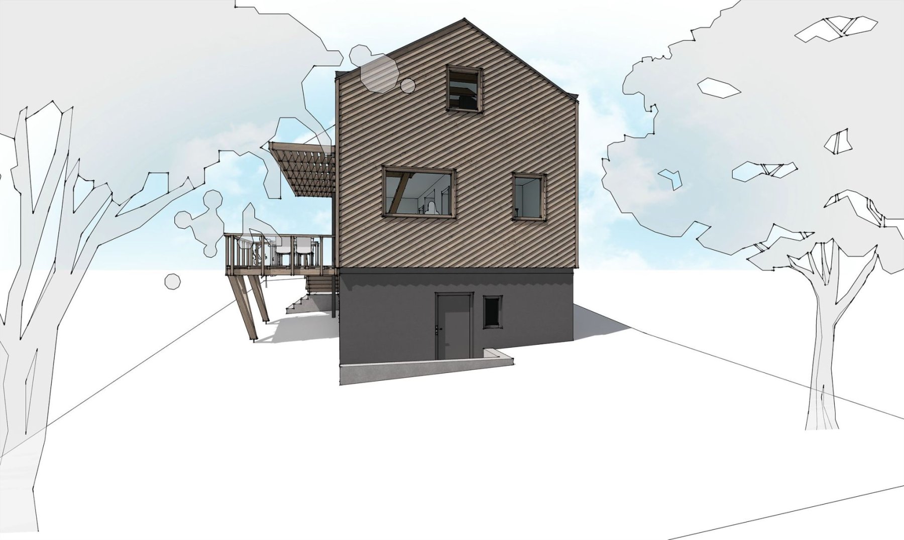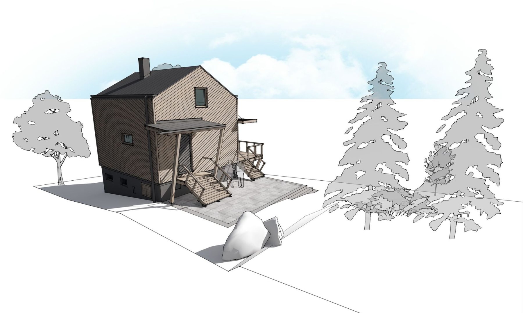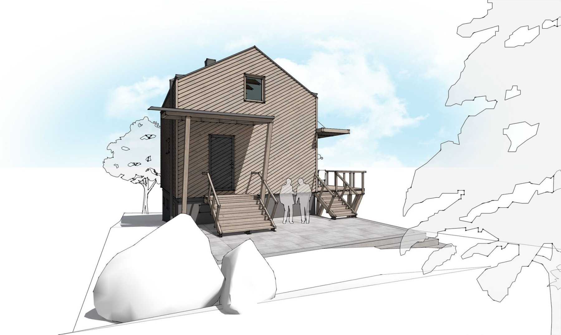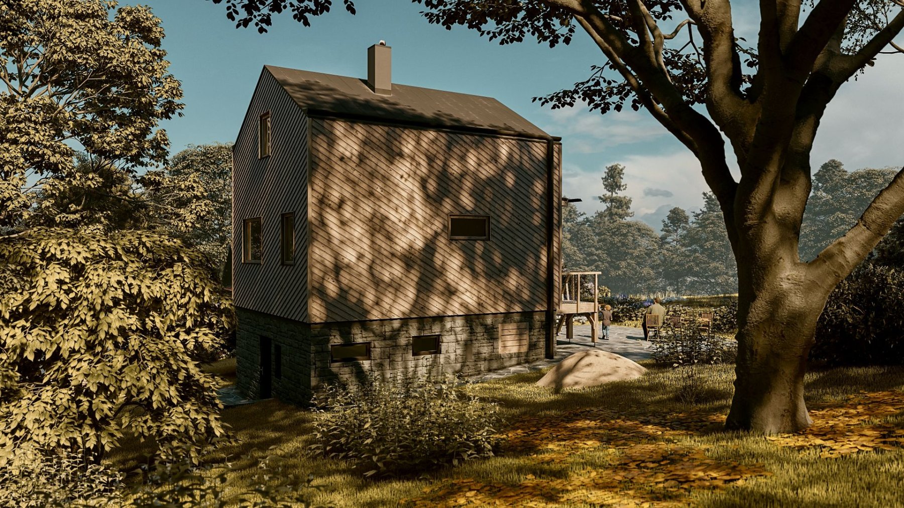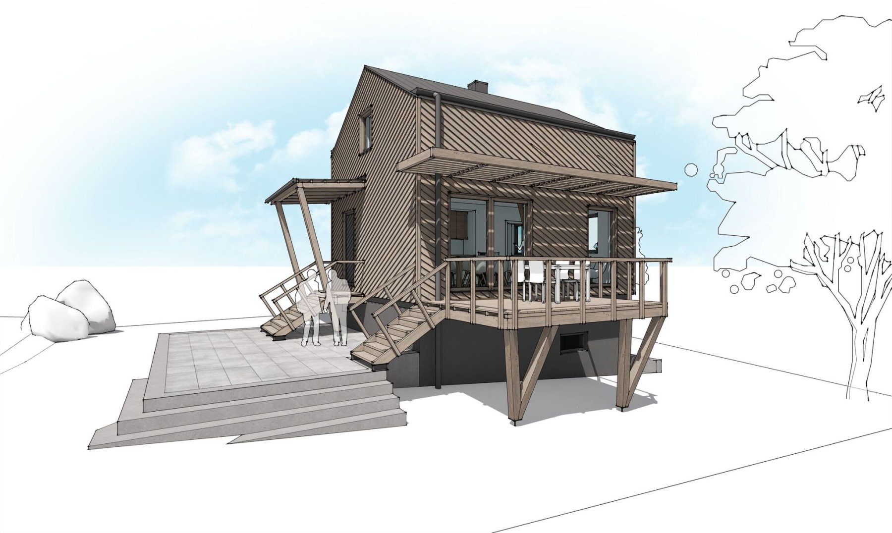 Zadáním bylo zrekonstruovat chatu nacházející se v chatové osadě poblíž Berouna. Měla odpovídat současným trendům a požadavkům na užívání. Vznikl tak návrh originální dřevostavby na stávajícím zděném základu. Jejím osobitým prvkem je dřevěná fasáda z nakloněných prken. Ta vytváří hru světla a stínu a působí tak skoro jako grafický prvek.