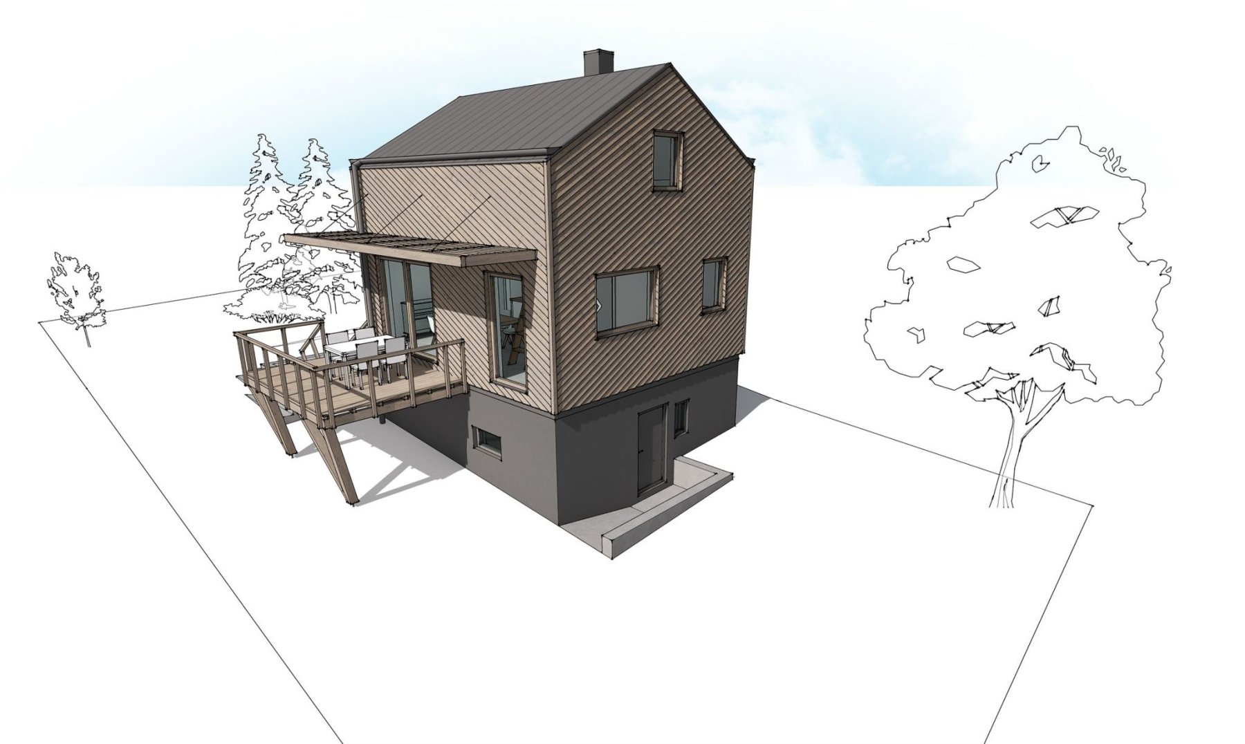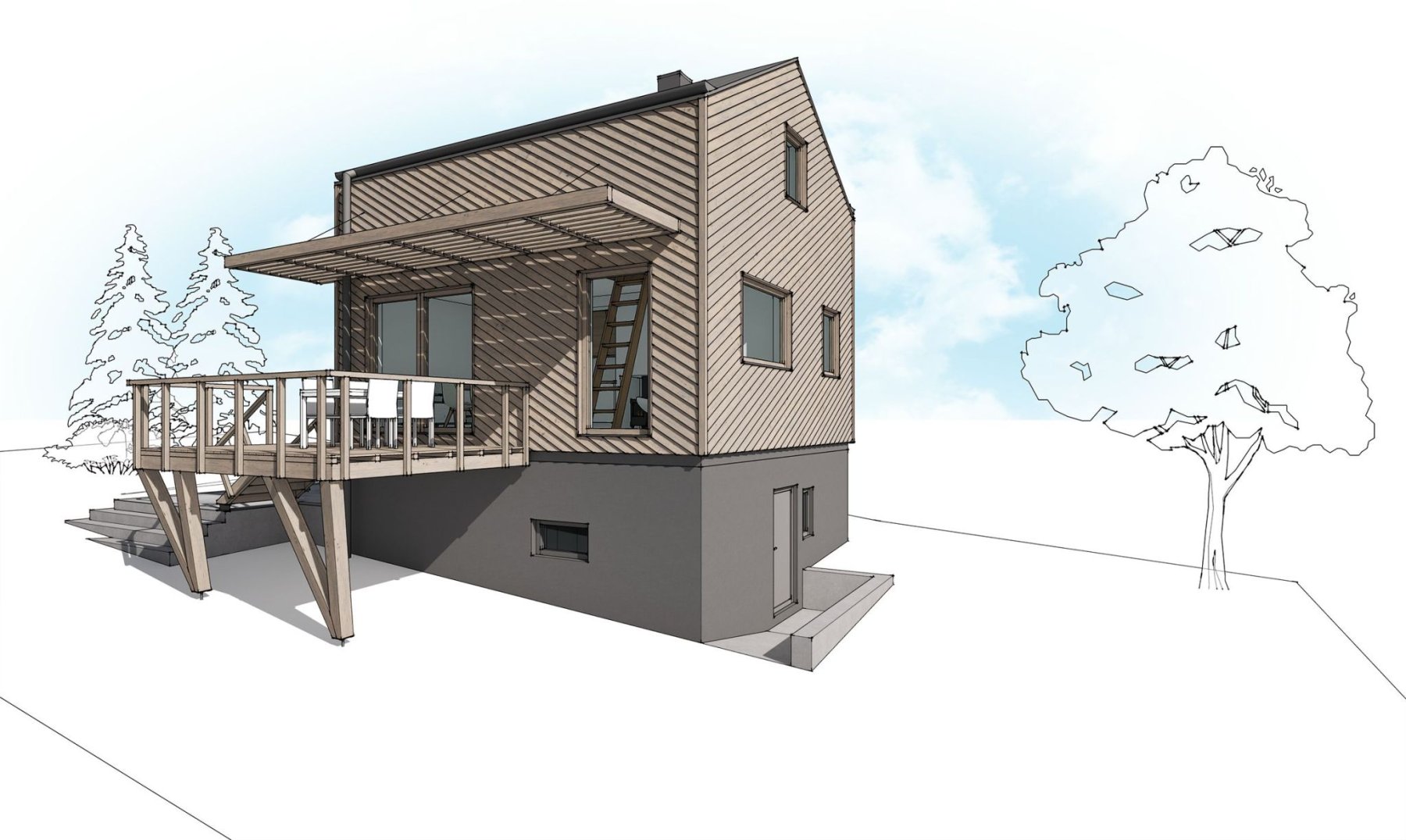 S ohledem na velikost chaty musel být návrh interiéru řešen velmi prakticky. Polozapuštěný suterén poskytuje dost místa pro funkční prostory jako je sklep, sklad nebo dřevník. Zároveň je zde umístěna relaxační místnost se saunou.
