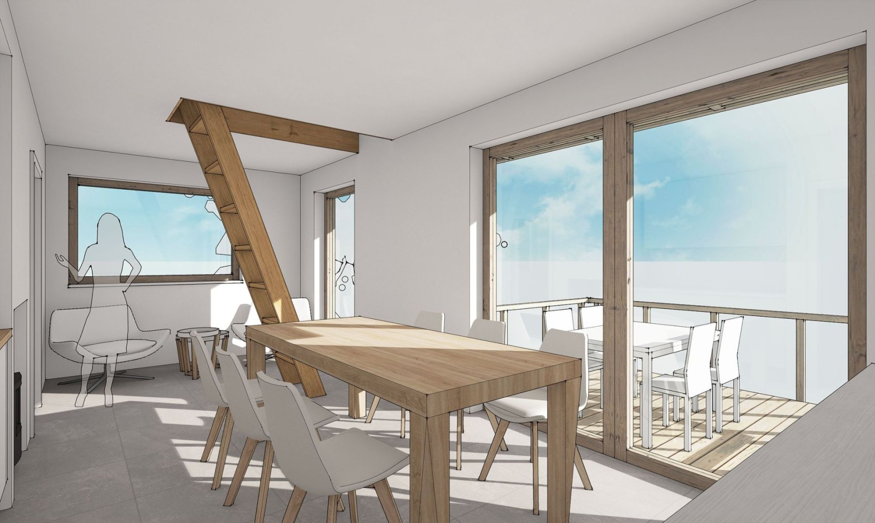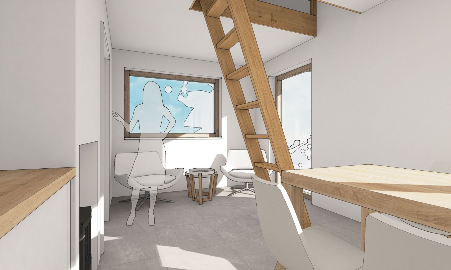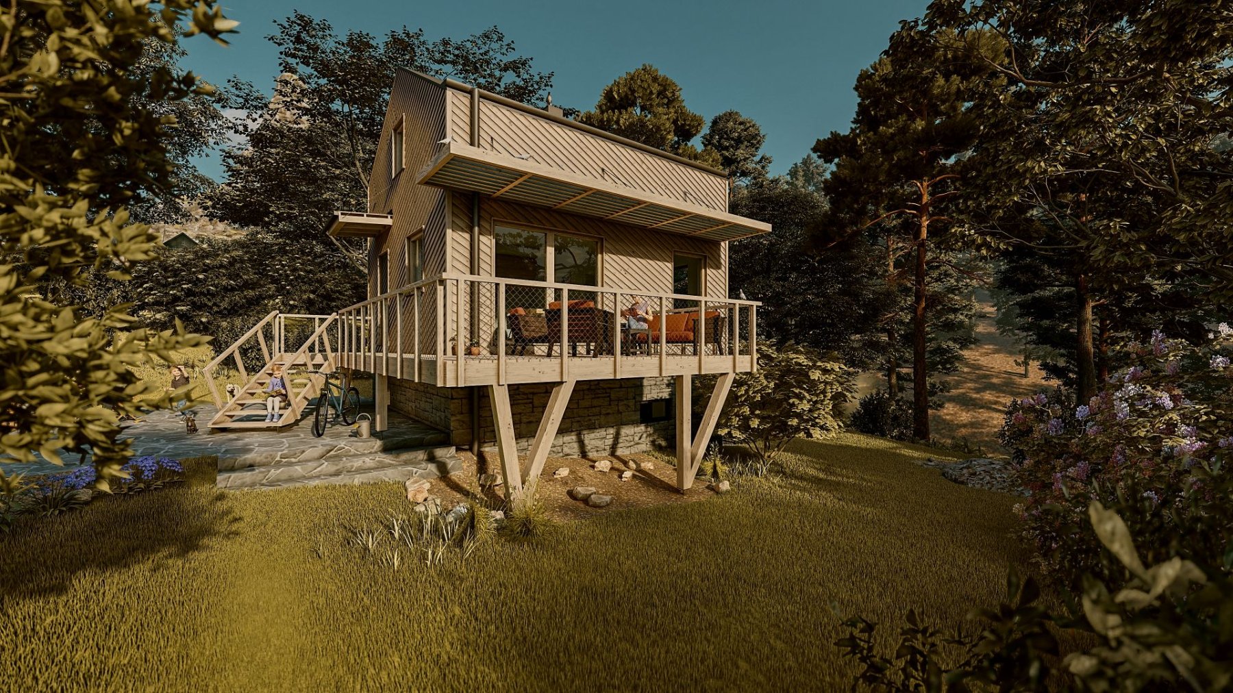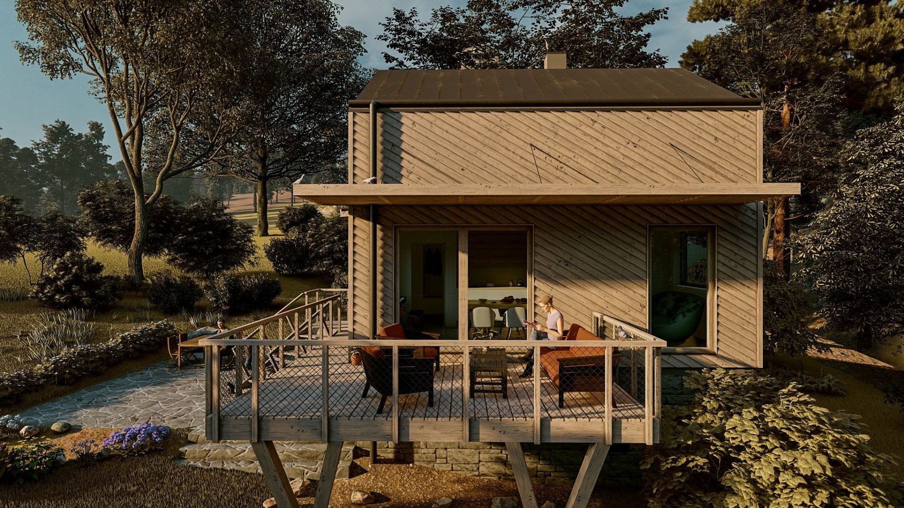 Obytné prostory se nachází ve zvýšeném přízemí a podkroví. Obývací pokoj s kuchyňským koutem, jídelnou a obývací částí nabízí krásný výhled do krajiny skrz velkou prosklenou stěnu. Ta v létě umožňuje prostor otevřít a propojit s terasou. Je tak další místností chaty.