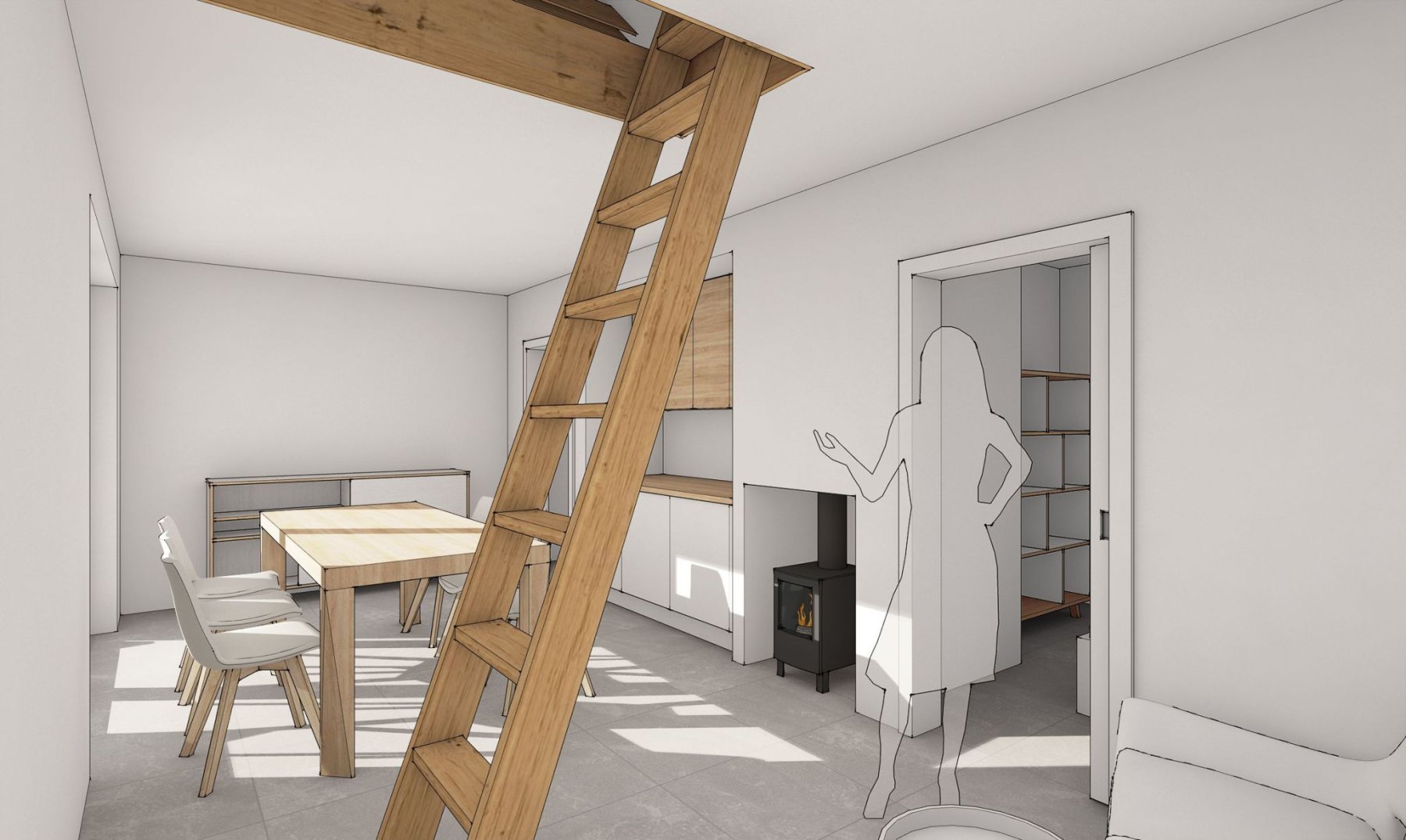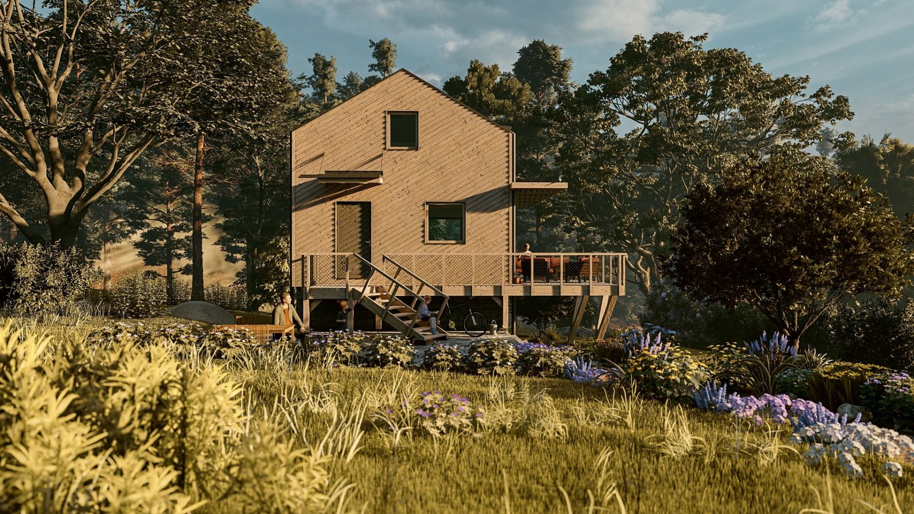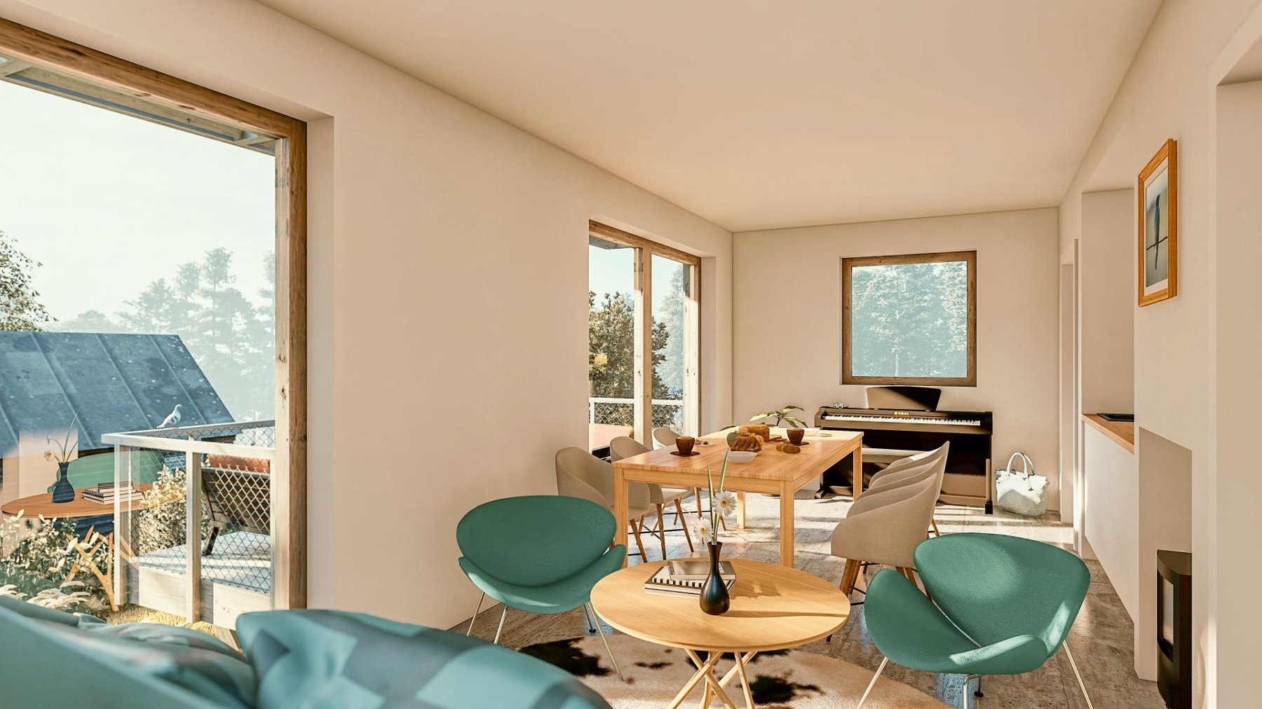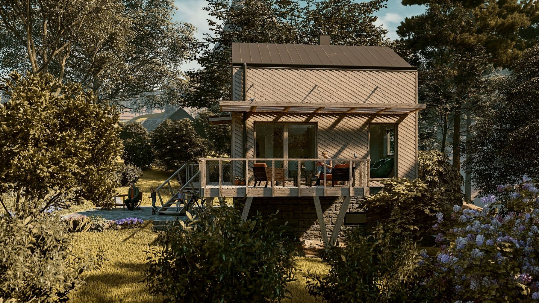 Obytné prostory se nachází ve zvýšeném přízemí a podkroví. Obývací pokoj s kuchyňským koutem, jídelnou a obývací částí nabízí krásný výhled do krajiny skrz velkou prosklenou stěnu. Ta v létě umožňuje prostor otevřít a propojit s terasou. Je tak další místností chaty.