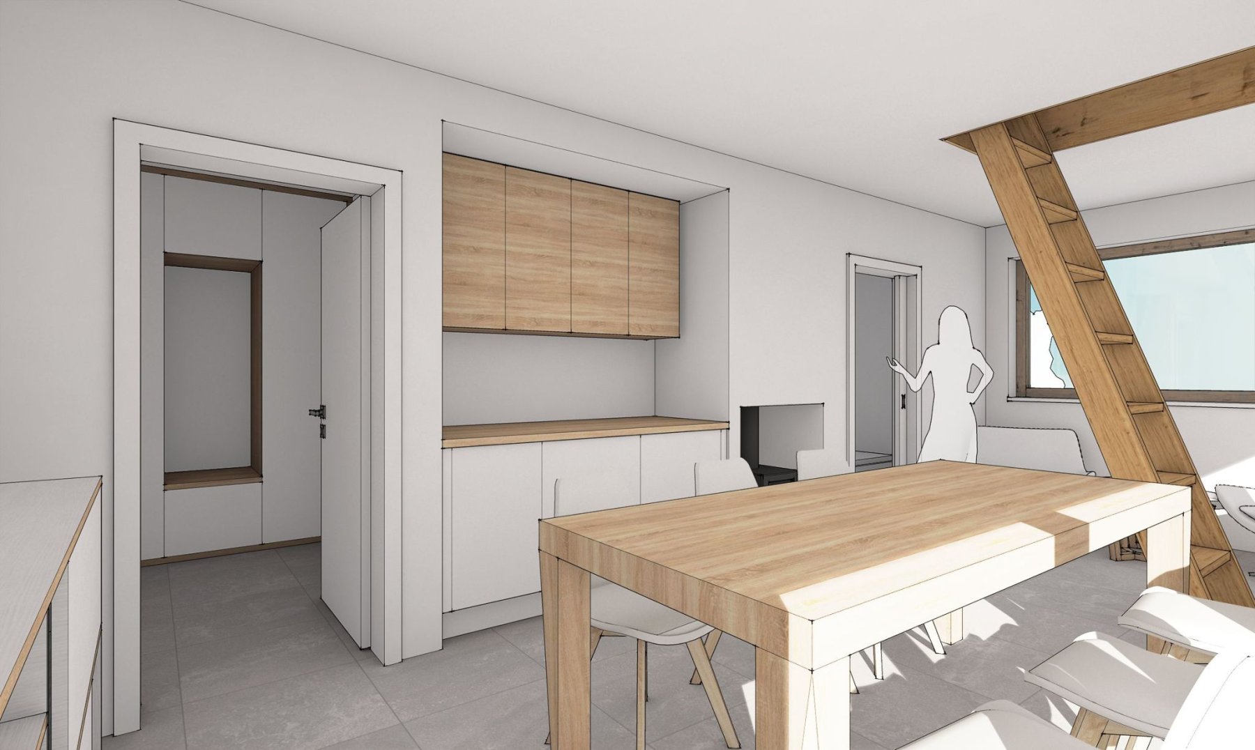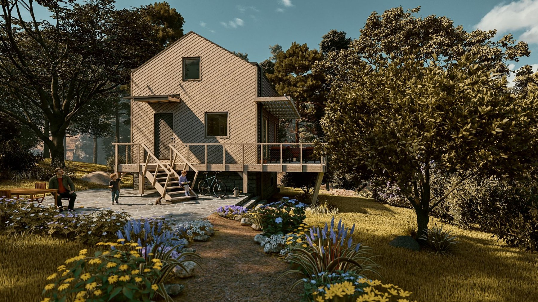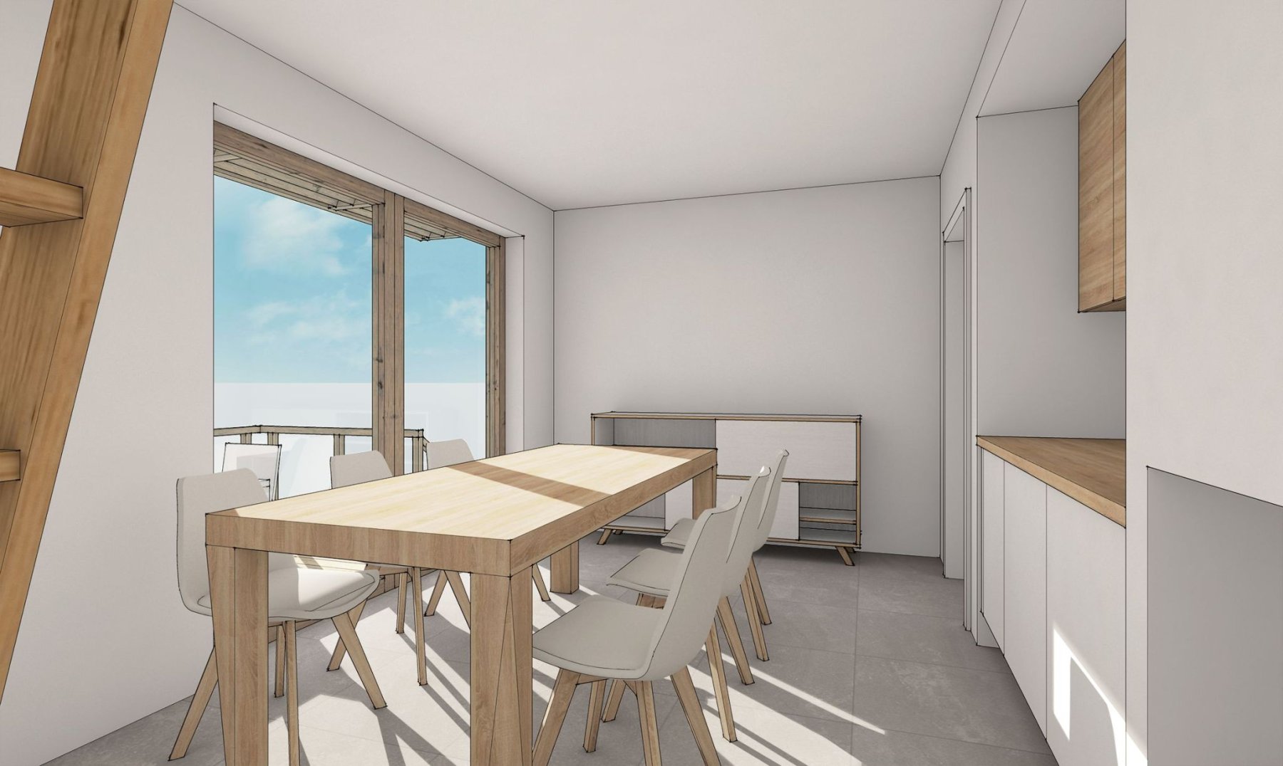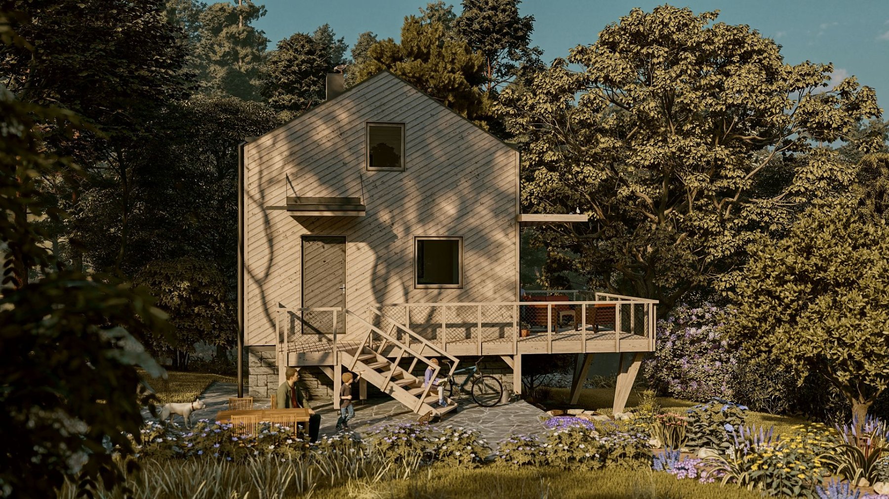Obytné prostory se nachází ve zvýšeném přízemí a podkroví. Obývací pokoj s kuchyňským koutem, jídelnou a obývací částí nabízí krásný výhled do krajiny skrz velkou prosklenou stěnu. Ta v létě umožňuje prostor otevřít a propojit s terasou. Je tak další místností chaty.